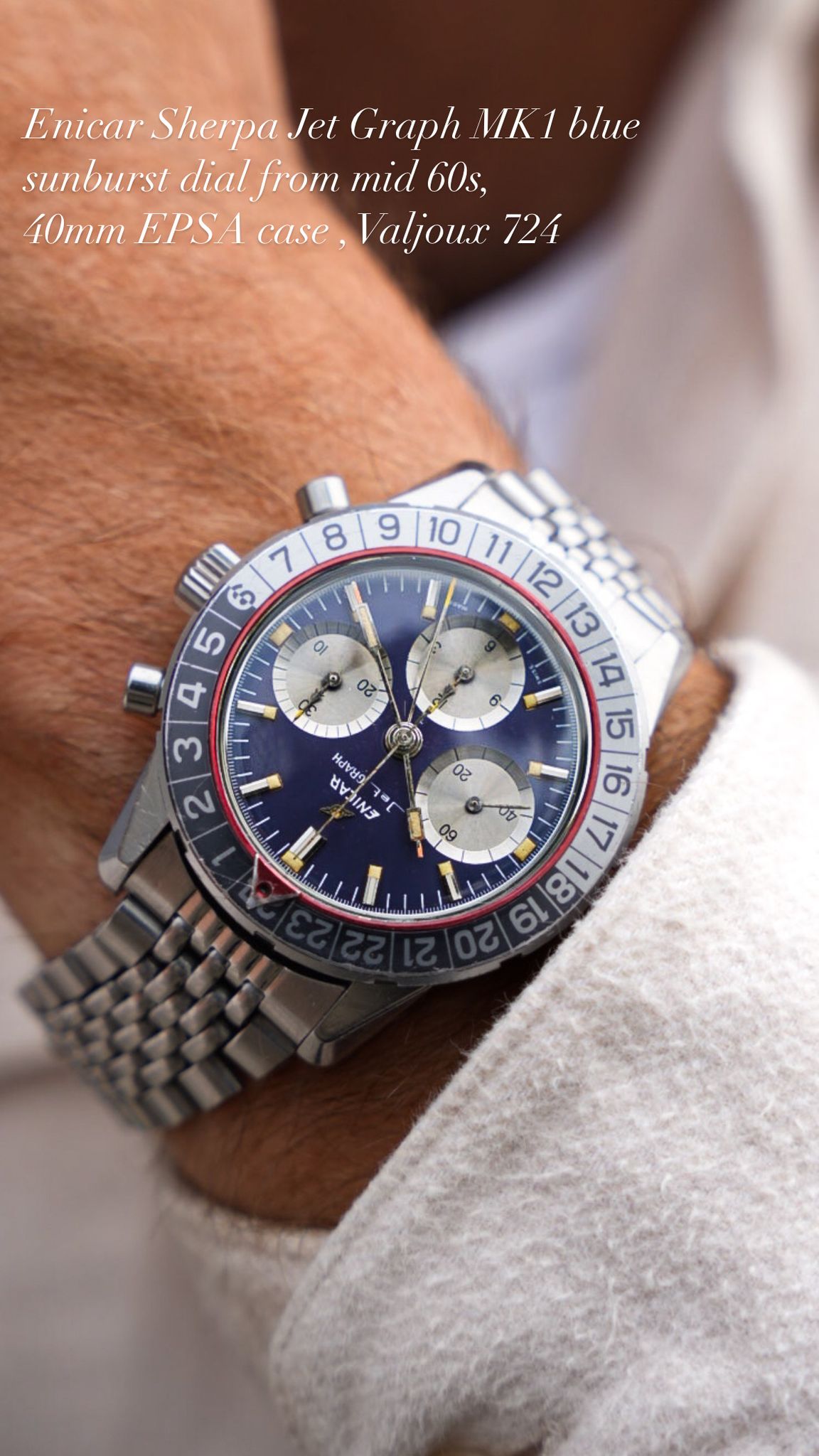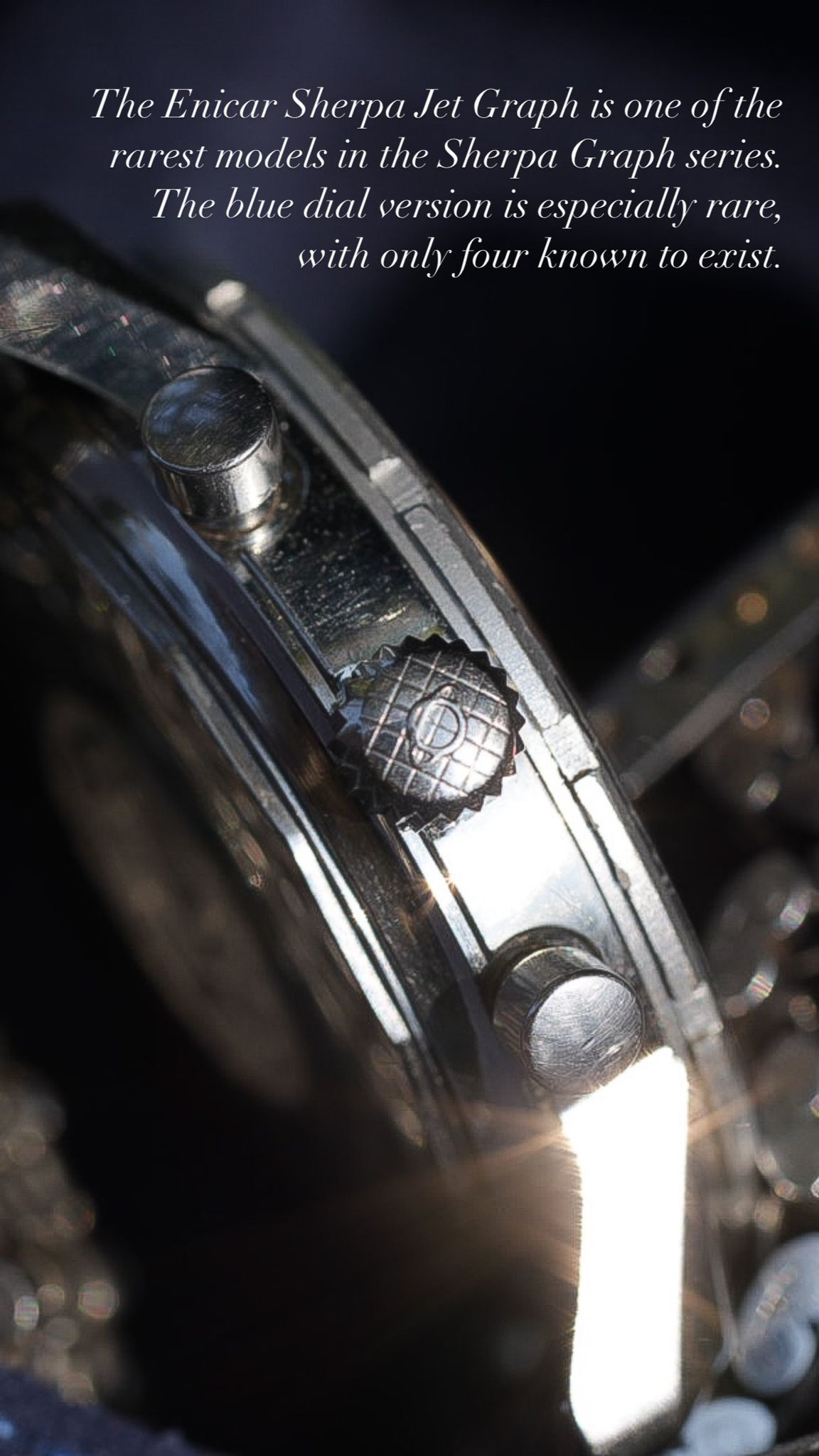 The Enicar Sherpa Jet Graph watch, introduced in 1963, is one of the rarest models in the Sherpa Graph series. Designed for travelers and pilots, it features a GMT hand for tracking two time zones. The blue dial version is especially rare, with only four known to exist.
