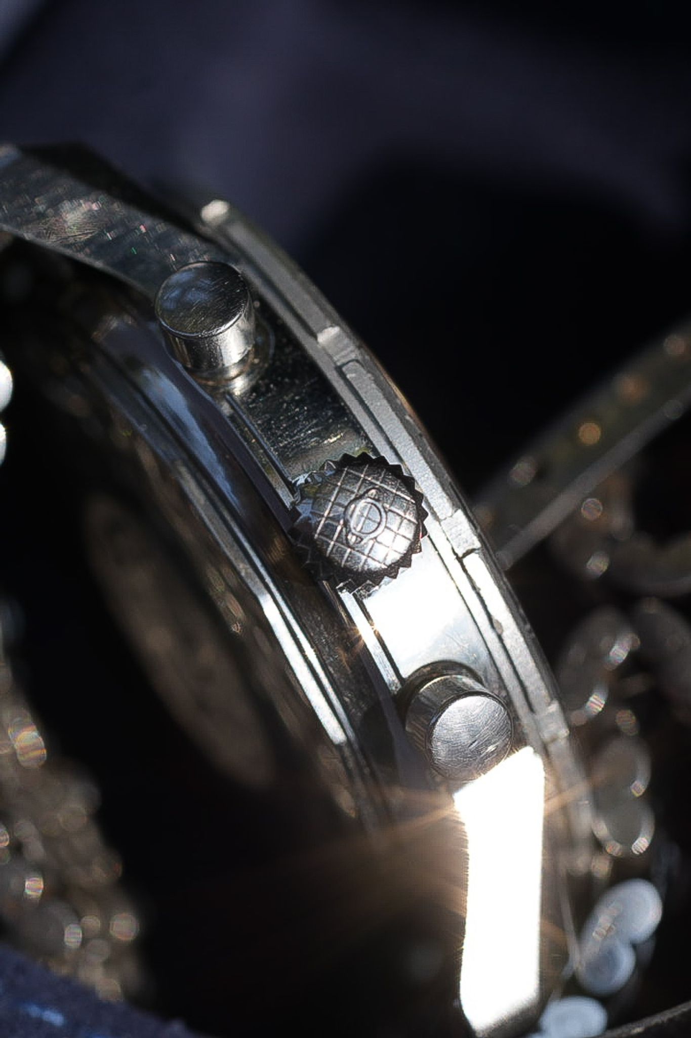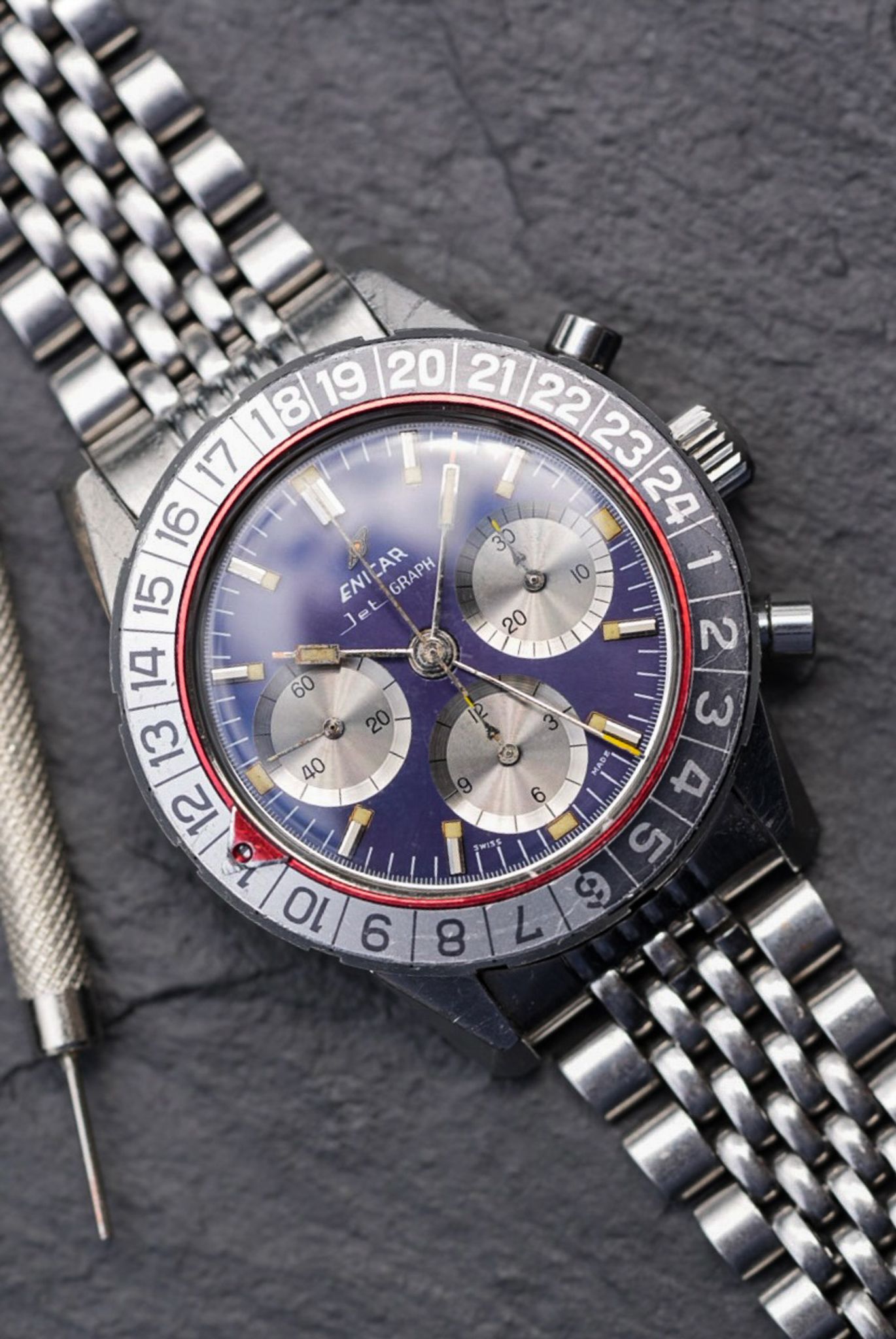 The first owner was a technician on a North Sea oil rig in Germany. Accompanied by a matching Enicar steel bracelet, the watch is elegantly cohesive. Its excellent condition, with original components and a patinated blue-gray bezel, makes it a collector's gem.