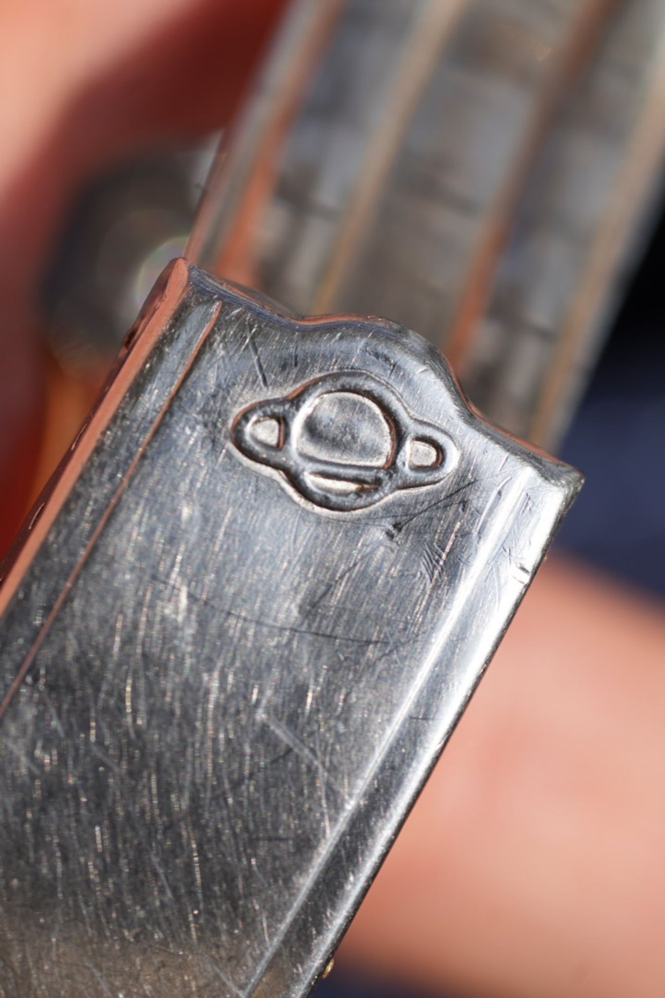 The hour and minute hands are unpainted, paddle-shaped with rectangular tritium and orange tips. The second hand is thin and uncolored, while the sub-dial hands are unpainted and arrow-shaped. The GMT hand is silver with an orange or yellow tip. It runs on the Valjoux 724 movement with a gold finish and GMT complication. The crown has a "waffle" compressor design with the Enicar Saturn logo.