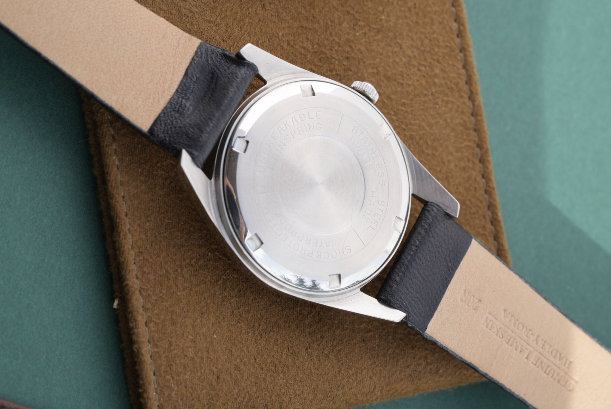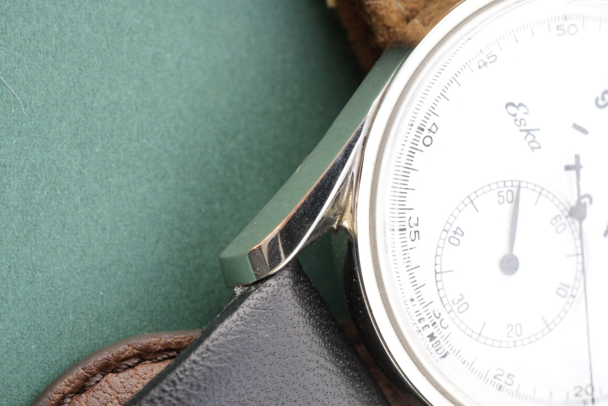 Eska Regulator from the 1960s featuring a manual-winding movement. Stainless steel 36 mm case with lyre lugs, white dial with two registers displaying the hours at 12 o’clock and the small seconds at 6 o’clock, black Arabic numerals and peripheral railroad minute track, in near mint condition.