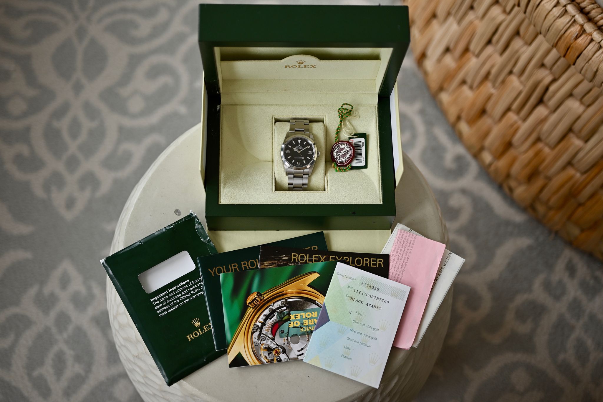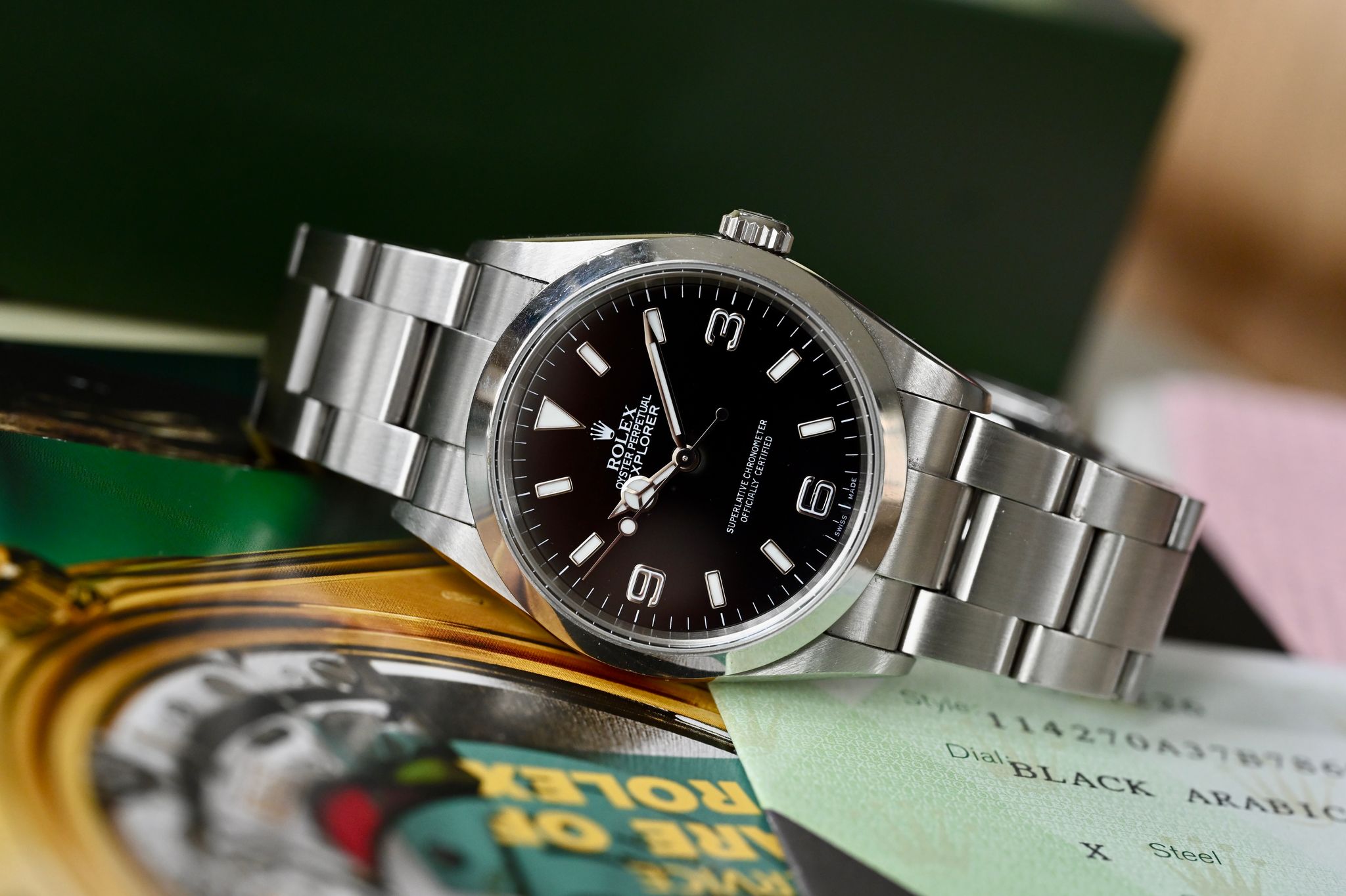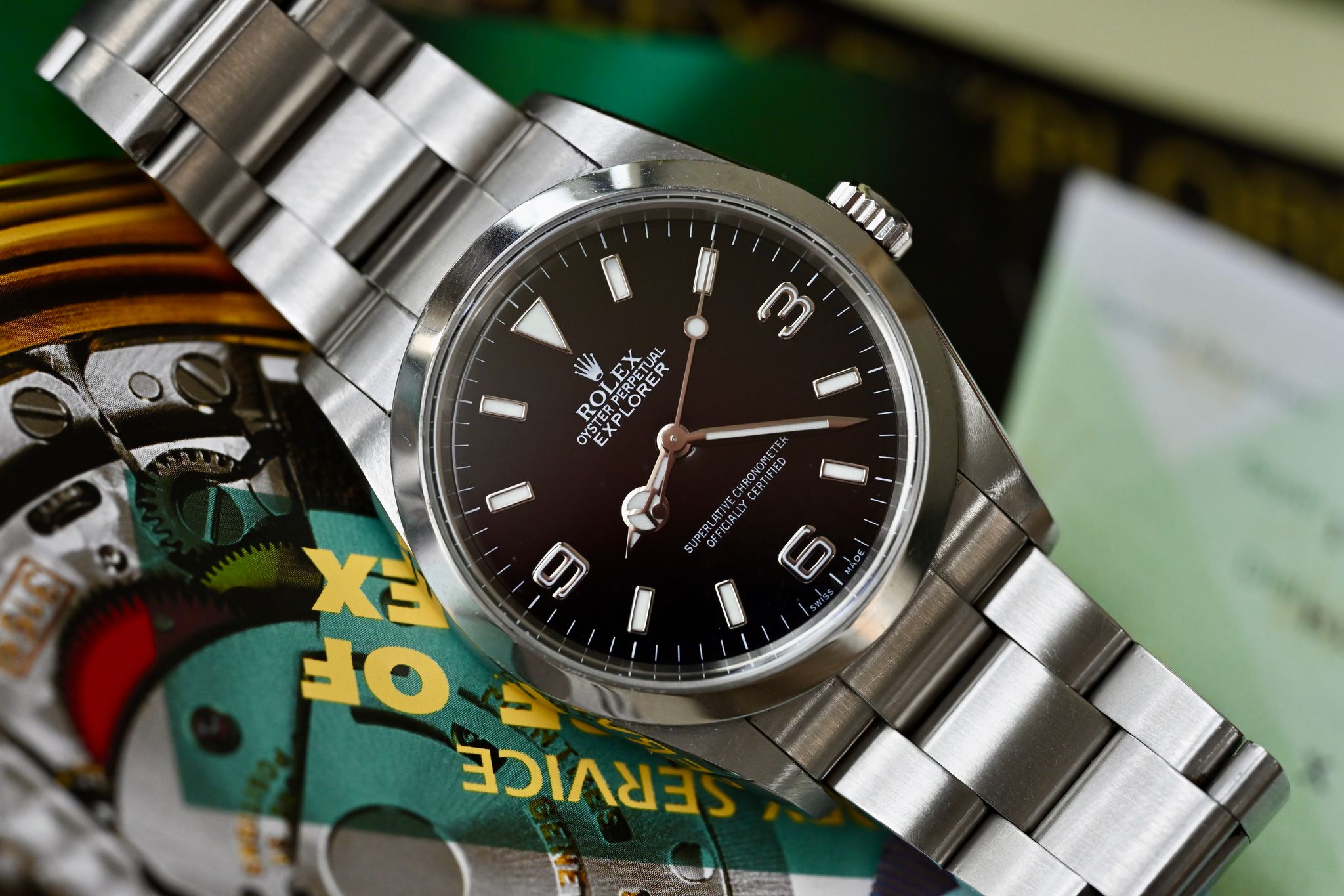 A classic Explorer ref. 114270 dating to 2005. This watch was meticulously cared for and remains in sharp unpolished condition with a true full set down to the original hangtags and receipt! This model wears incredibly well at 36mm with a robust no holes case and oyster bracelet with flip lock clasp. These are an excellent value, in fact this watch is being offered below original when adjusted for inflation!