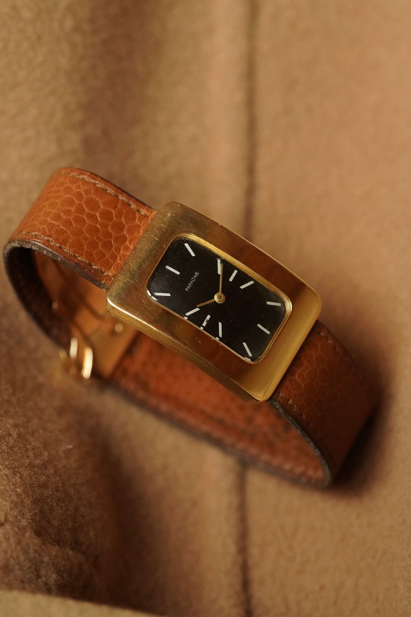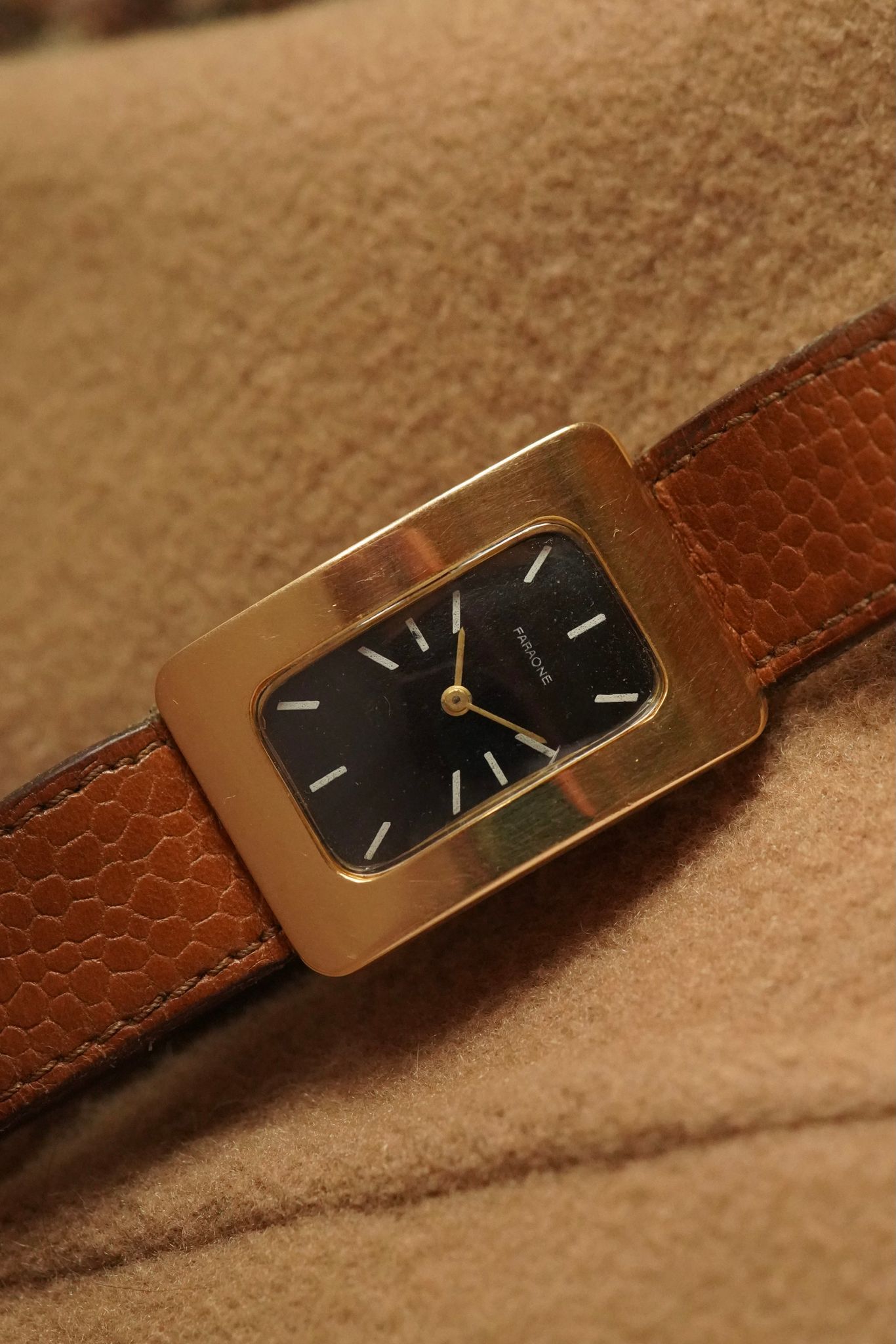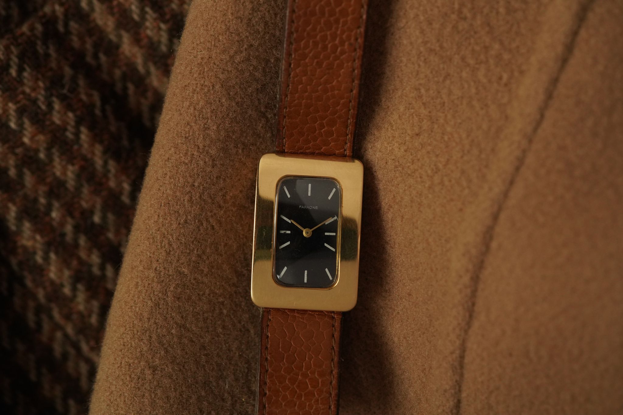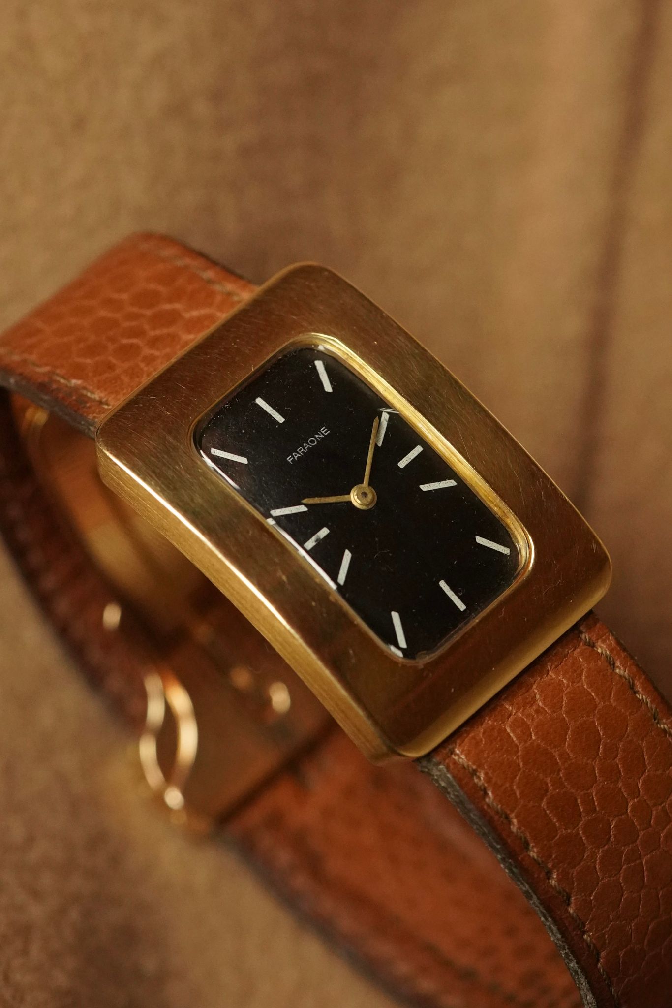 Faraone was a historical jewellery shop founded in Florence on the Ponte Vecchio that later expanded to Milan and sold some of the most exceptional pieces of jewellery ever crafted. In the 1980s they experimented with a small line of watches including this unseen before large (24x33mm) 18k yellow gold cintrèe style watch.