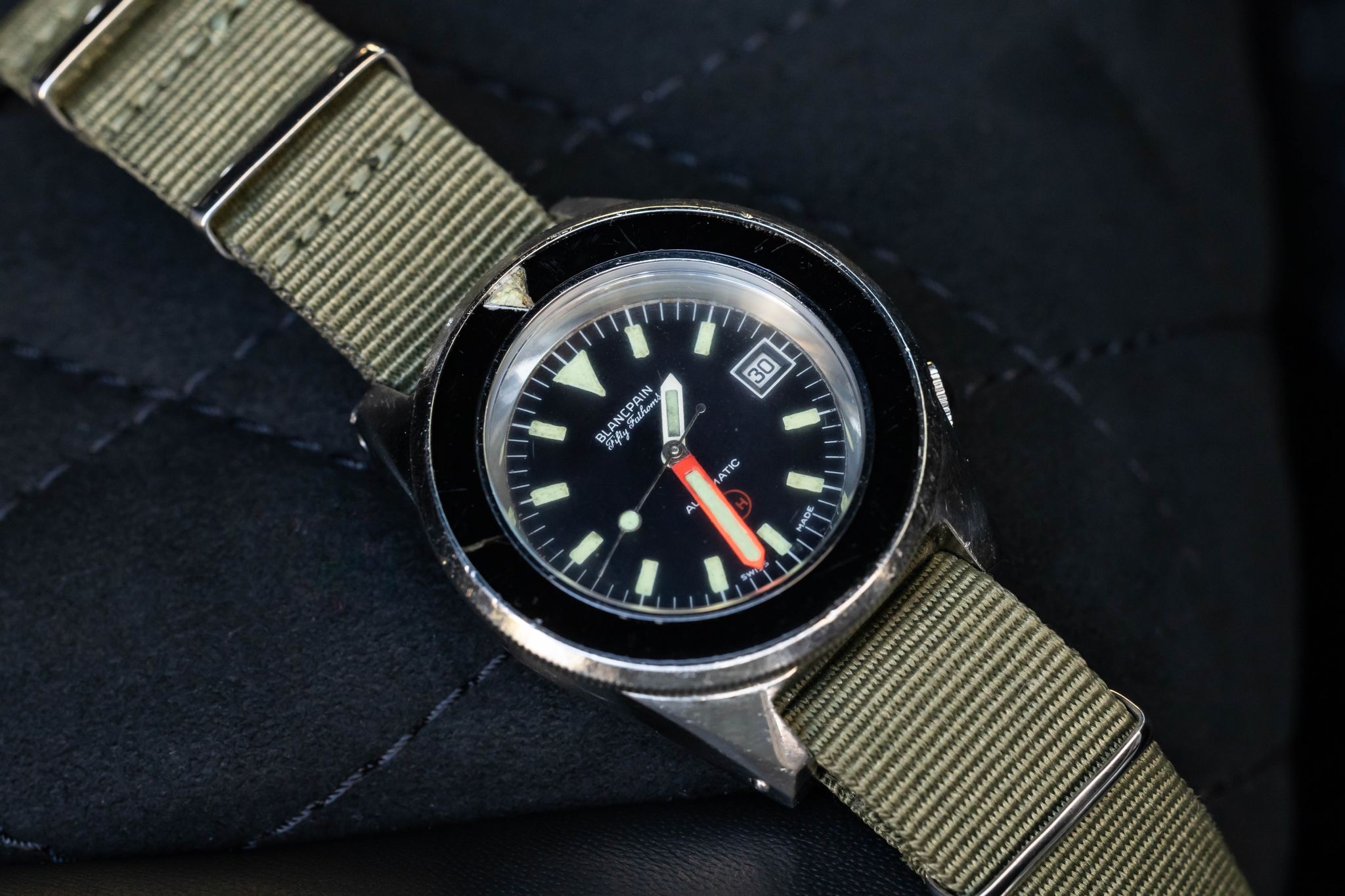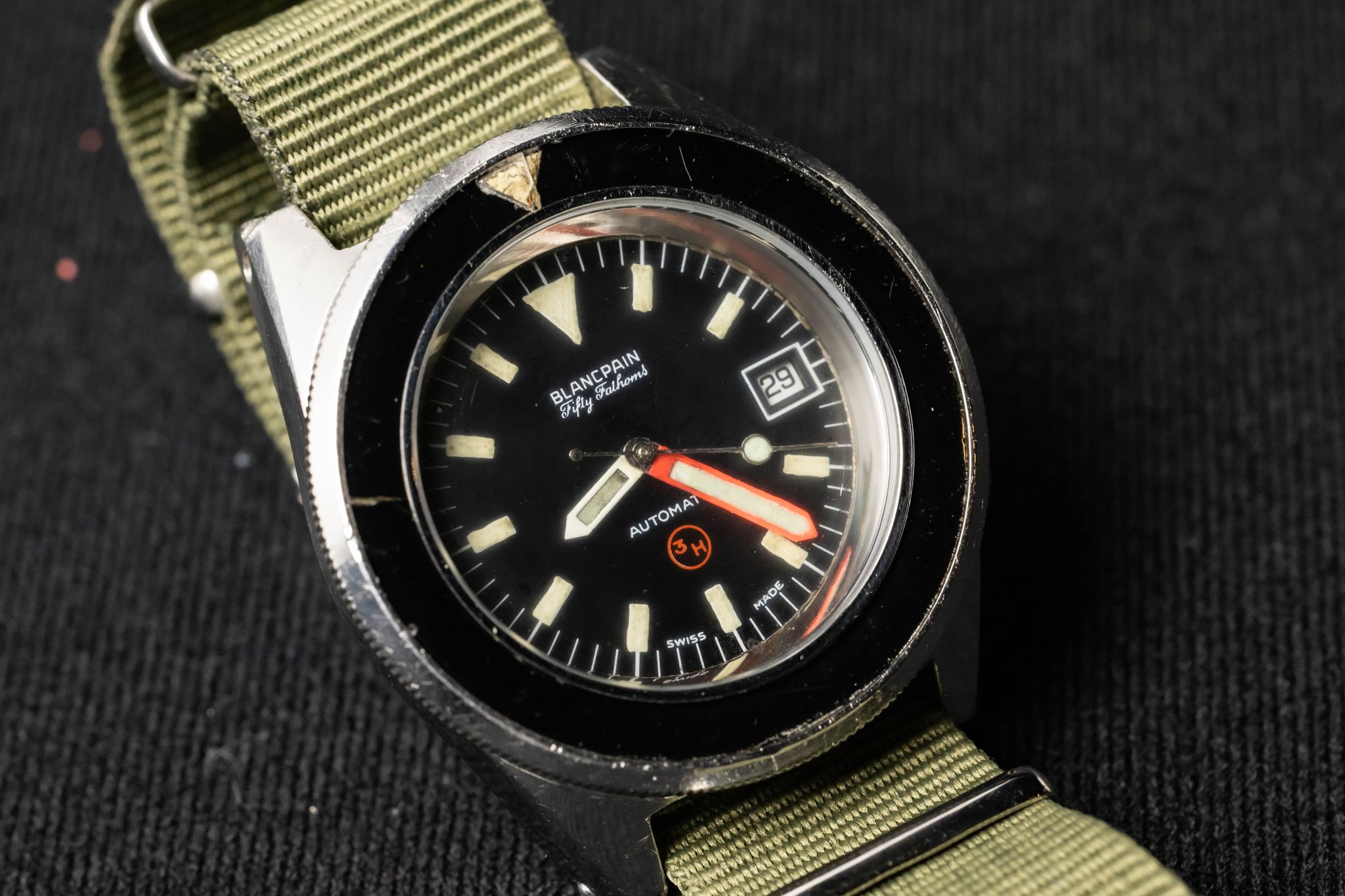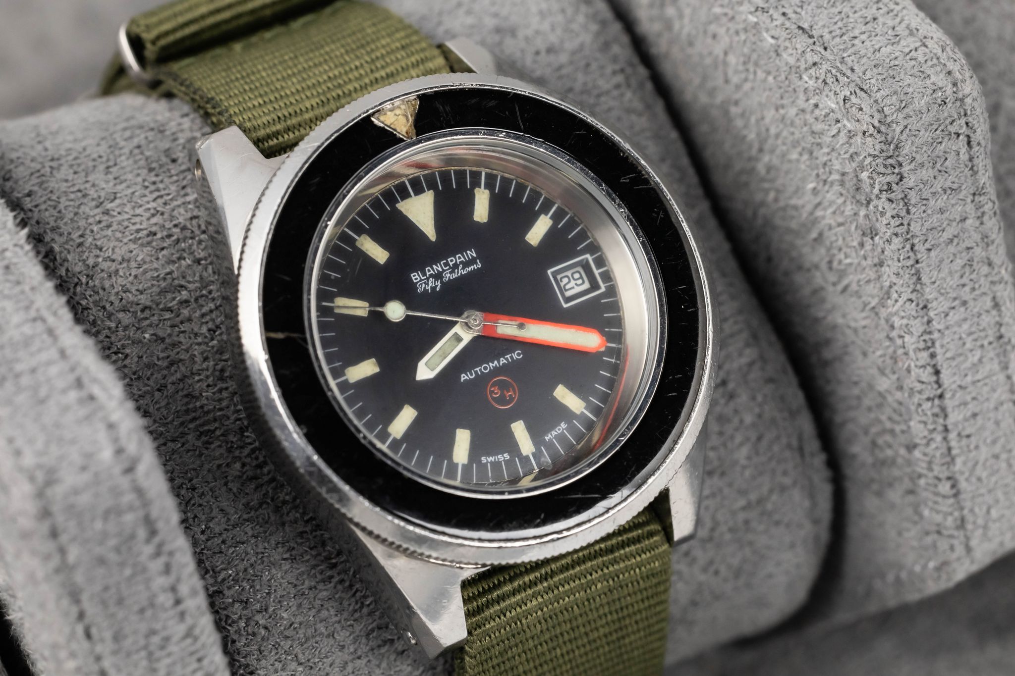 For sale is a rare and remarkable piece of dive watch history: the Blancpain Fifty Fathoms “BUND”, crafted specifically for German Bundeswehr frogmen in the 1970s. Unlike standard Fifty Fathoms models, these watches were strictly issued for military use and were never available for public sale. What sets this model apart is its unique bezel design. The Bundeswehr divers used rebreathers, eliminating the need for the traditional graduated dive bezel seen on watches like the Rolex Submariner. Instead, this bezel is minimalist, featuring a plain insert without numerals or minute markers.