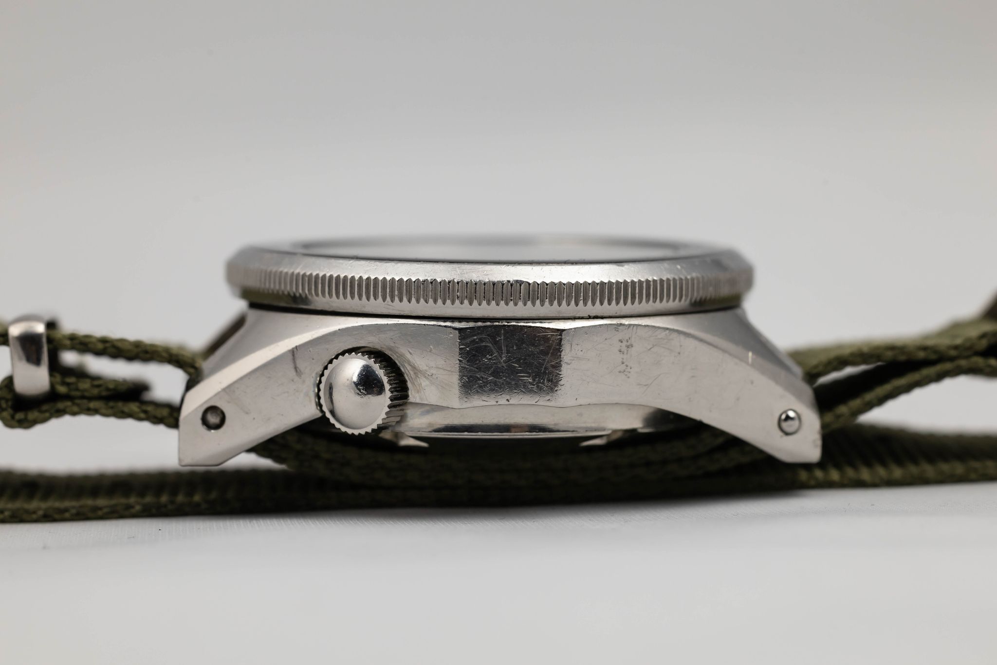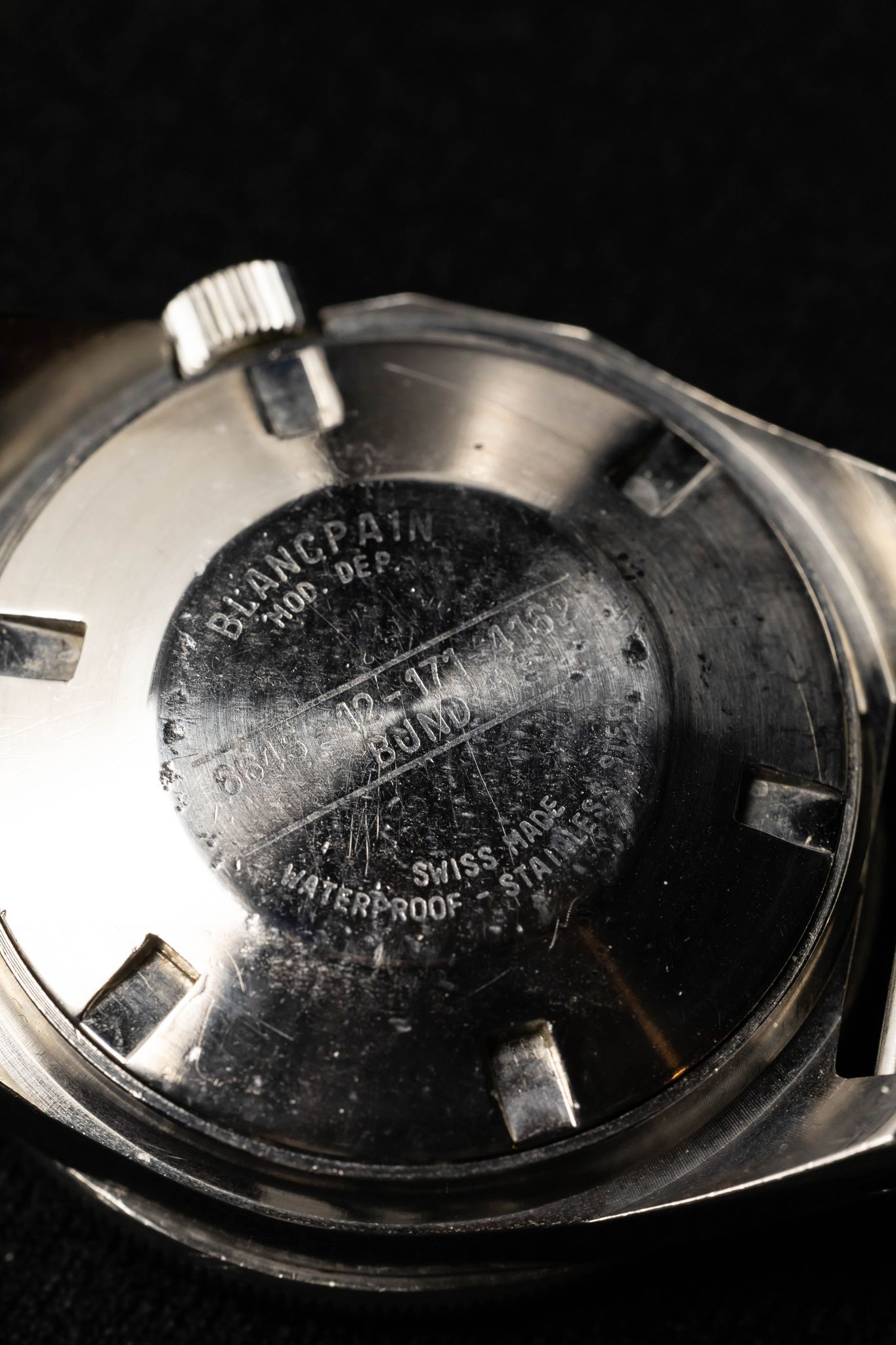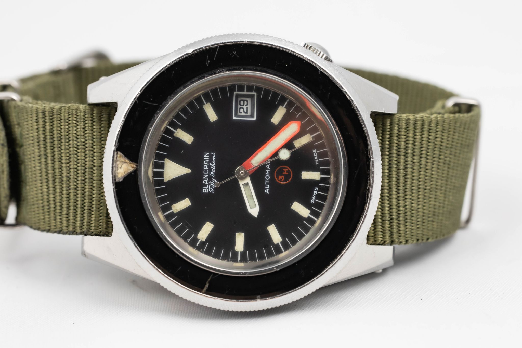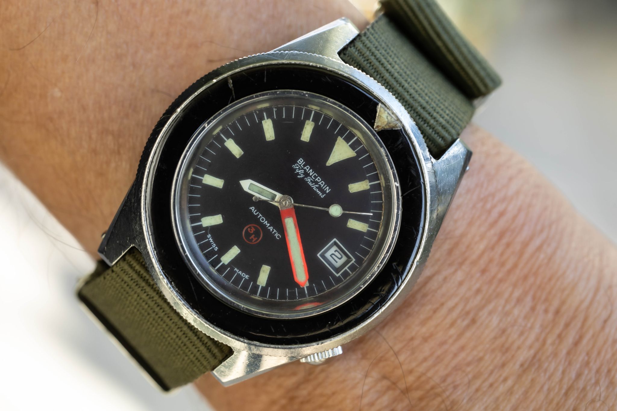 For sale is a rare and remarkable piece of dive watch history: the Blancpain Fifty Fathoms “BUND”, crafted specifically for German Bundeswehr frogmen in the 1970s. Unlike standard Fifty Fathoms models, these watches were strictly issued for military use and were never available for public sale. What sets this model apart is its unique bezel design. The Bundeswehr divers used rebreathers, eliminating the need for the traditional graduated dive bezel seen on watches like the Rolex Submariner. Instead, this bezel is minimalist, featuring a plain insert without numerals or minute markers.