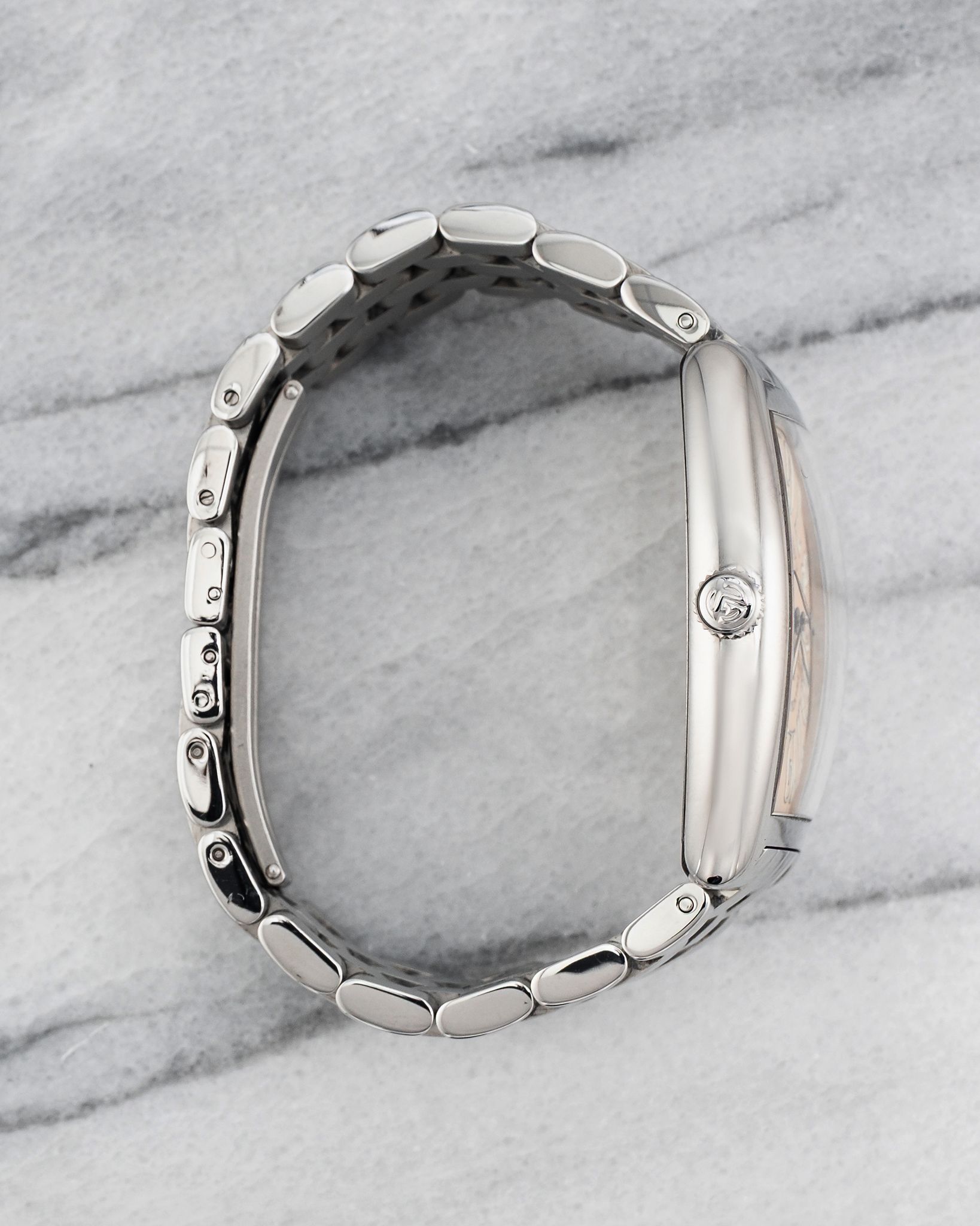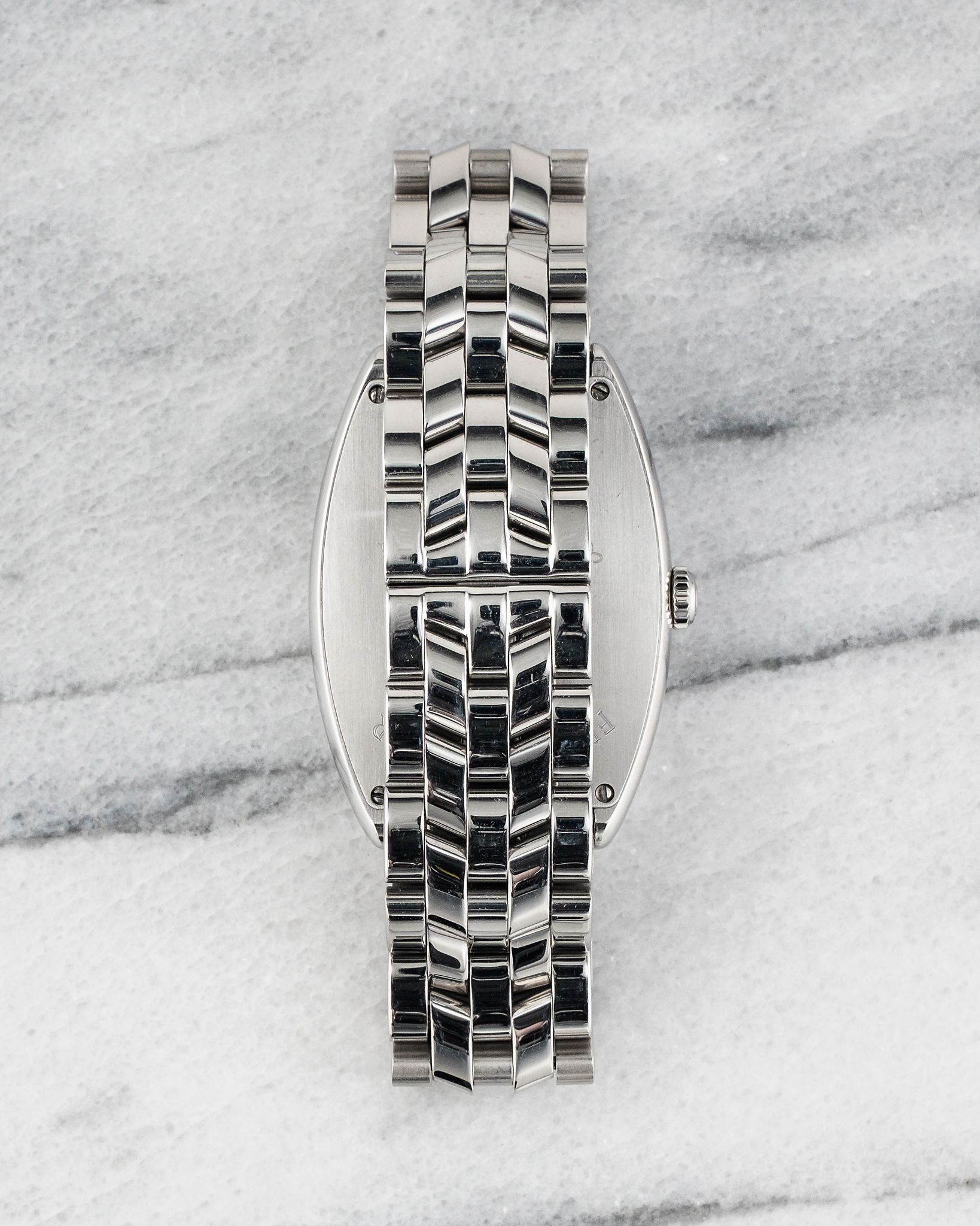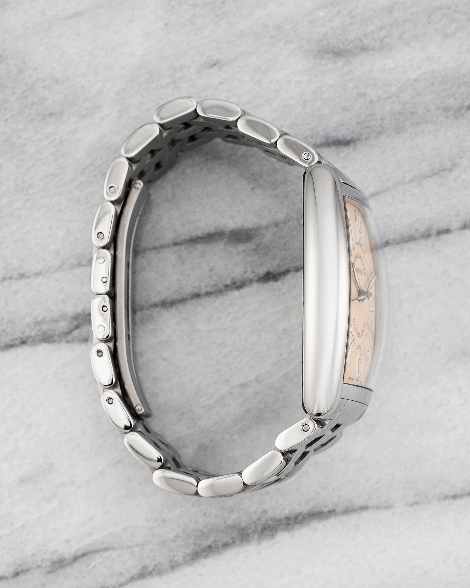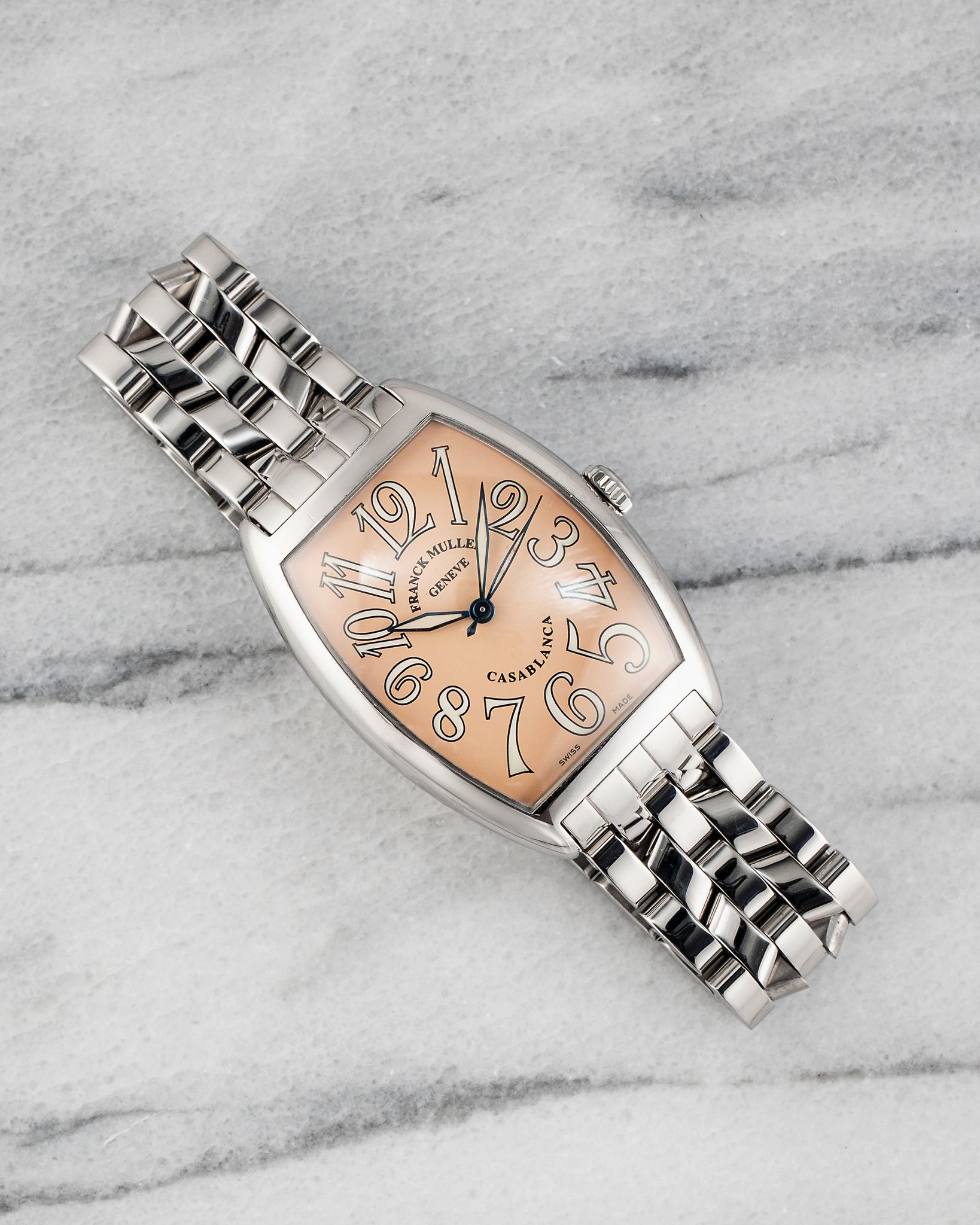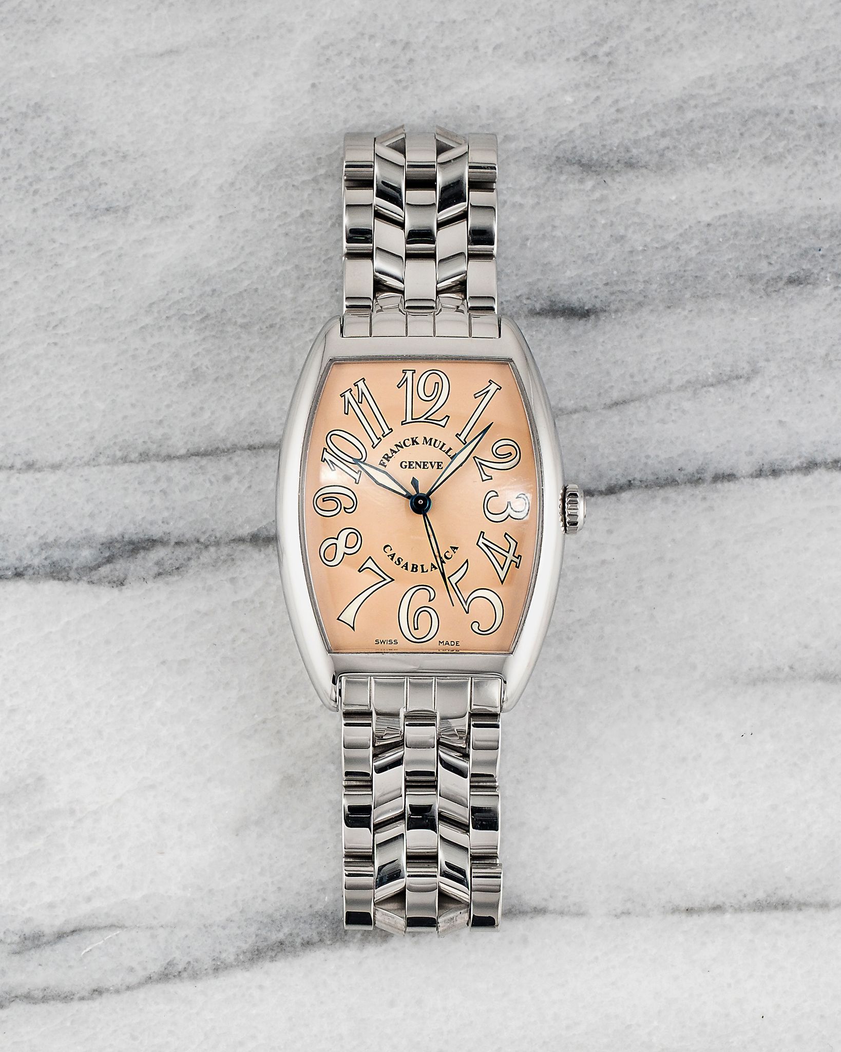 Here's a vintage Franck Muller Casablanca reference 2852 automatic with a salmon Arabic numeral dial on a steel bracelet from the 1990s. Keeps great time and is fully functional. Measurements include a 32x45mm steel case. It's on a Franck Muller bracelet that fits up to a 6.75 inch wrist. Salmon dial with bold Arabic numerals and blued hands. Steel case and caseback. All parts are original including the signed Franck Muller crown, dial, movement, and caseback. Both the dial and case are in great cosmetic, untouched condition.