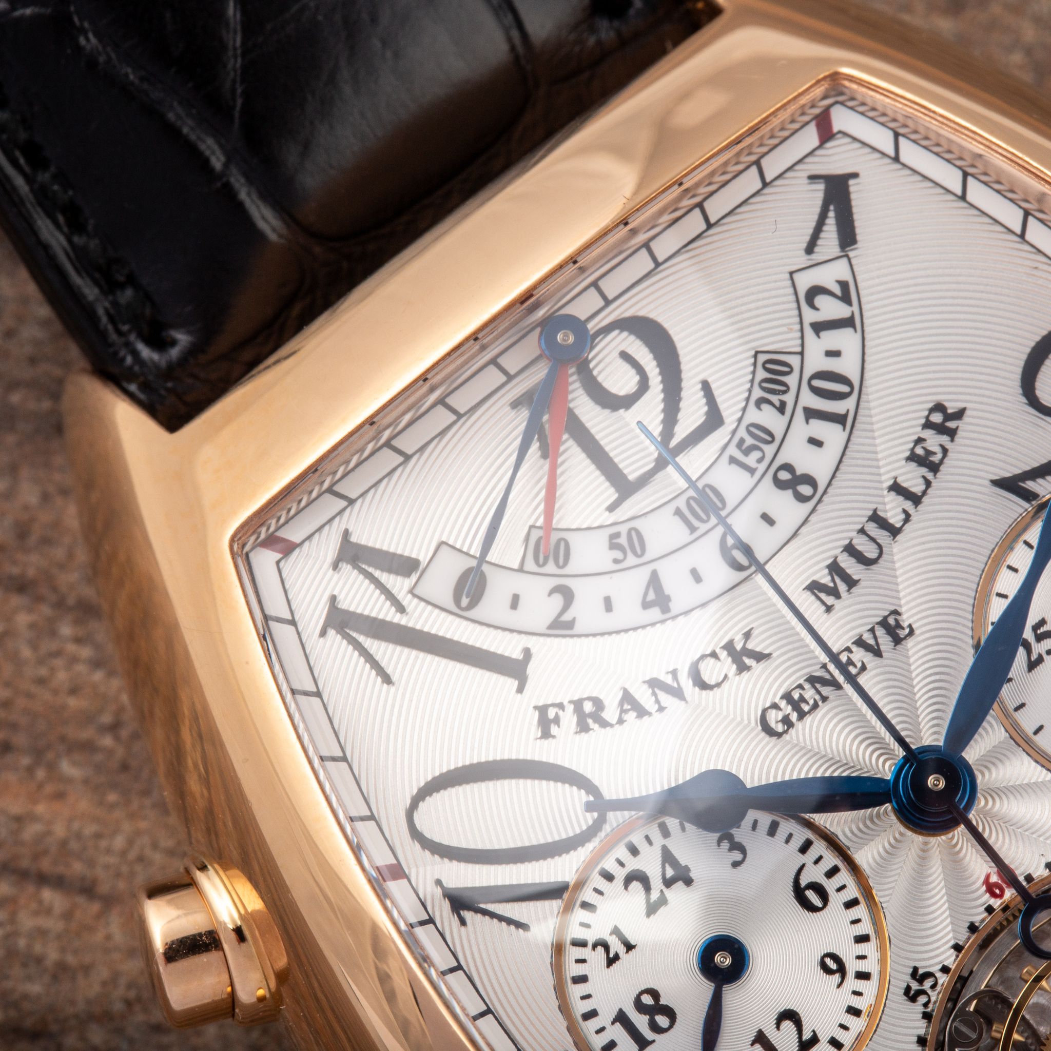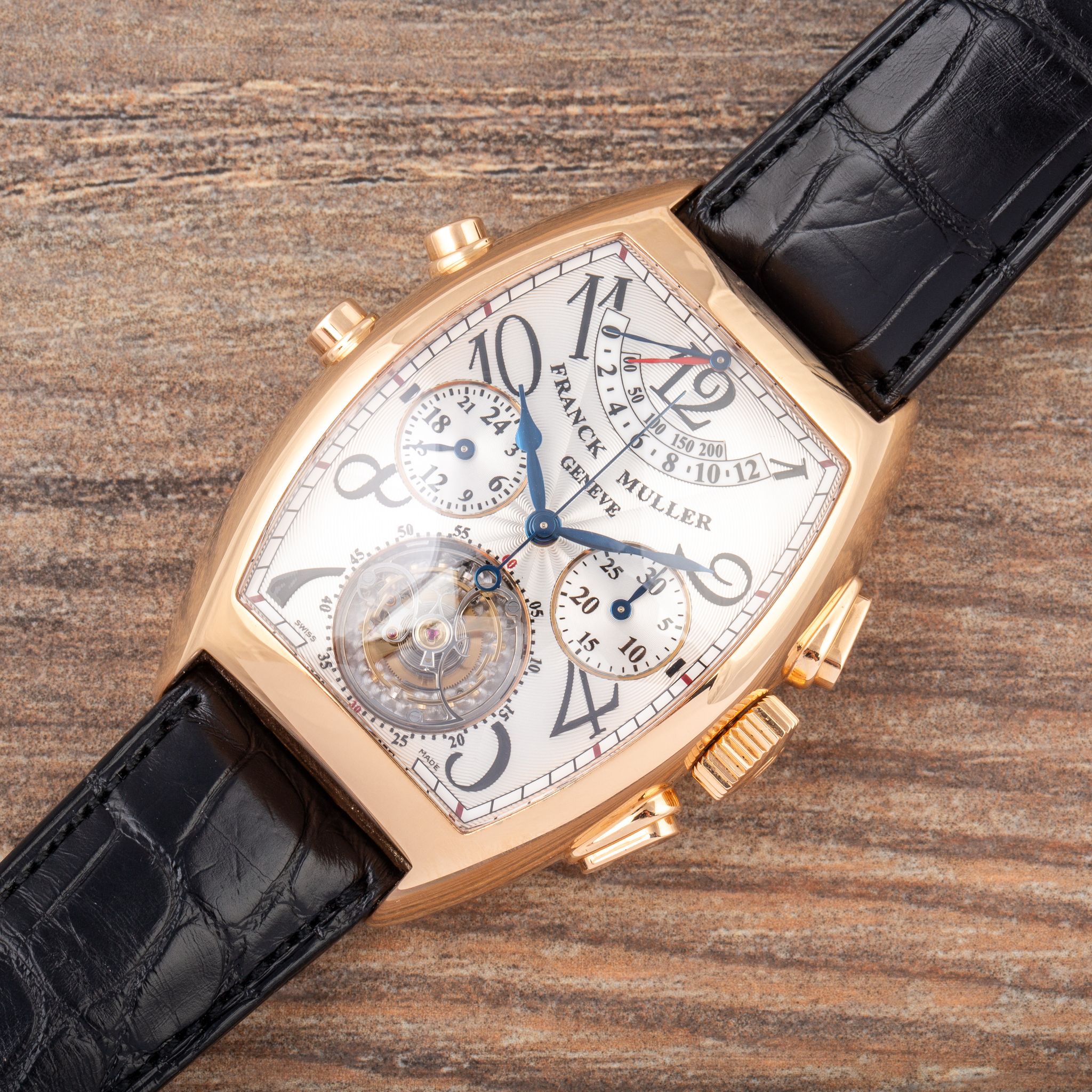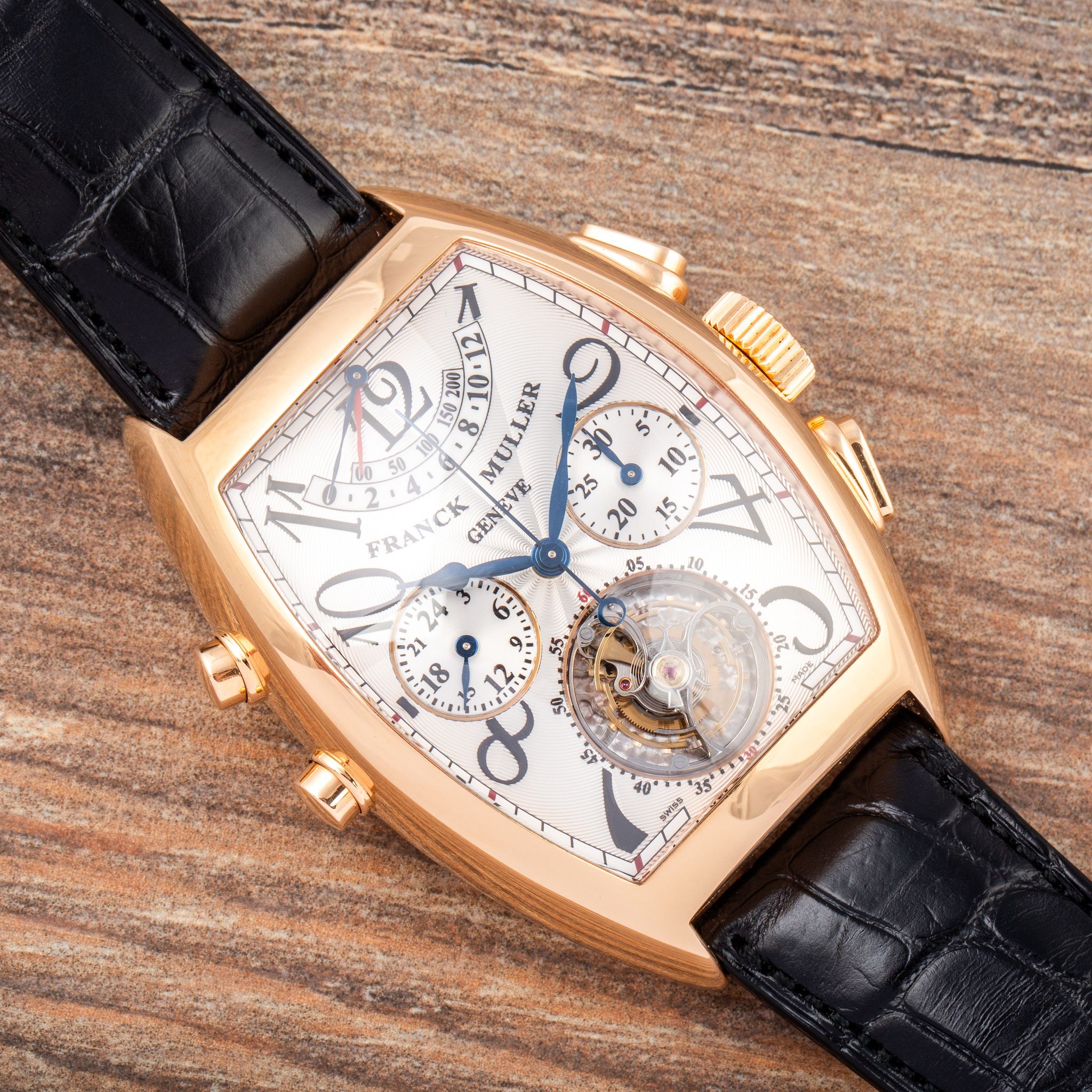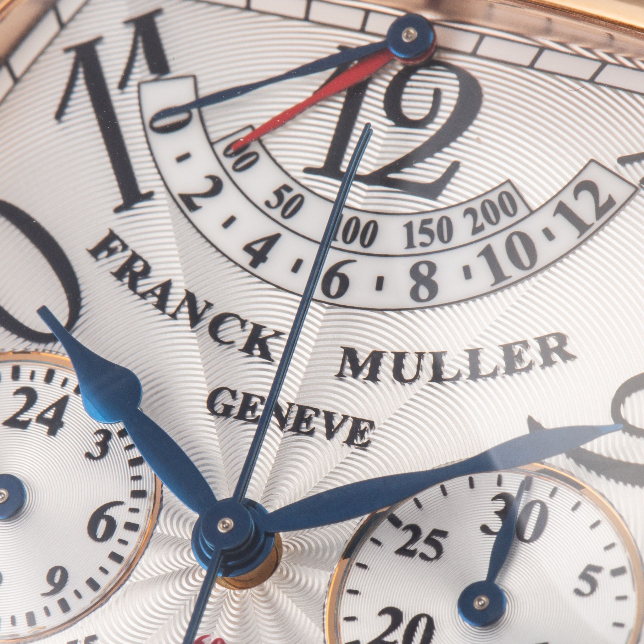 The watch comes in a 42 x 49 mm rose gold Cintrée Curvex case, a signature shape of the brand. The dial is silvered guilloché, hand-finished, and features bold Arabic numerals in Franck Muller’s instantly recognizable style.