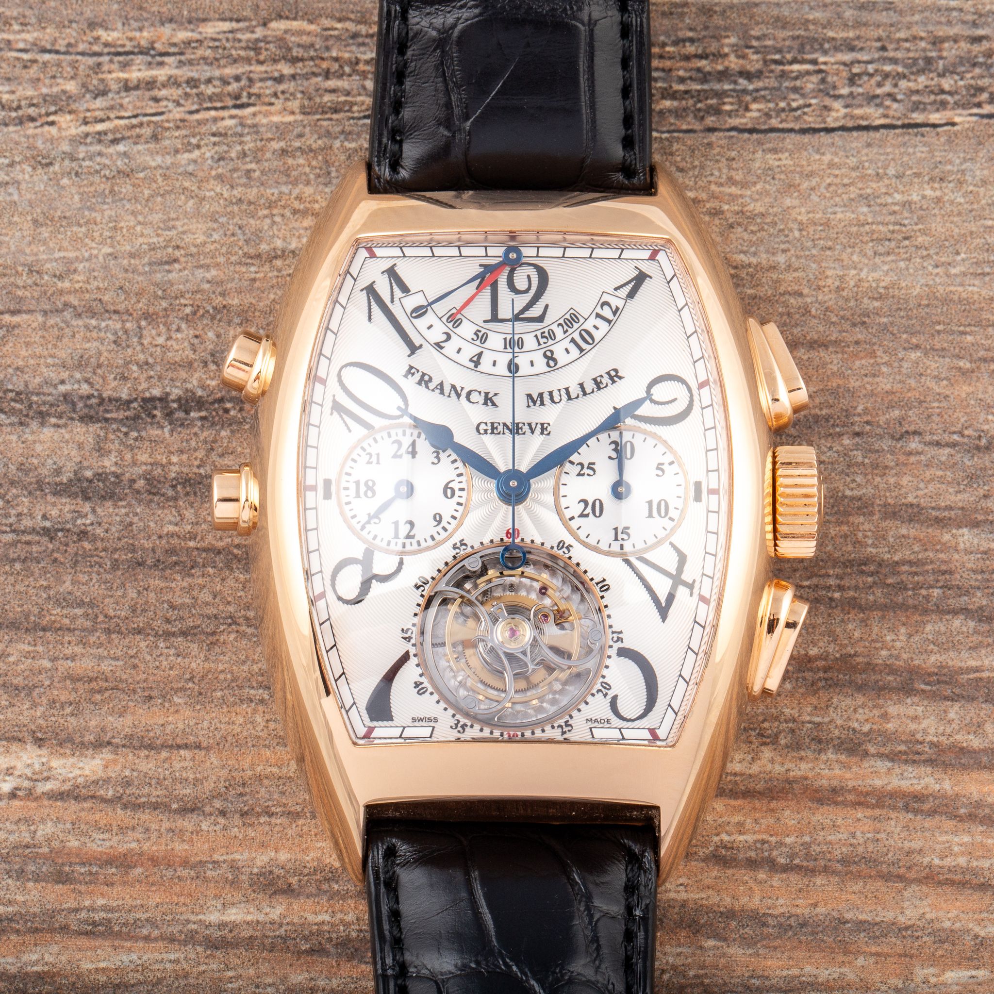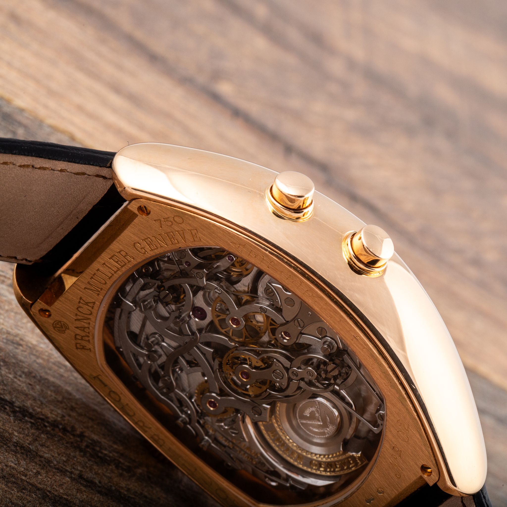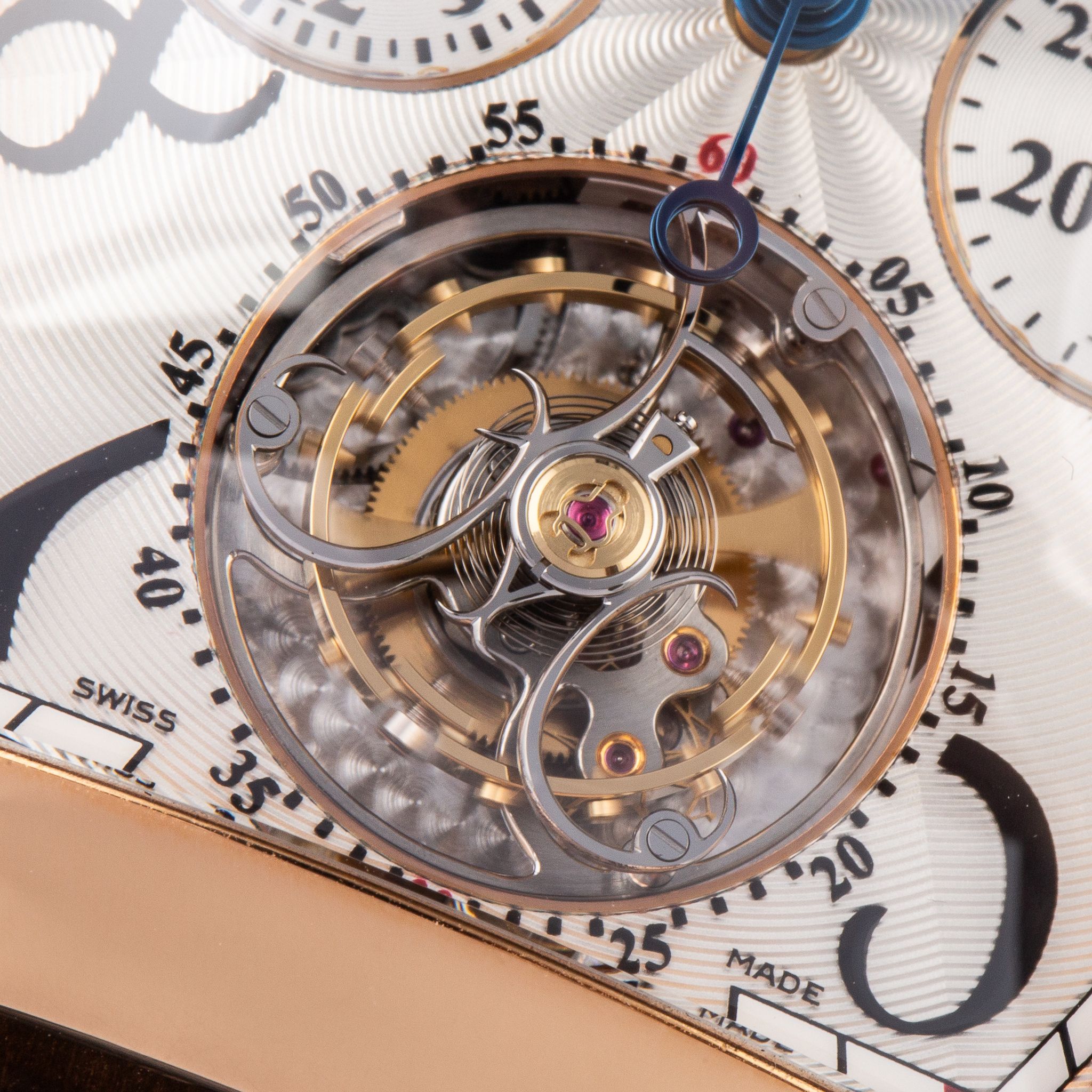 The watch comes in a 42 x 49 mm rose gold Cintrée Curvex case, a signature shape of the brand. The dial is silvered guilloché, hand-finished, and features bold Arabic numerals in Franck Muller’s instantly recognizable style.