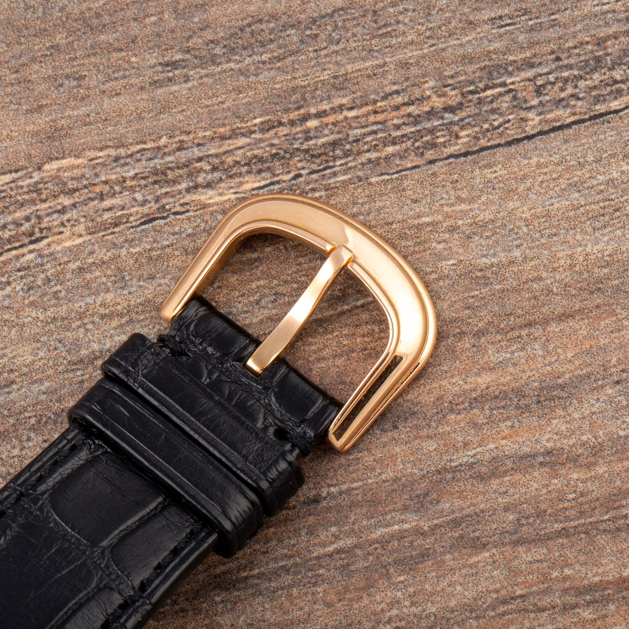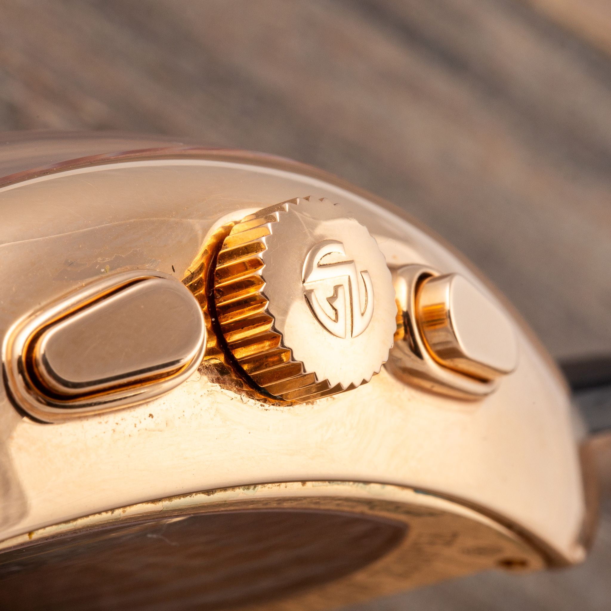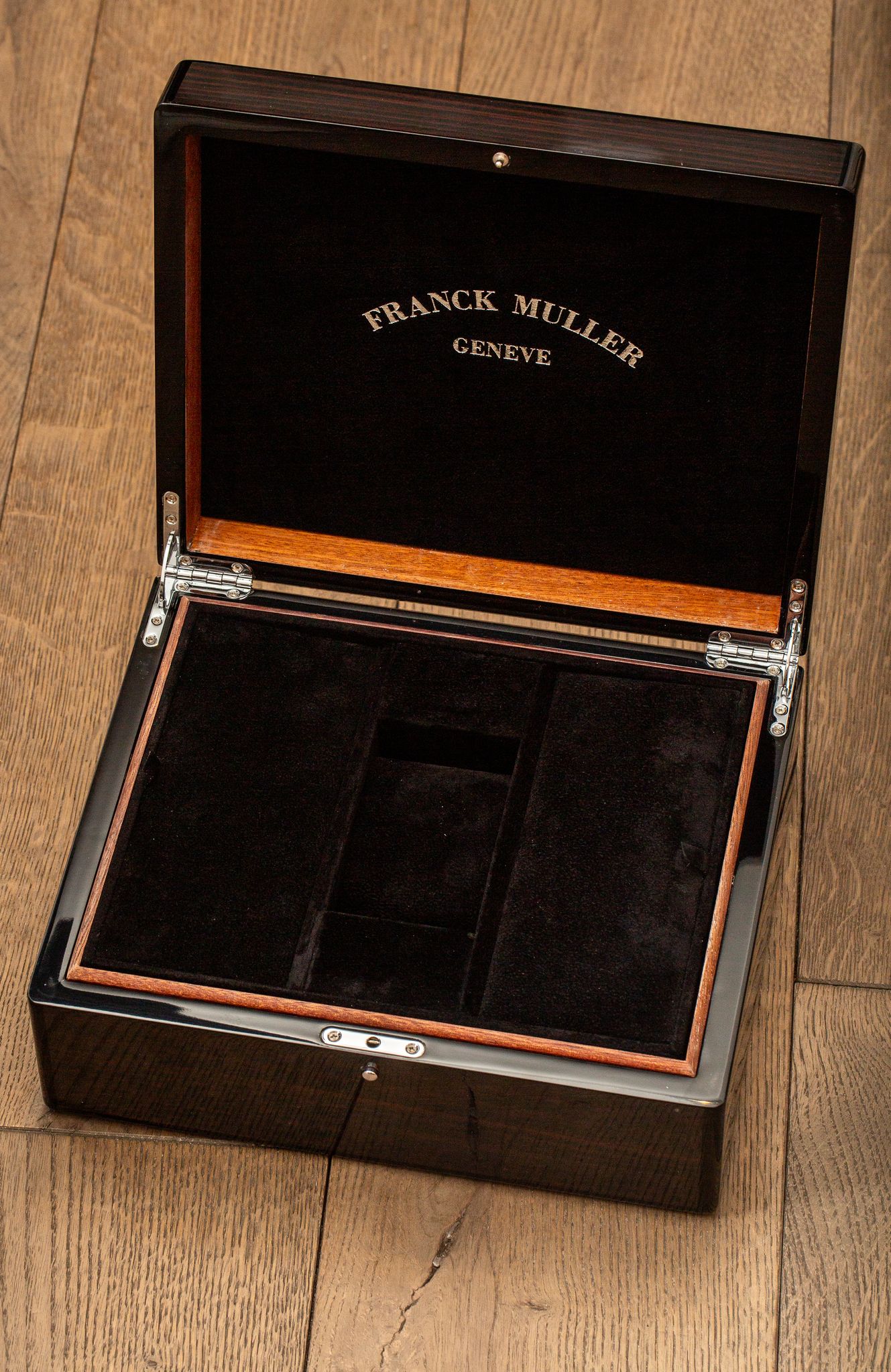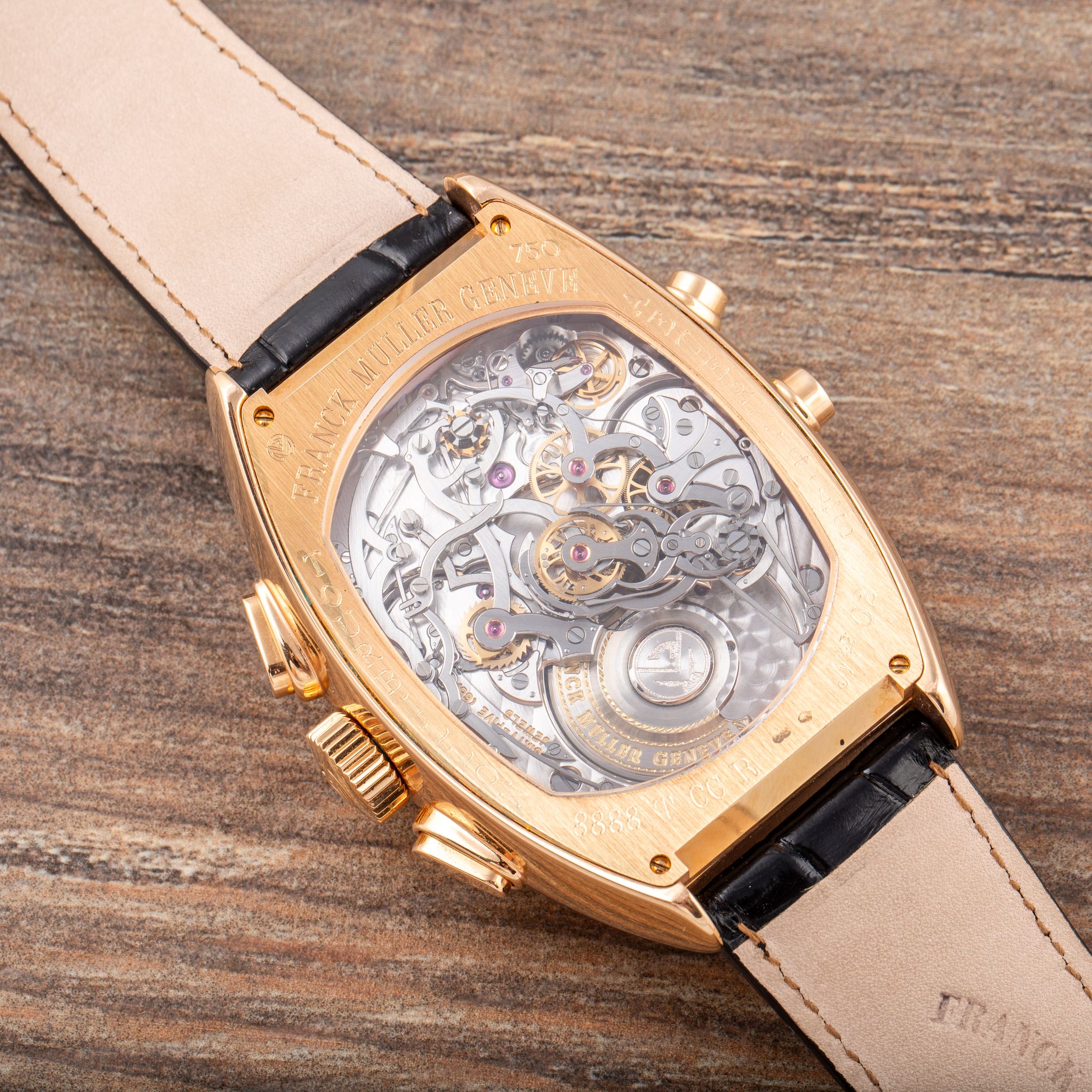 The watch comes in a 42 x 49 mm rose gold Cintrée Curvex case, a signature shape of the brand. The dial is silvered guilloché, hand-finished, and features bold Arabic numerals in Franck Muller’s instantly recognizable style.