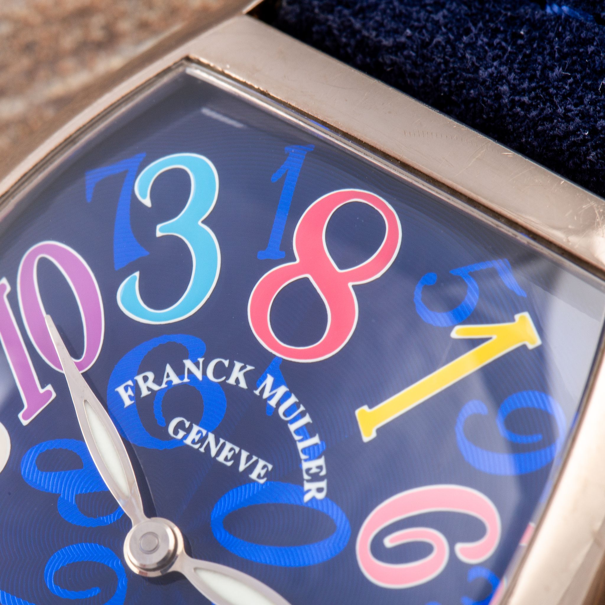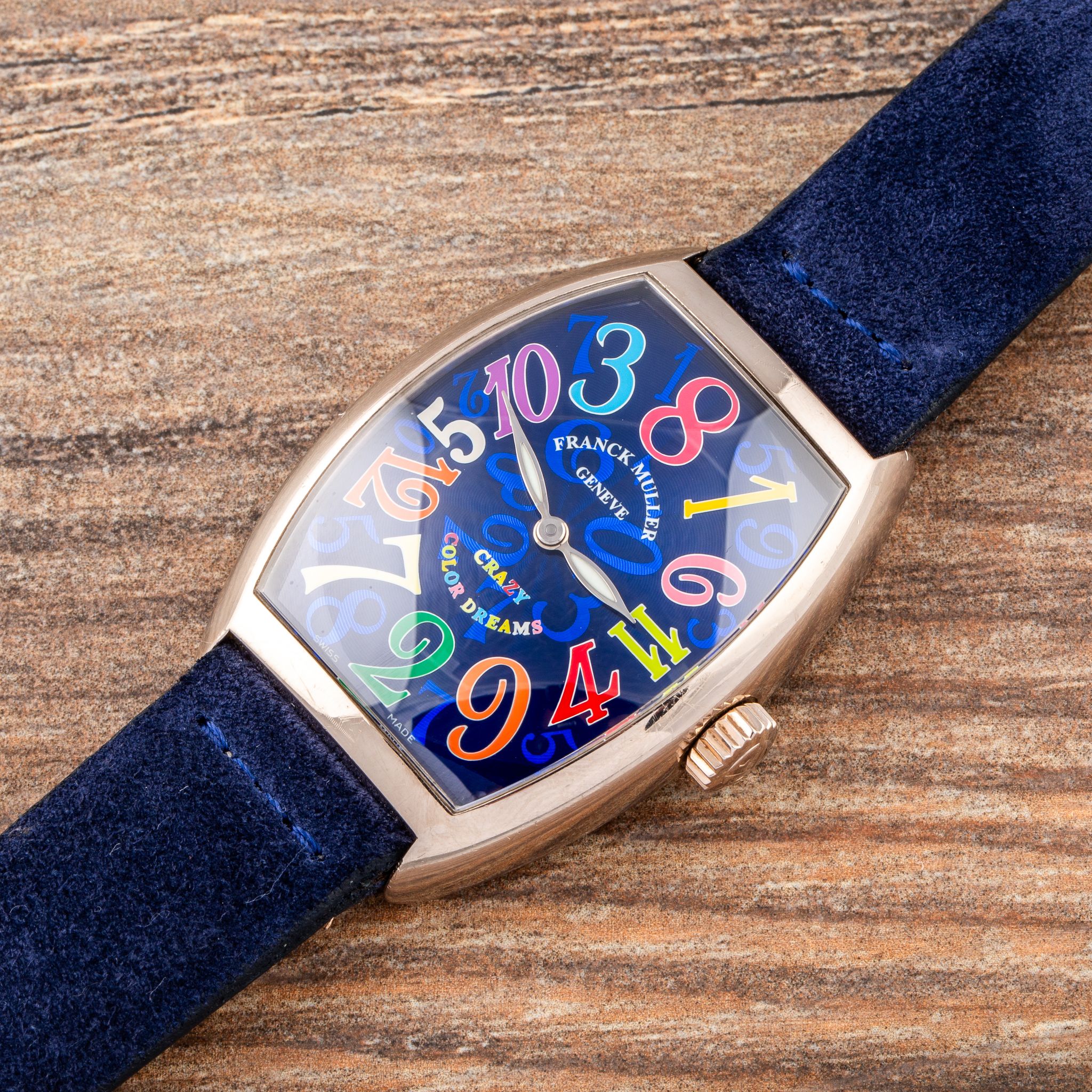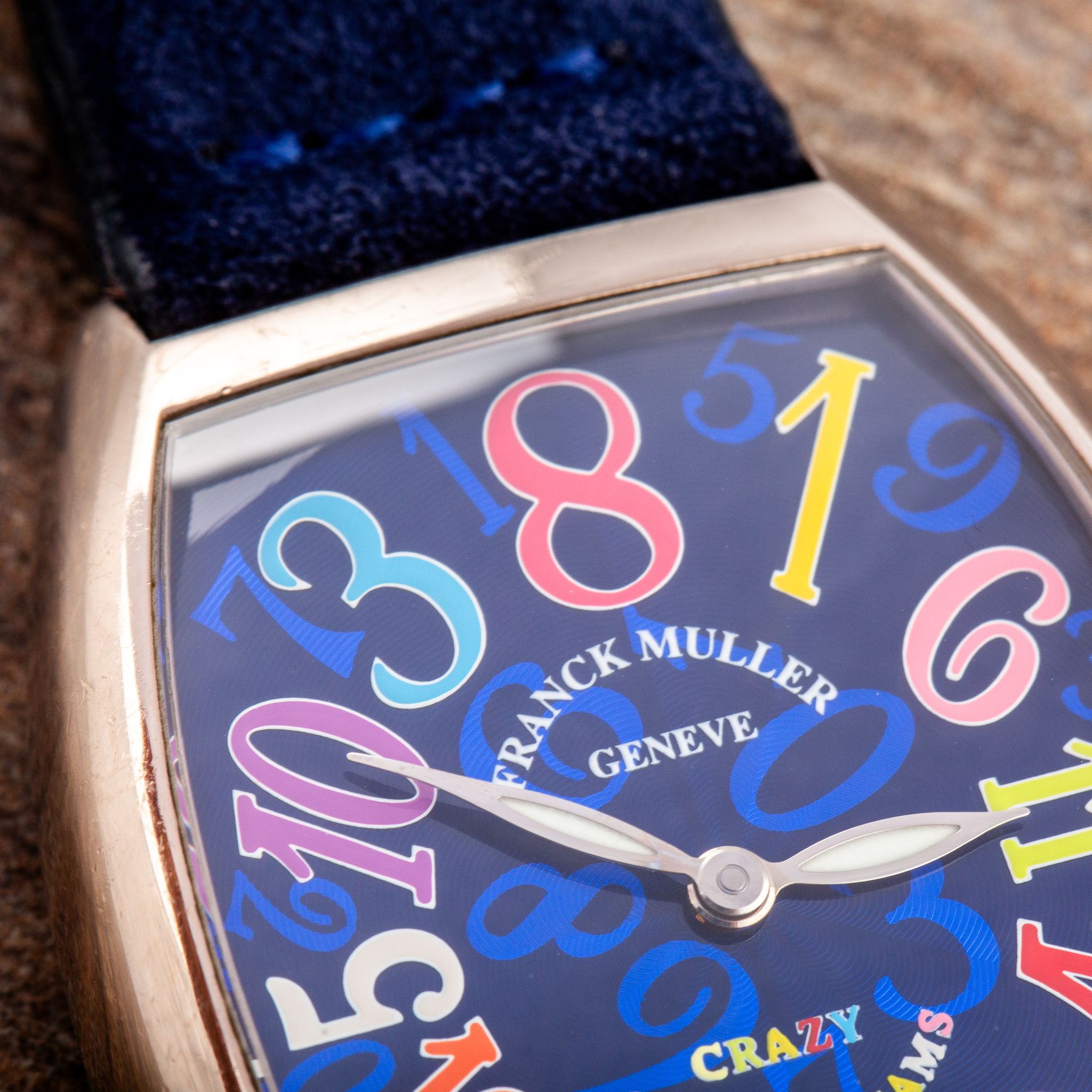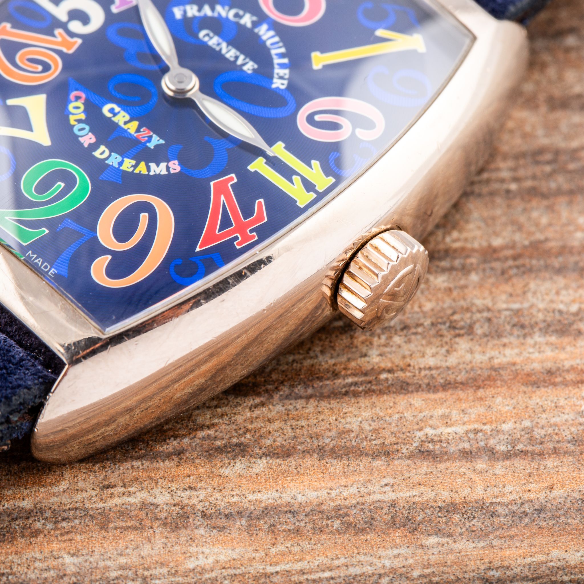 This particular example is a stunning rendition in white gold, featuring a blue dial adorned with vividly colored numerals. The contrast between the deep blue background and the playful, multicolored numbers enhances the whimsical character of the Crazy Hours, while the polished white gold case adds a touch of luxury and refinement. With its automatic movement and eye-catching design, the Crazy Hours 7851 CH is a perfect choice for anyone who wants a watch that is both playful and sophisticated.