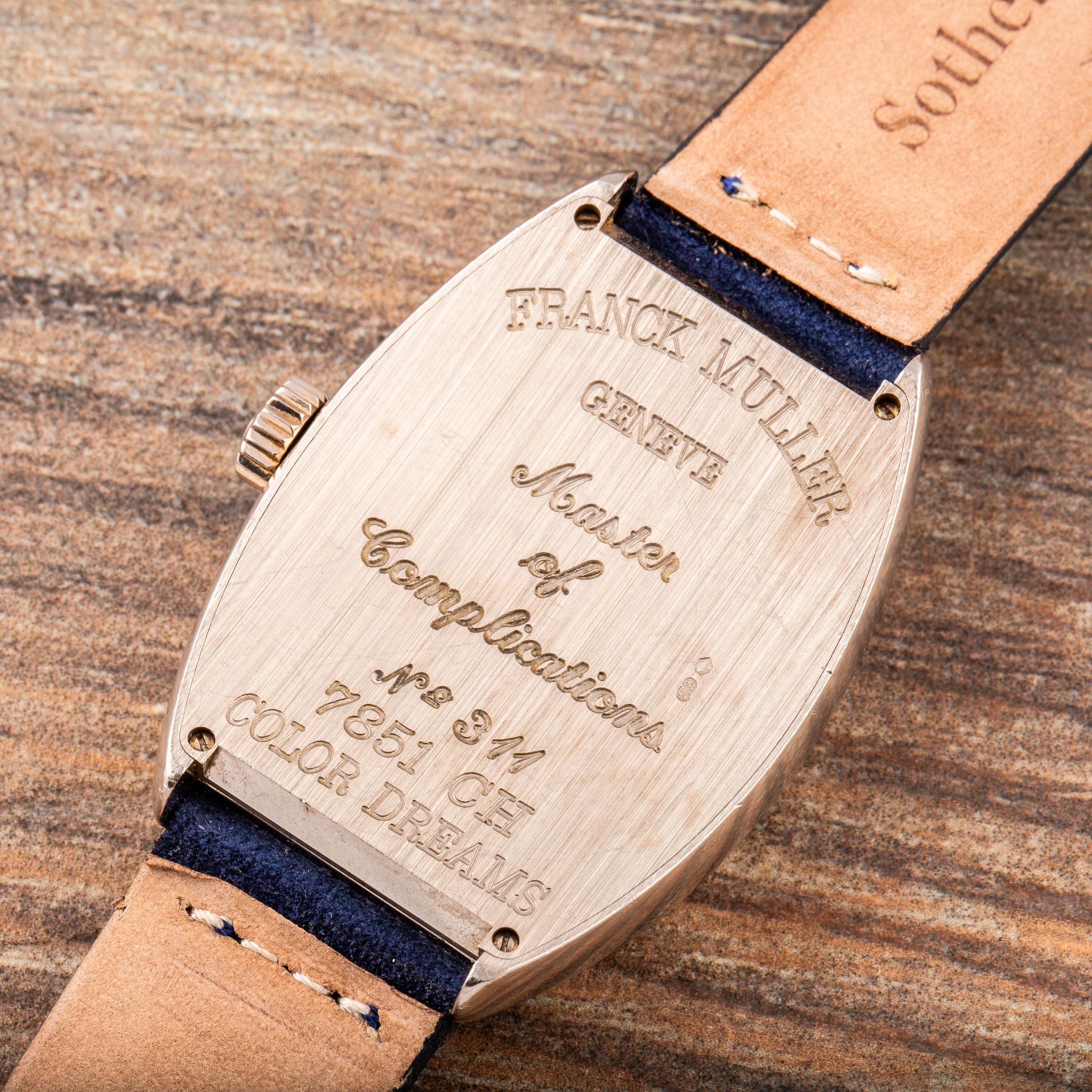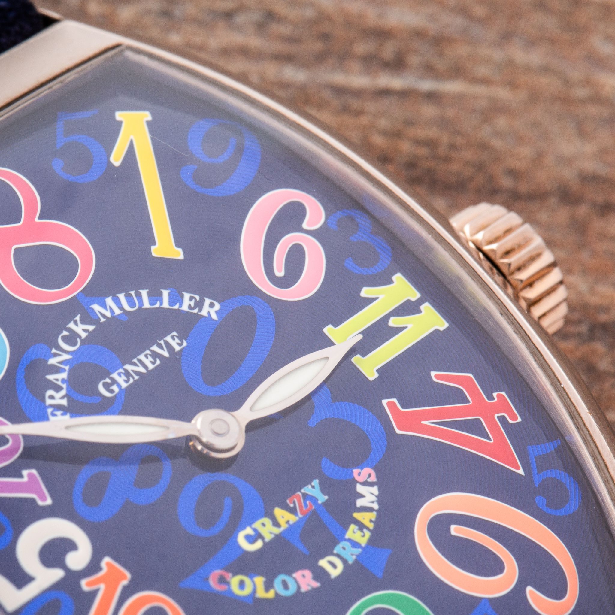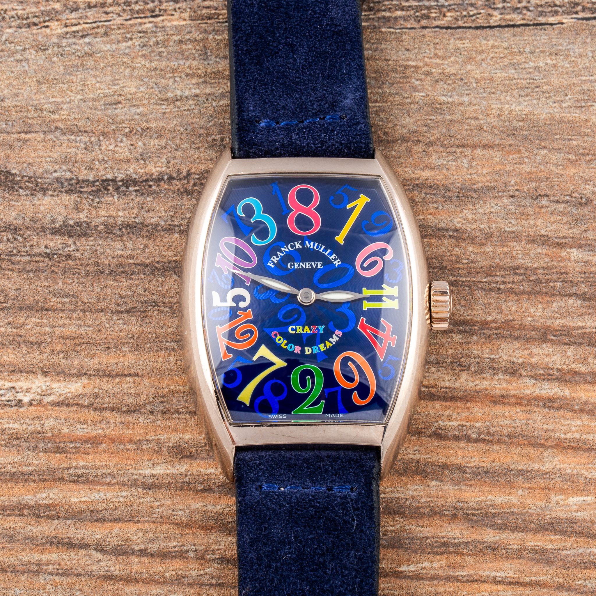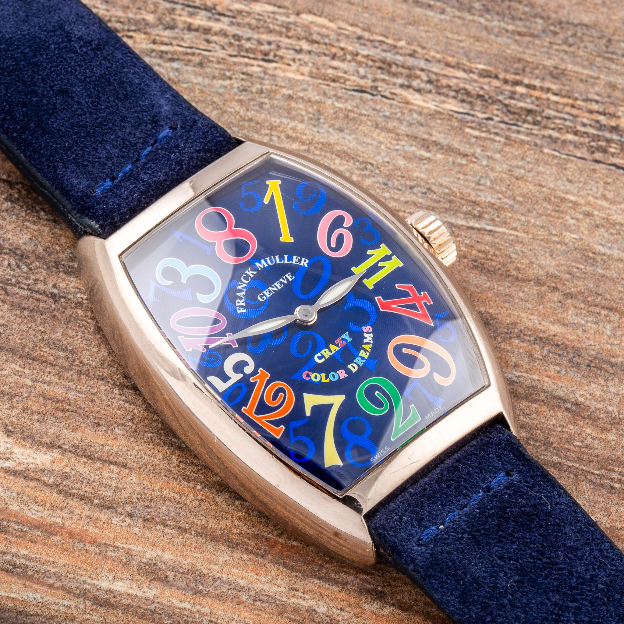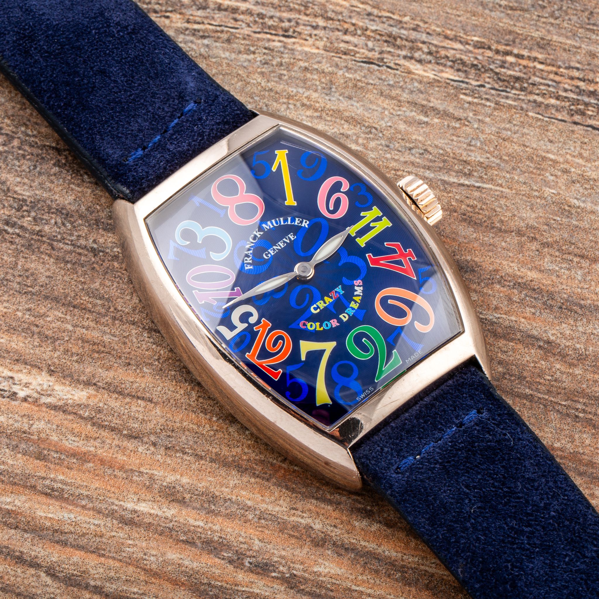 This particular example is a stunning rendition in white gold, featuring a blue dial adorned with vividly colored numerals. The contrast between the deep blue background and the playful, multicolored numbers enhances the whimsical character of the Crazy Hours, while the polished white gold case adds a touch of luxury and refinement. With its automatic movement and eye-catching design, the Crazy Hours 7851 CH is a perfect choice for anyone who wants a watch that is both playful and sophisticated.