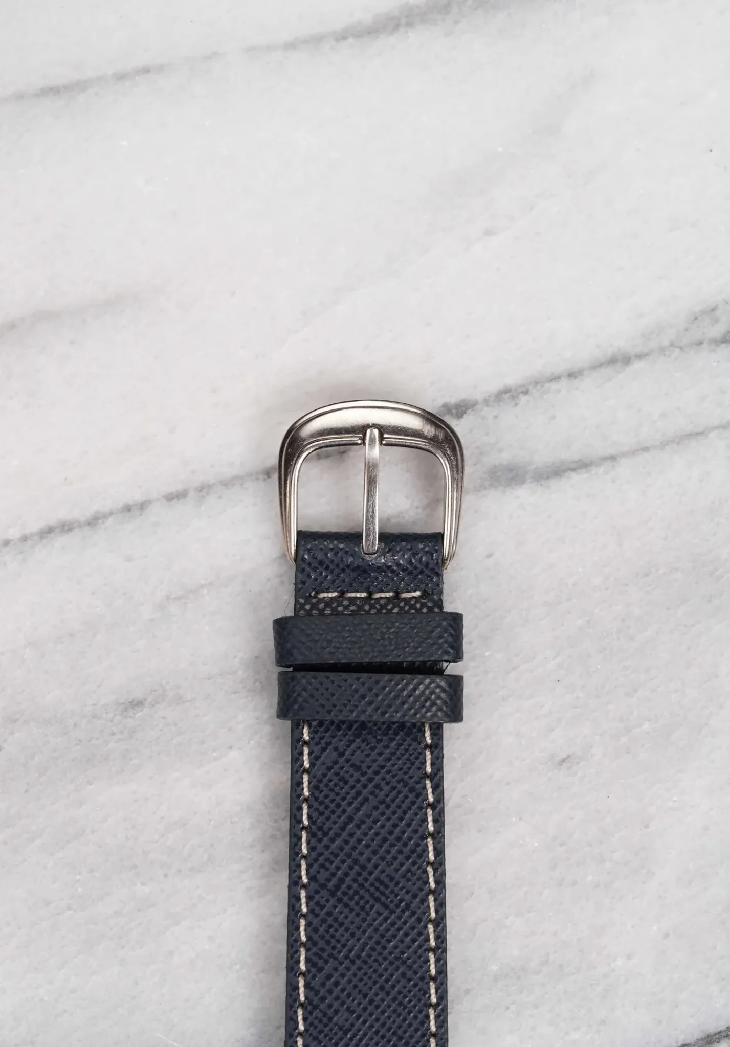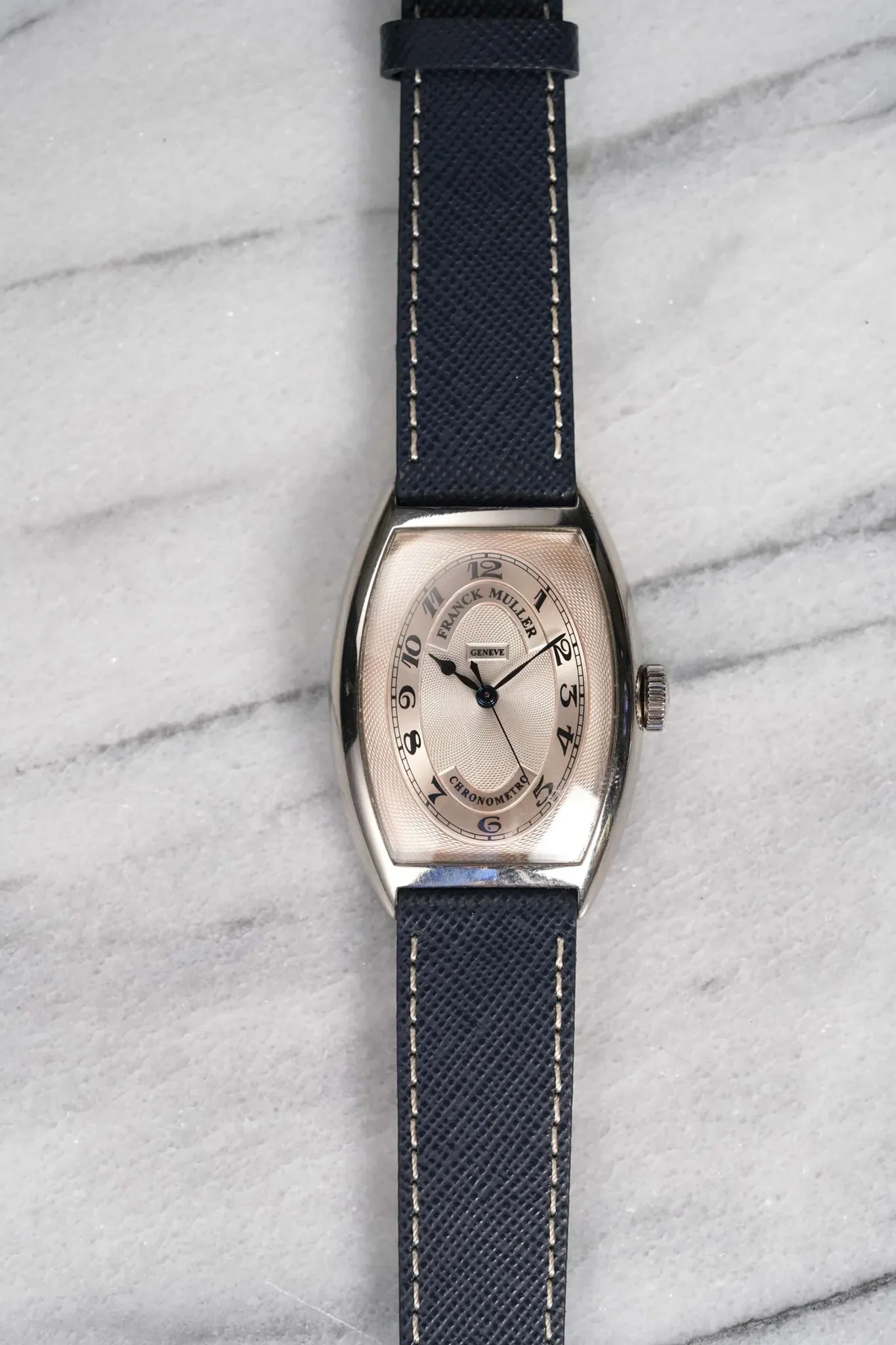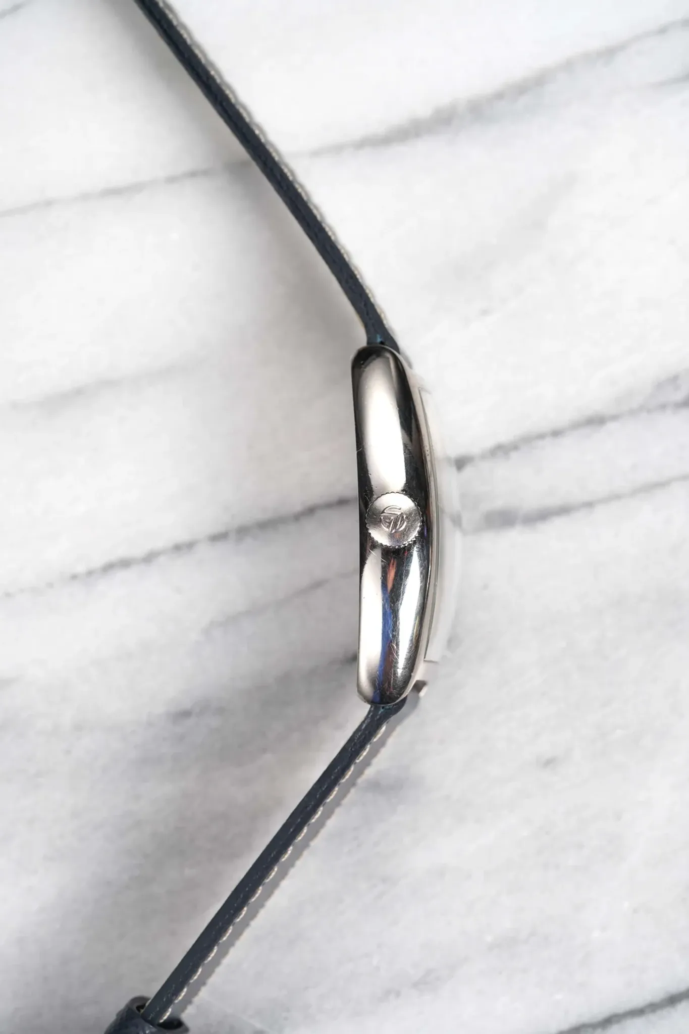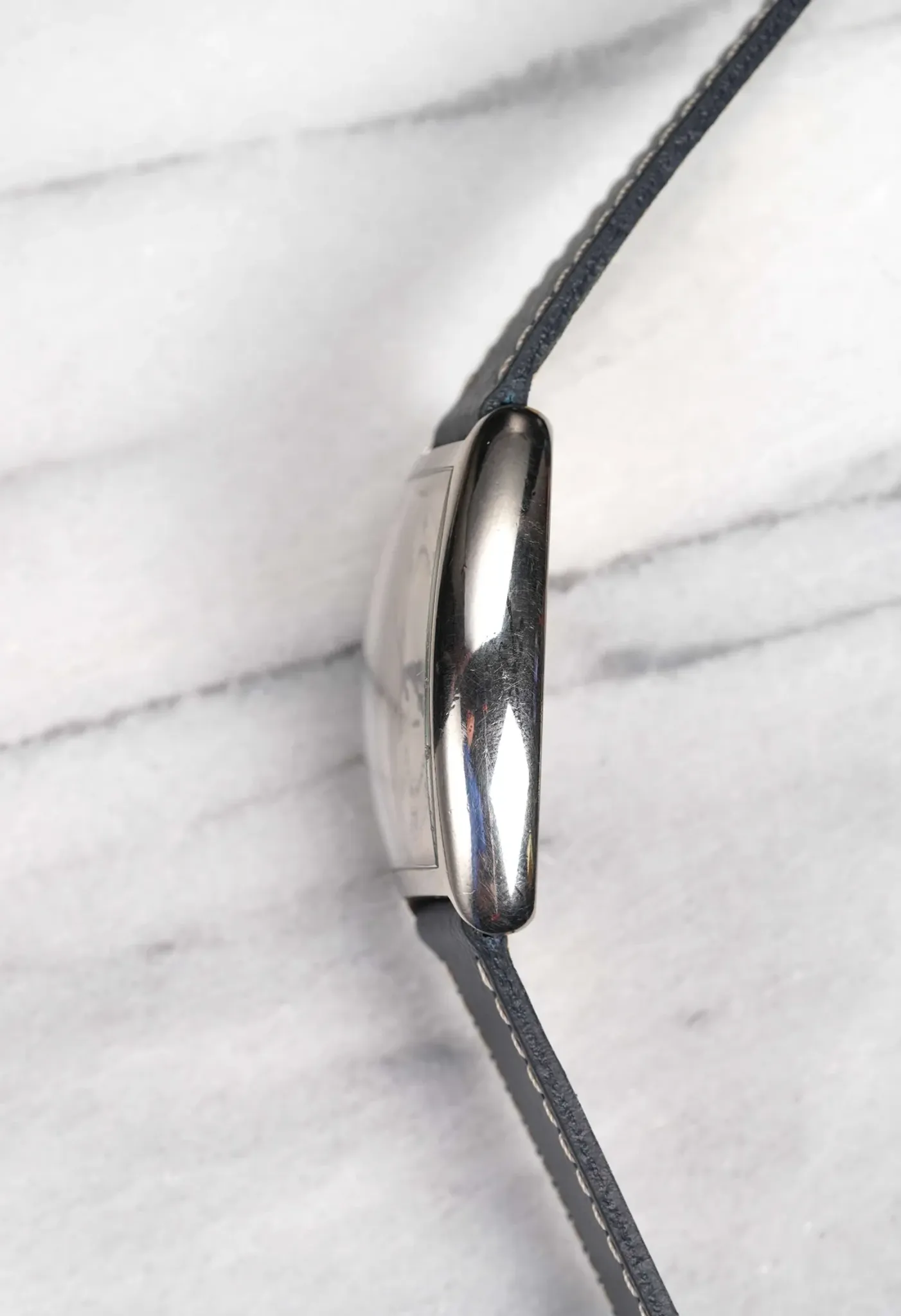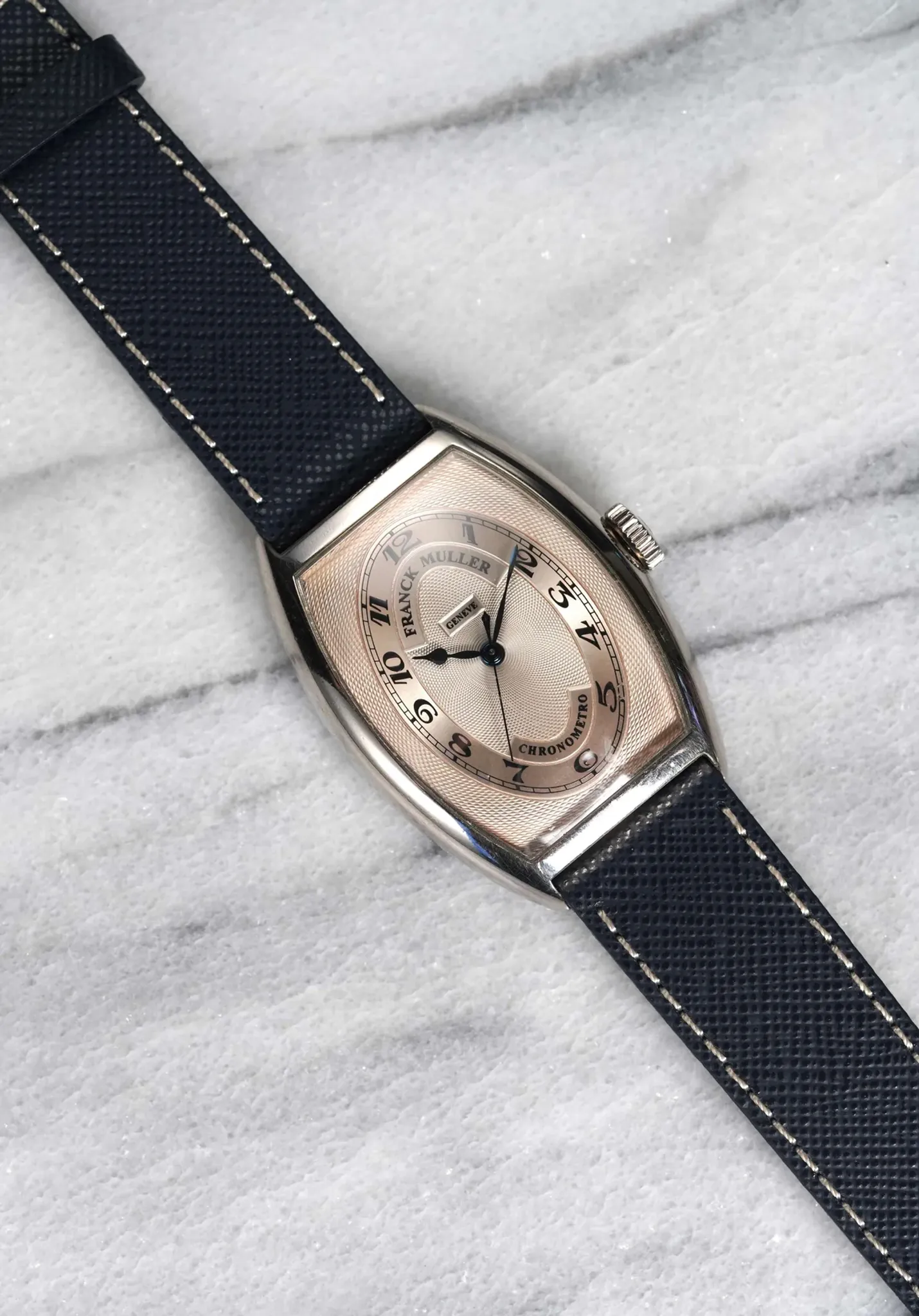 Here's a Neo-vintage Frank Muller automatic in 18k white gold with a silver guiolloche dial and arabic numerals from the 1990s. Keeps great time and is fully functional. Measurements include a 32x45mm case and 18mm lug width. On a aftermarket blue pebble textured leather strap (Made in Italy) and signed white gold buckle. Both the dial and crystal are free from any scratches or marks. Hard to find these obscure examples with these textured dials. All parts are original including the crown, caseback, dial, and movement. Both the dial and case are in great cosmetic, untouched condition.