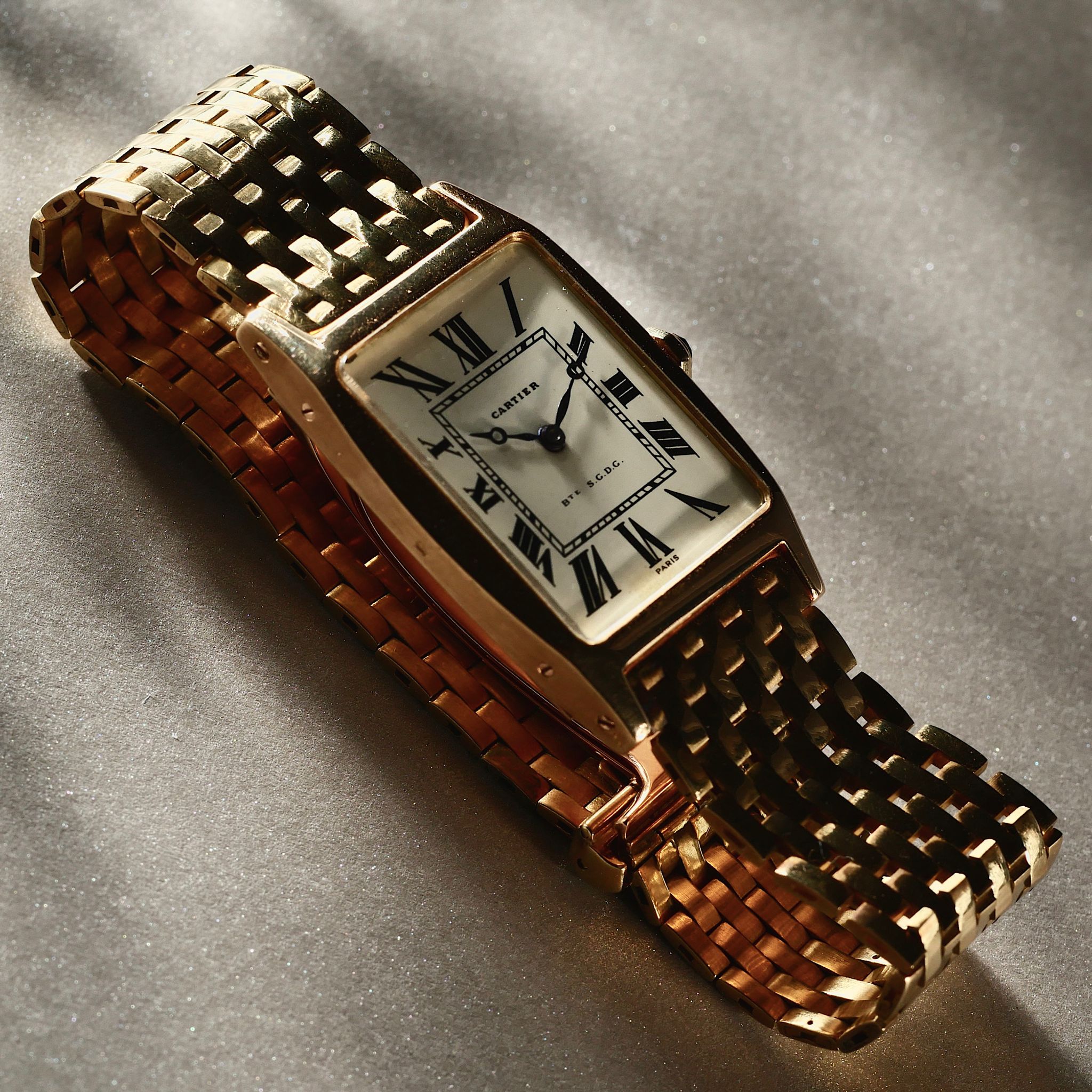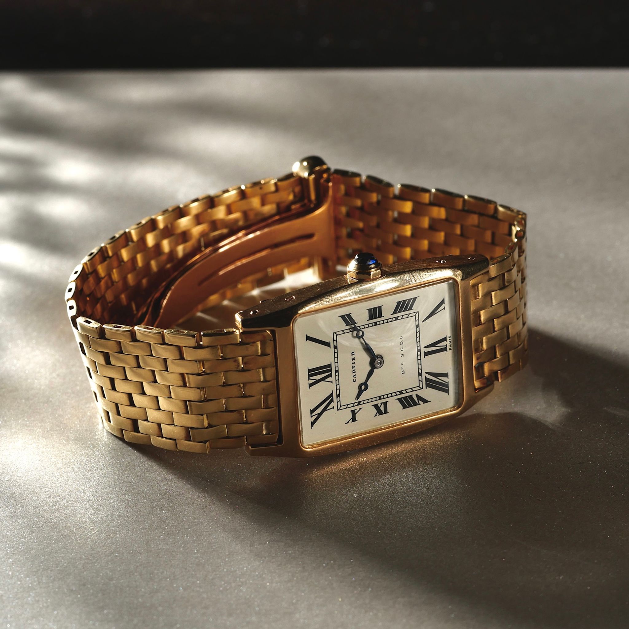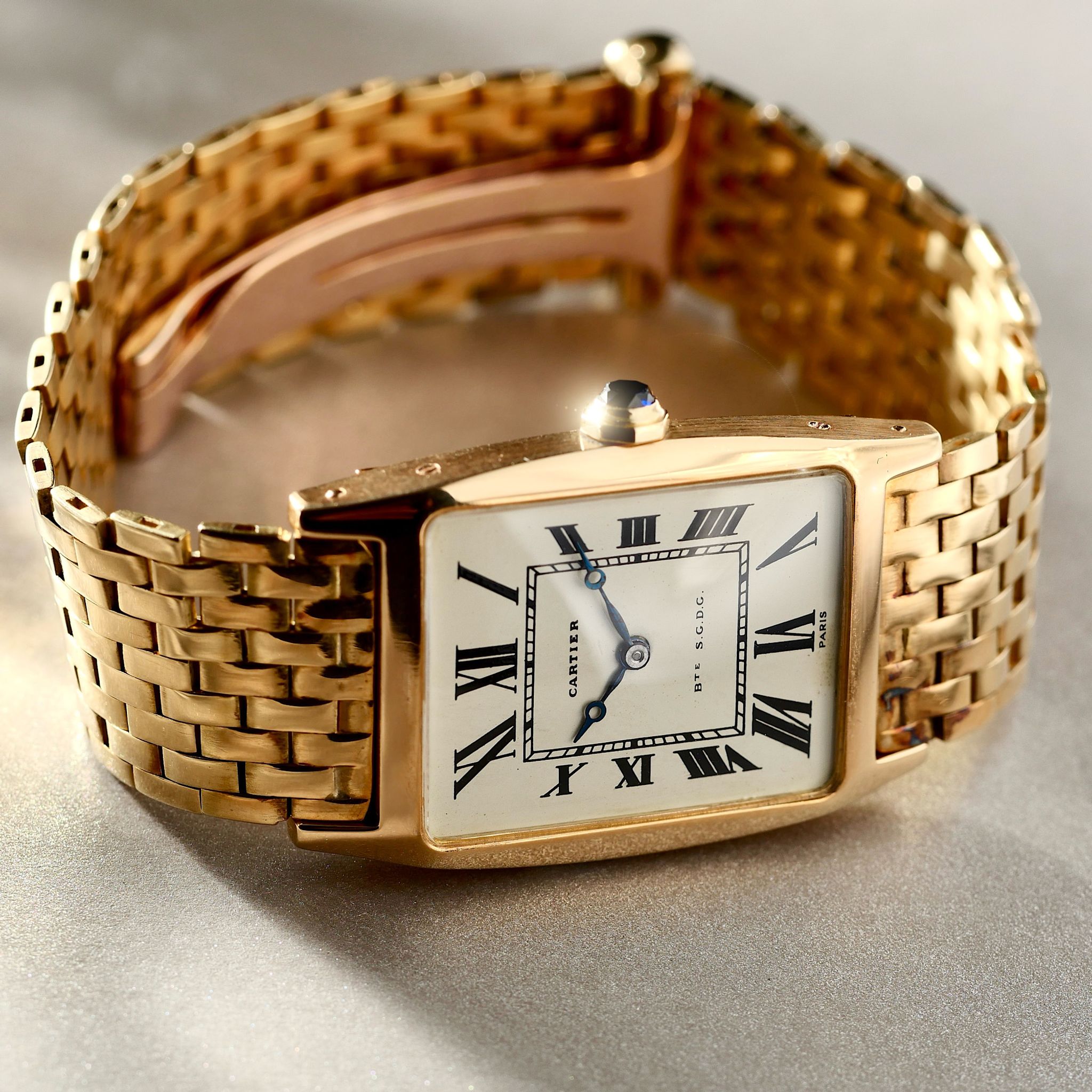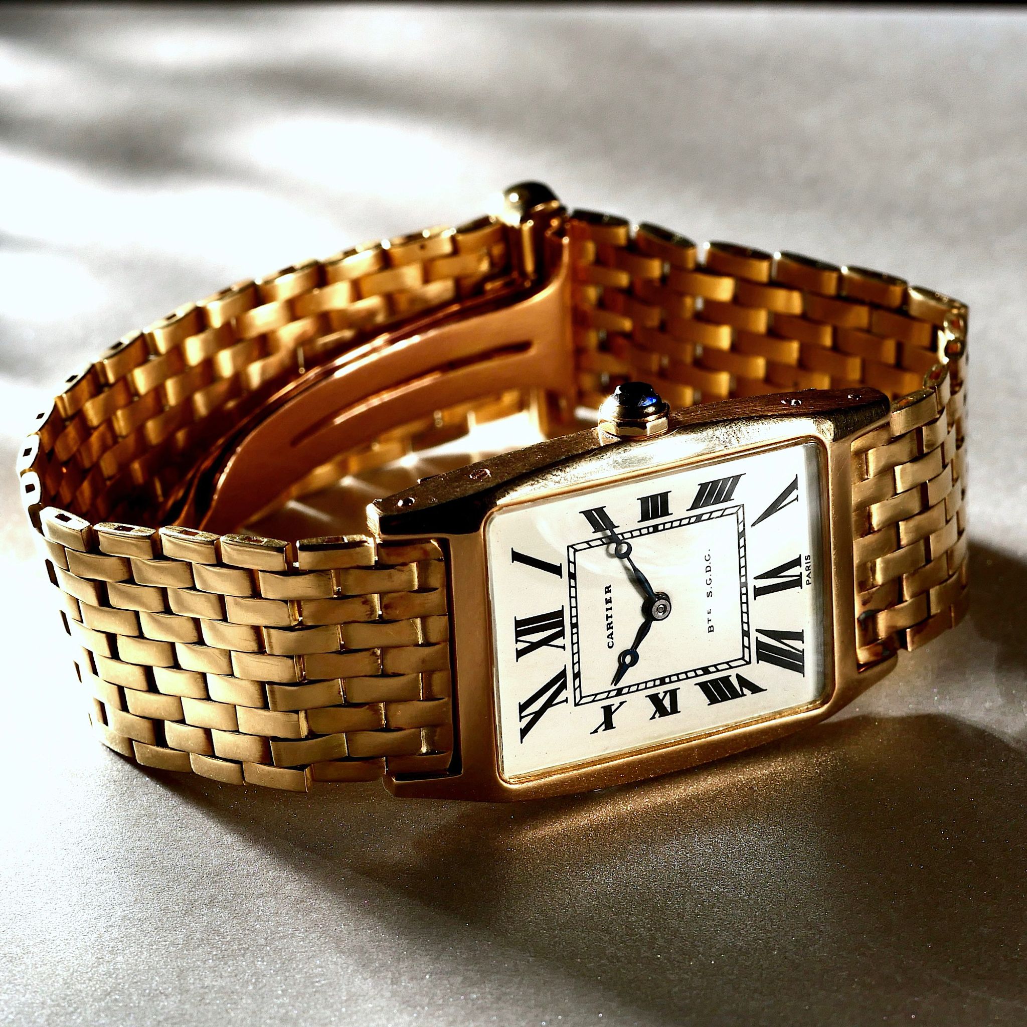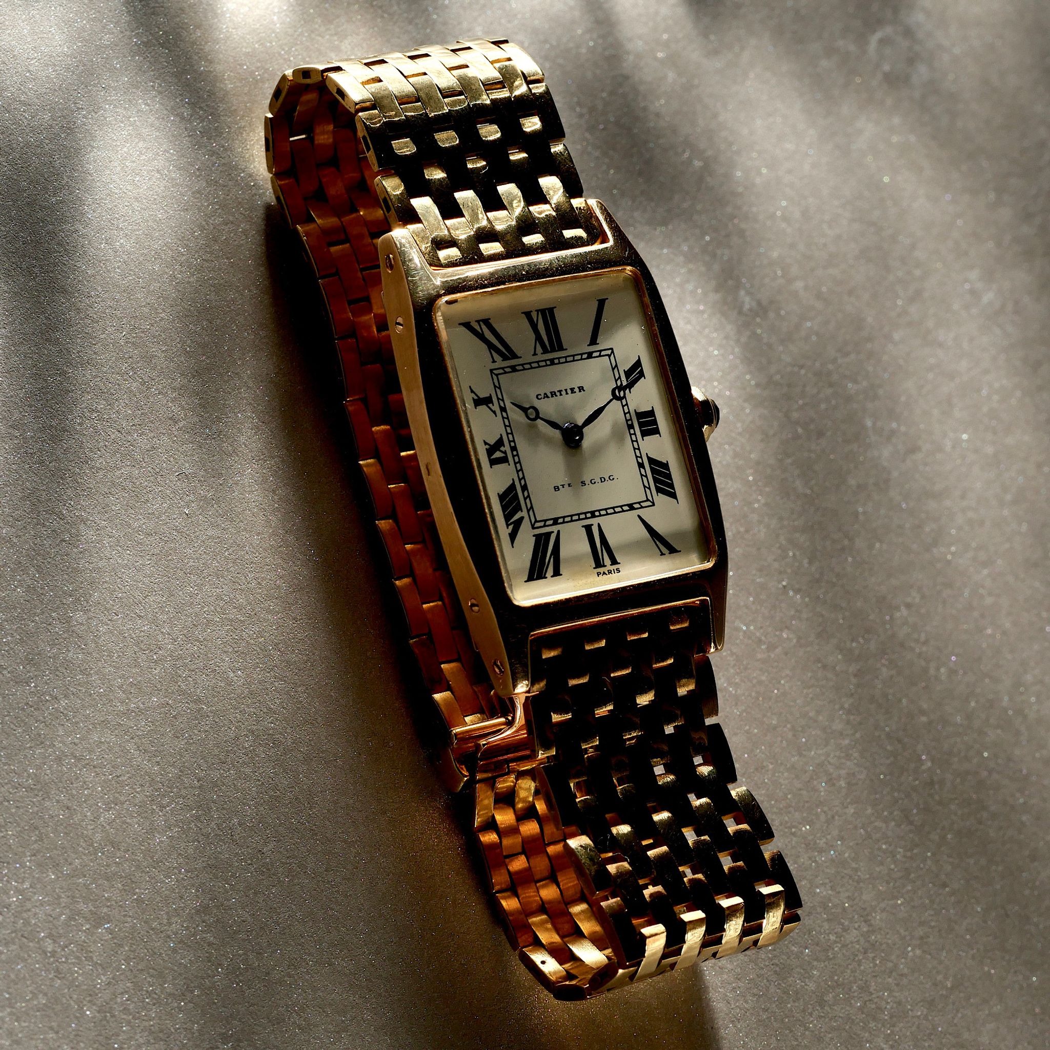 This watch, a relic of the 1960s, is a unicorn, adorned with an original 18k gold Cartier brick bracelet. Rare Breguet style hands dance across the dial with the inscription BTE S.G.D.G; a French patent that has long since faded into obscurity.