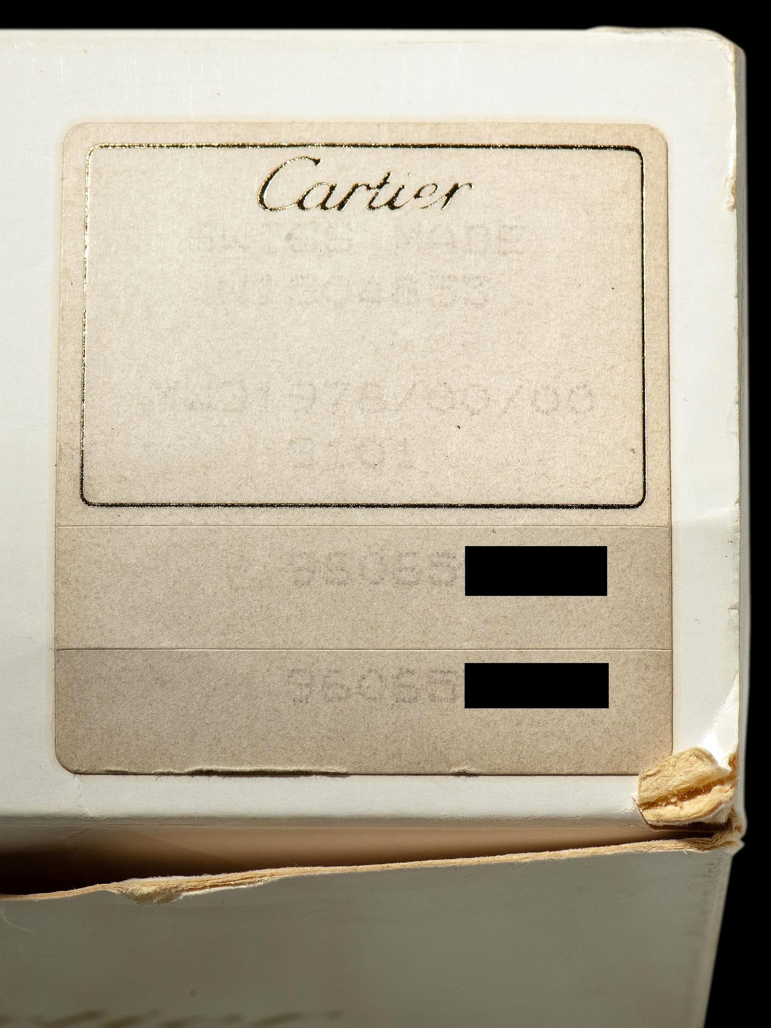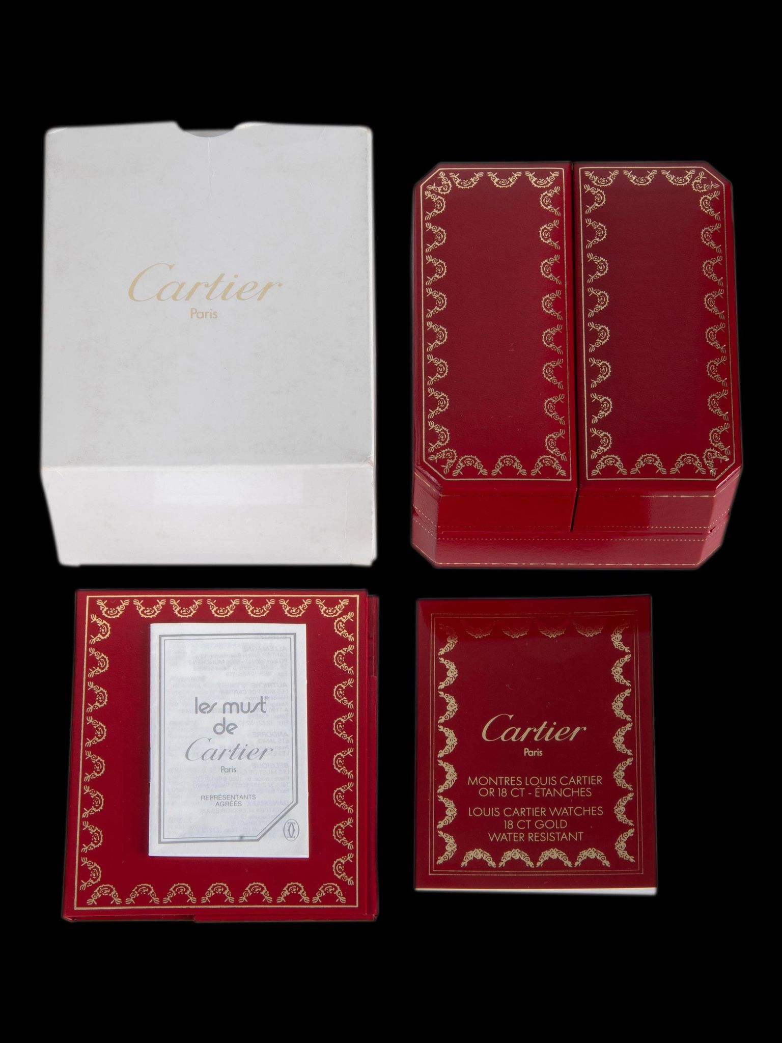 The watch comes as a complete set, featuring its original outer box which features the serial number of the watch, the inner presentation box, a Cartier card holder, and booklets. The watch is functioning and keeping time, previous service history is unknown.