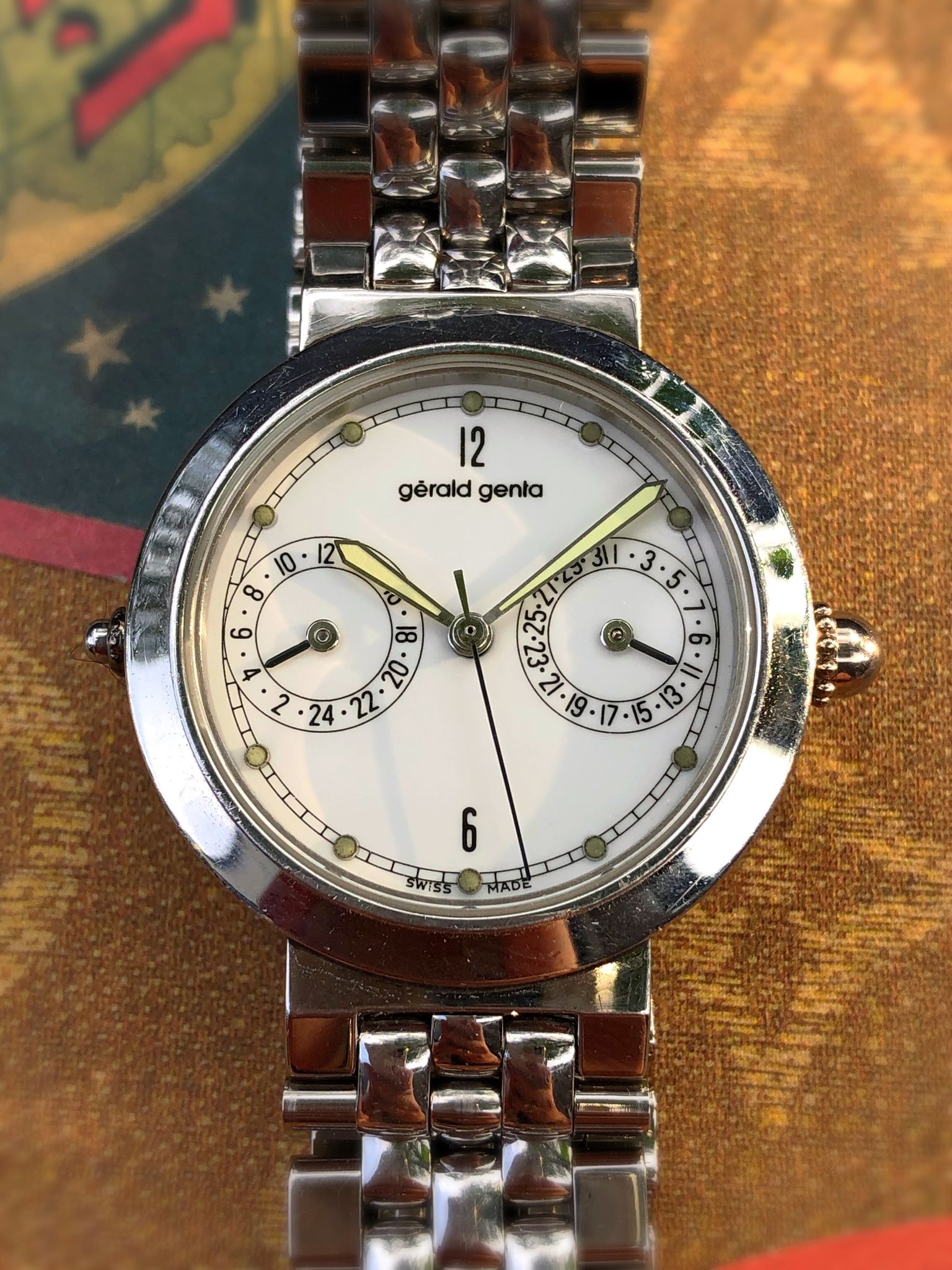 This rare and unique Steel GMT example is in our opinion the perfect addition for someone not only looking to add a complication Gerald Genta on a budget, but also a great addition for those looking for a more “tame” Complication Genta!