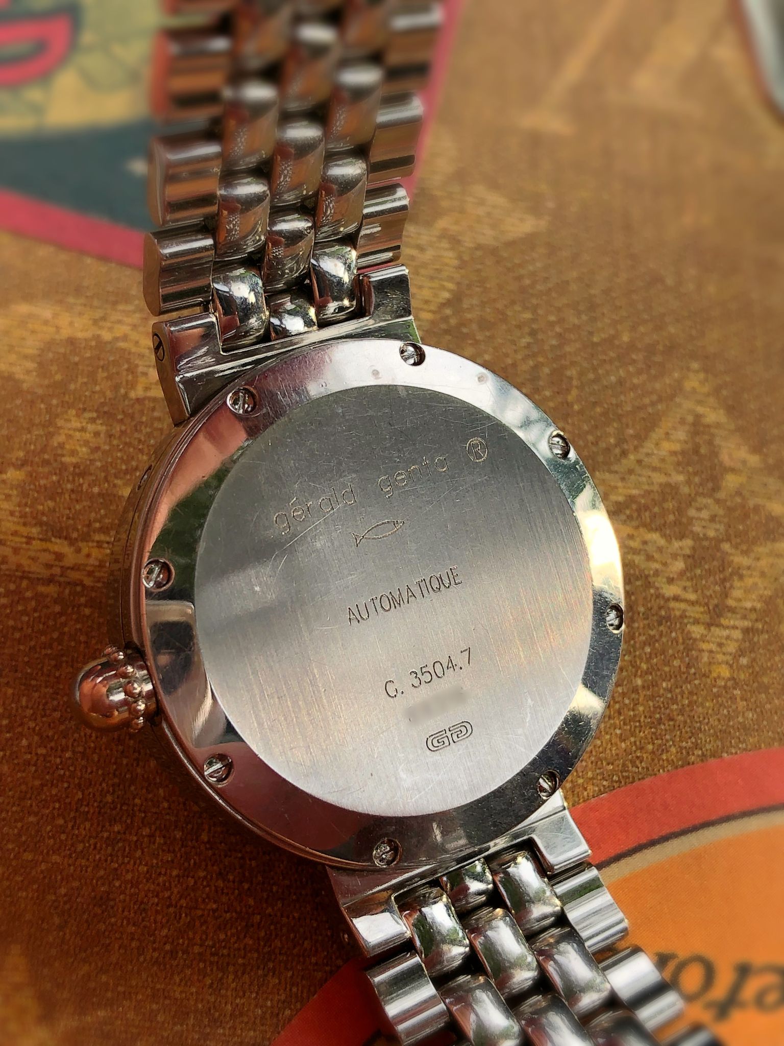 Behind the solid caseback reveals a Gerald Genta signed and decorated Jaeger Cal.889/1 automatic movement.