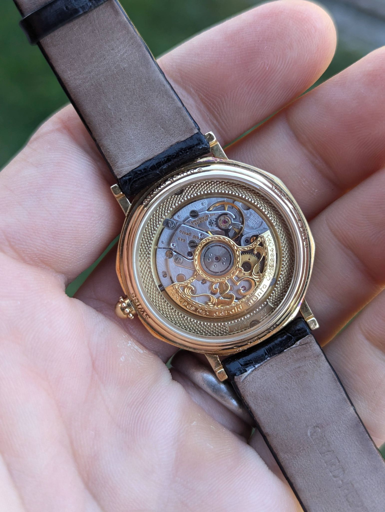 The sapphire caseback allows full view on the beautifully finished movement and especially on the skelettonized rotor, showing a 25 in breguet numbers.