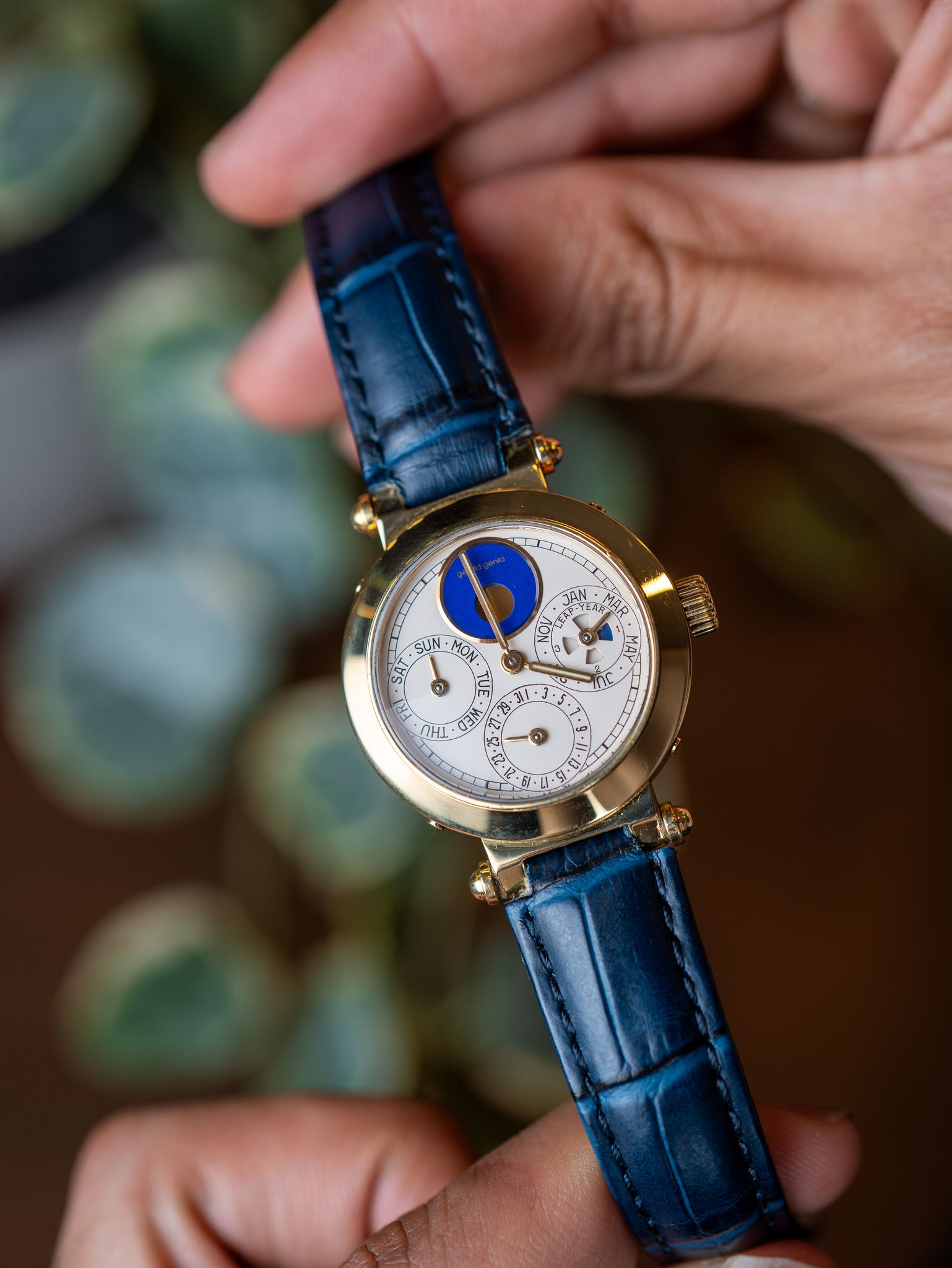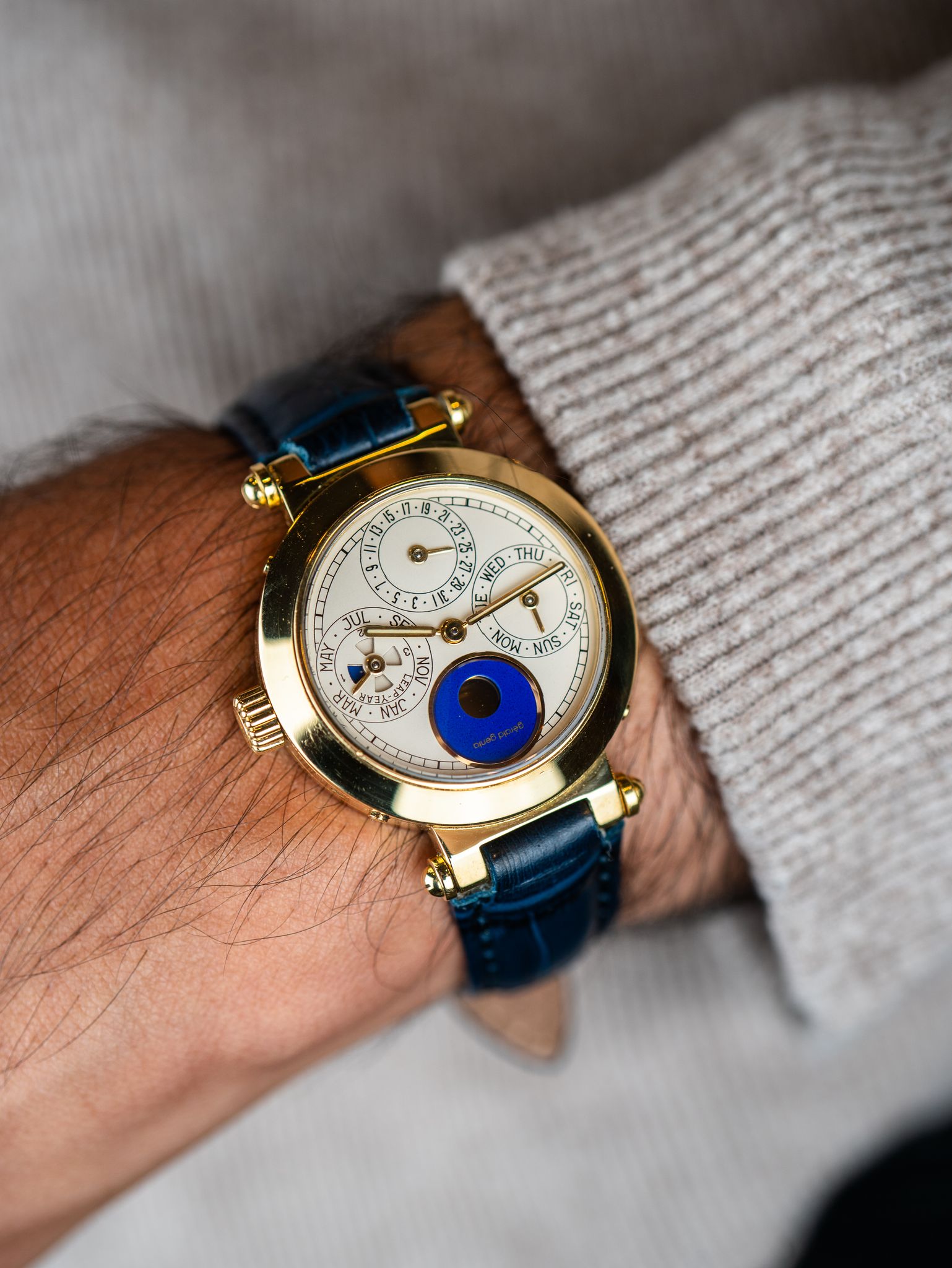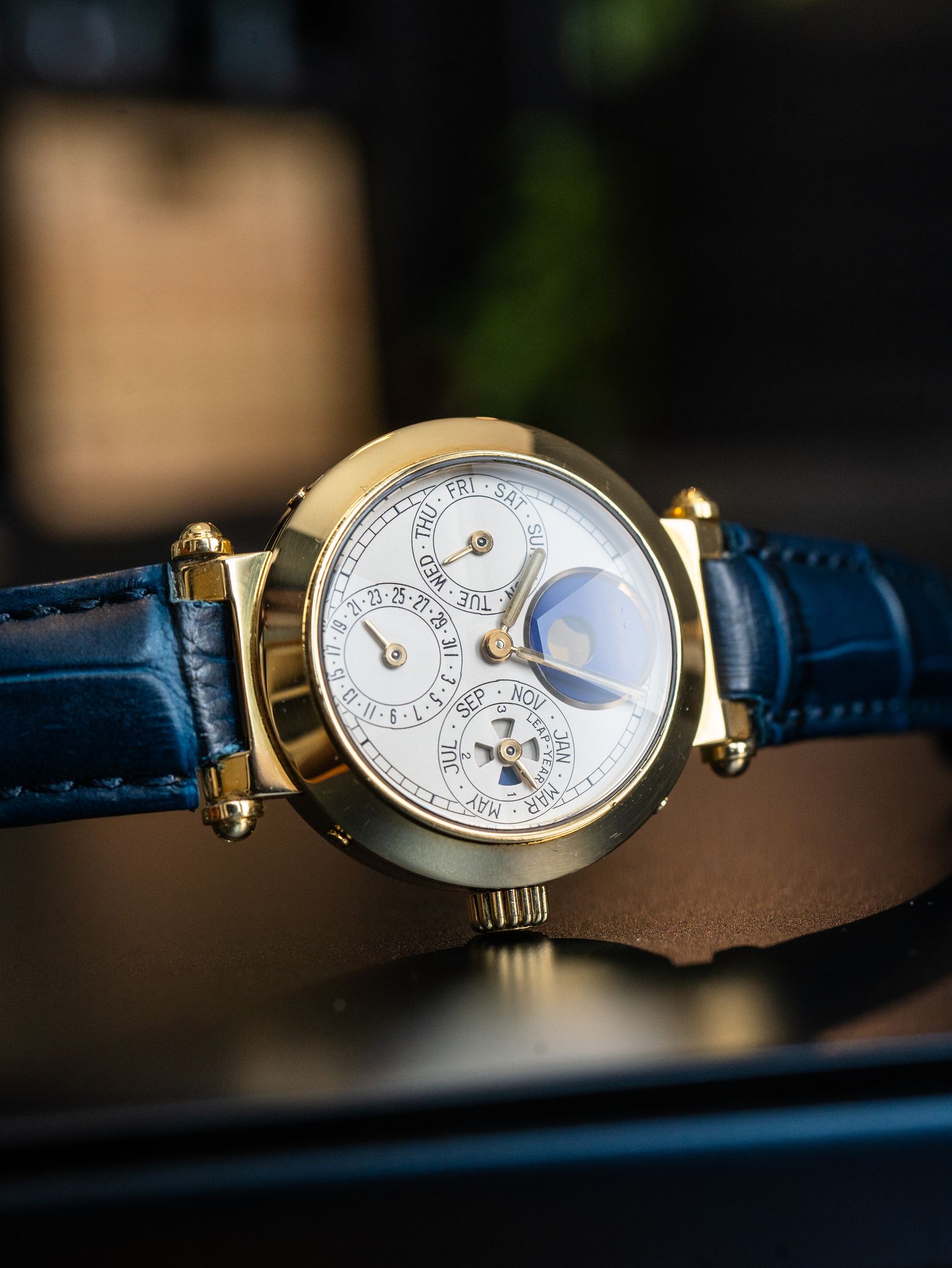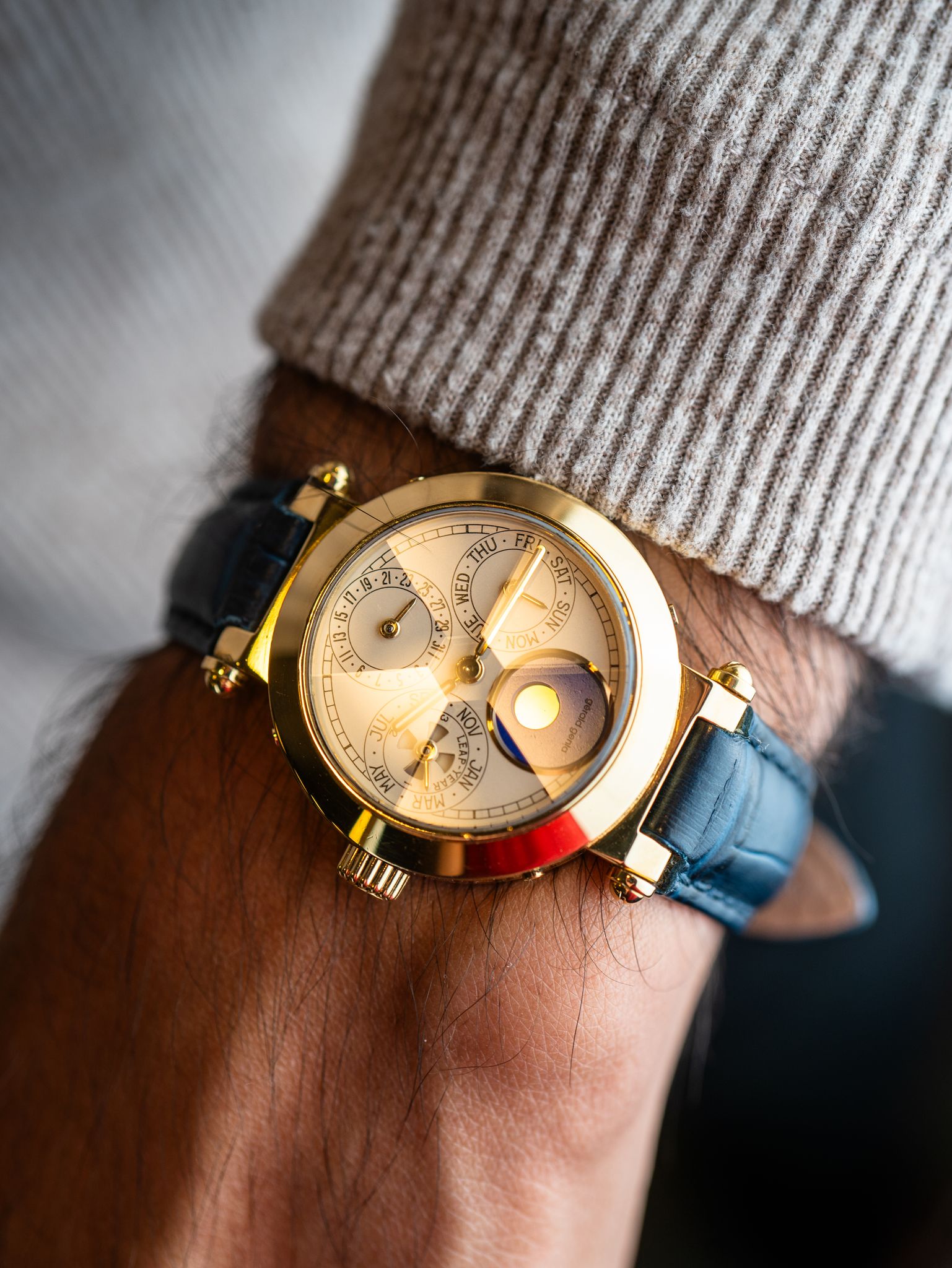 Now Live! A gerald genta perpetual calendar Ref. G3144.7. Featuring a solid gold case that’s super wearable, unique lug design, lapis lazuli moonphase, faceted sapphire crystal, an ultra thin fp 71 caliber with sapphire case back. This watch has got all the bells and whistles! Known for his adventurous and creative designs, the genta watches are always unique and bold in their own way! Heavy pasha vibes on this ref! This watch could be yours, Dm for more details!