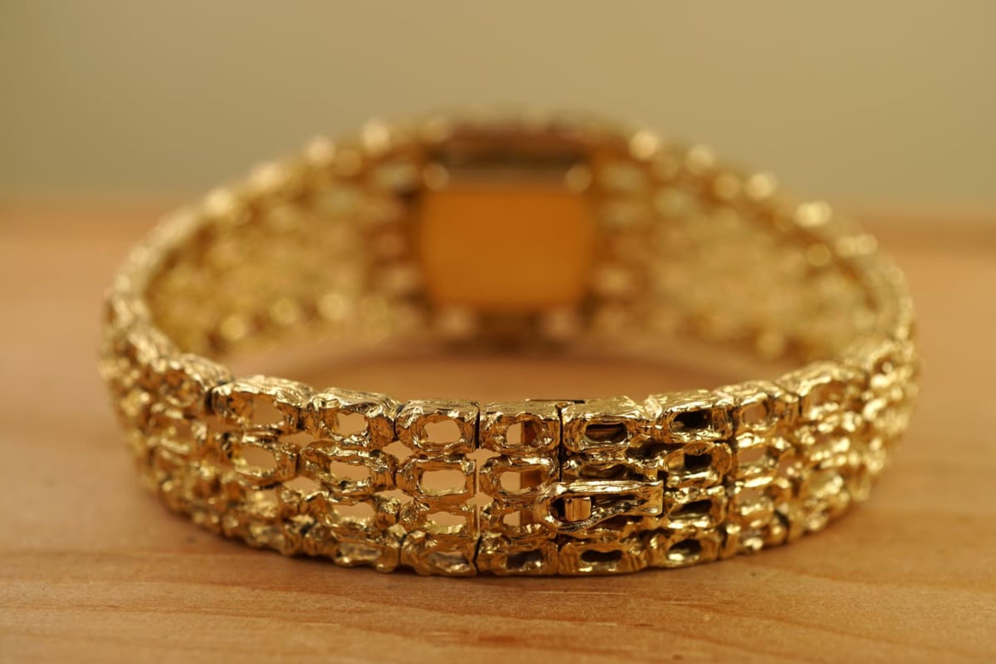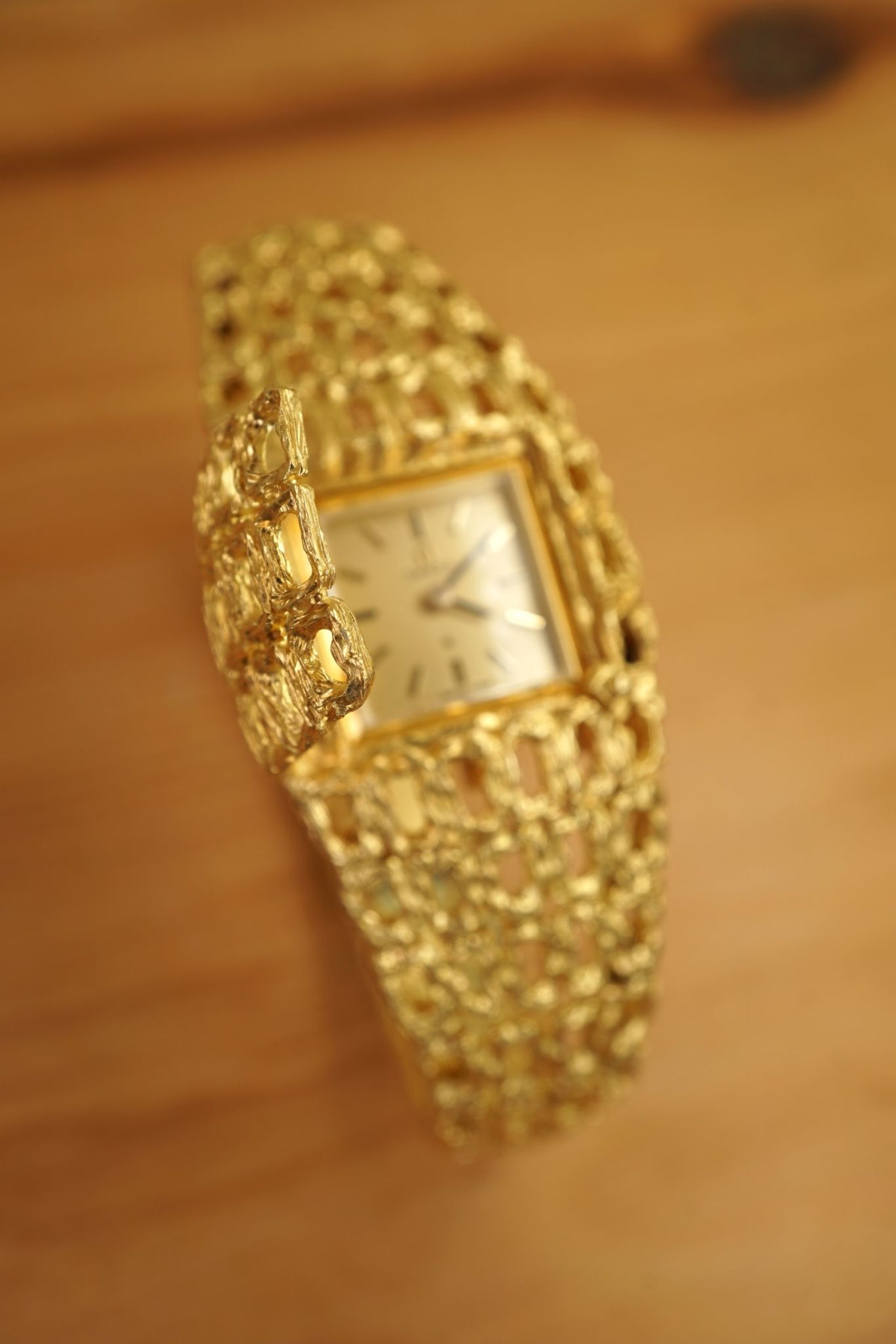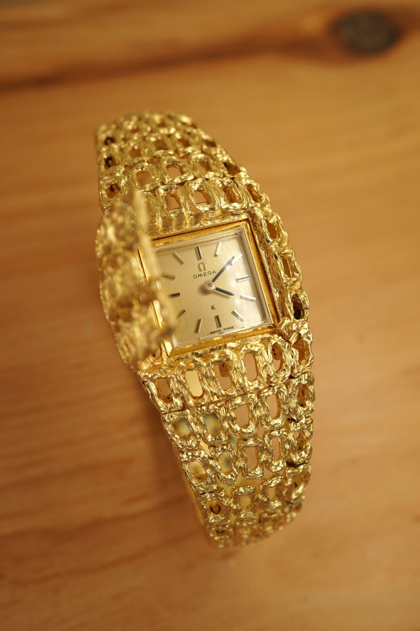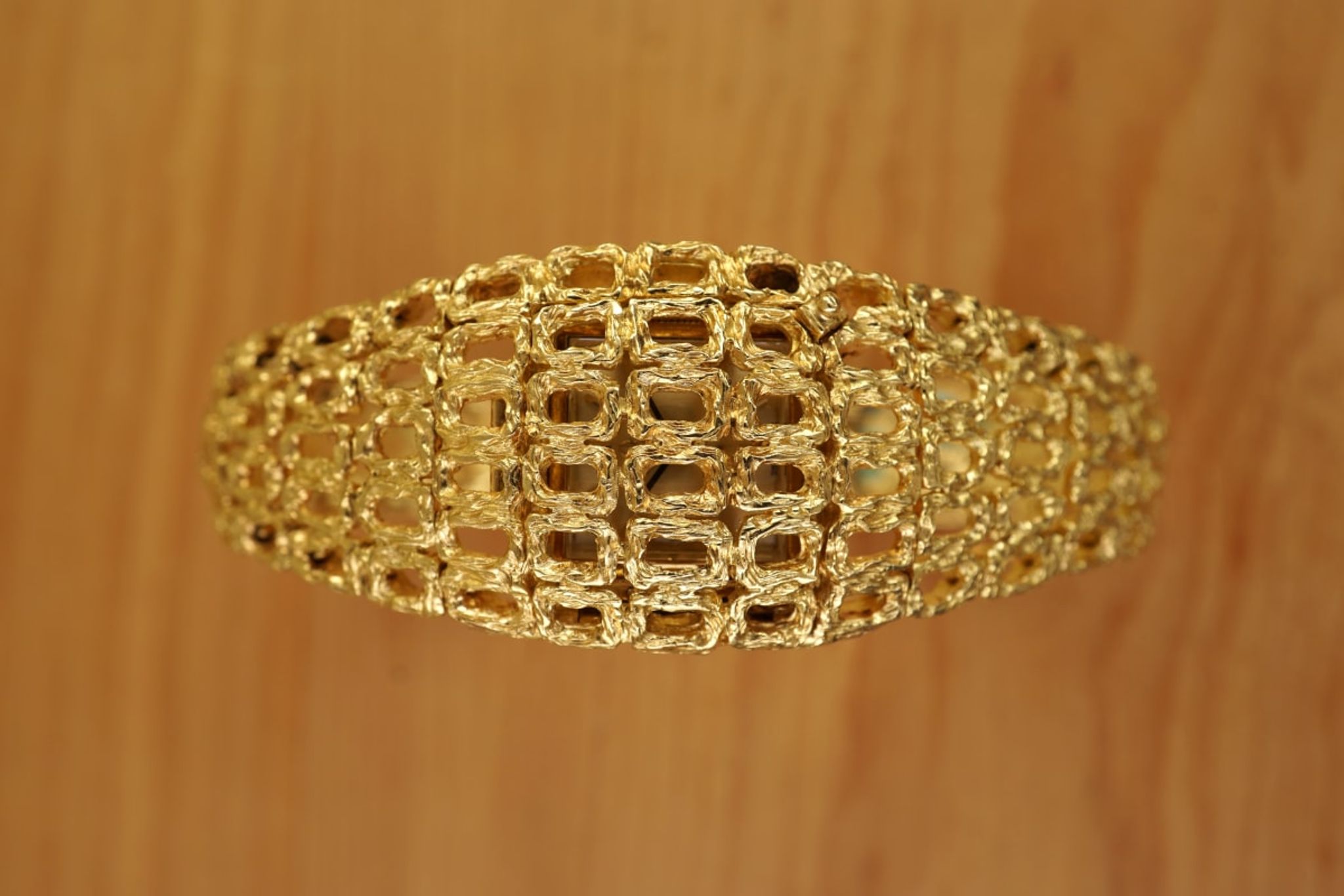 This design icon was made by Omega in all 18K-yellowgold in 1964 according to our books and research and the watch is still in excellent condition: movement serviced and running reliable and precise and the clasp and the lid closing both safely and strong. The current length of 16.5cm could be extended if necessary.