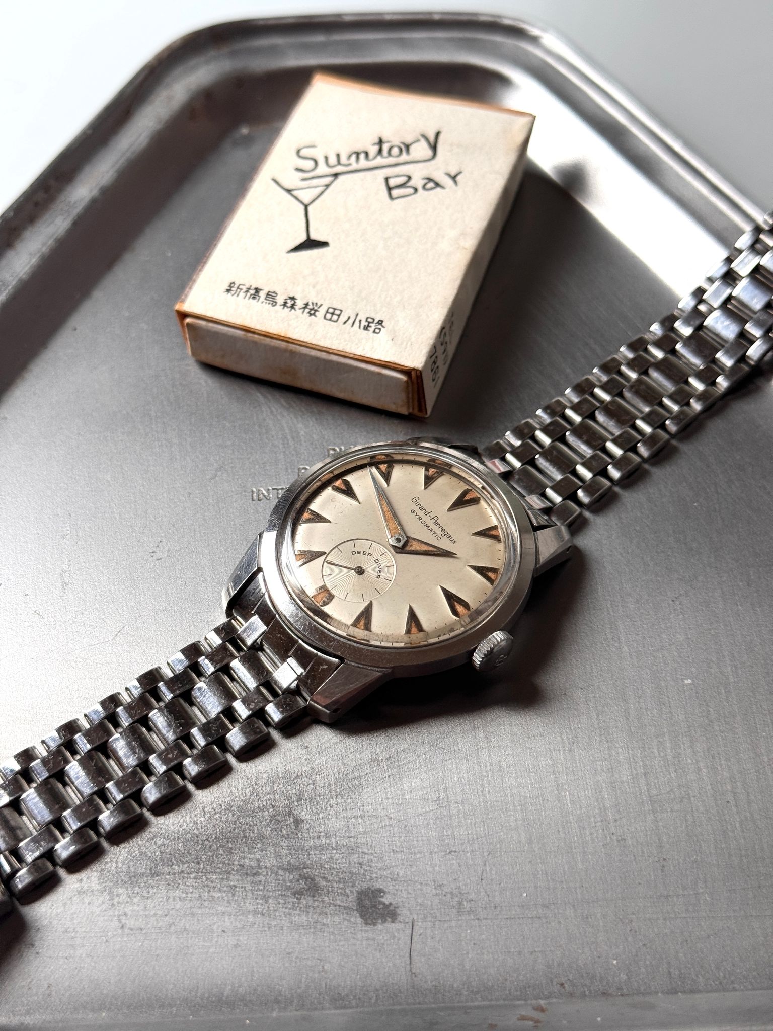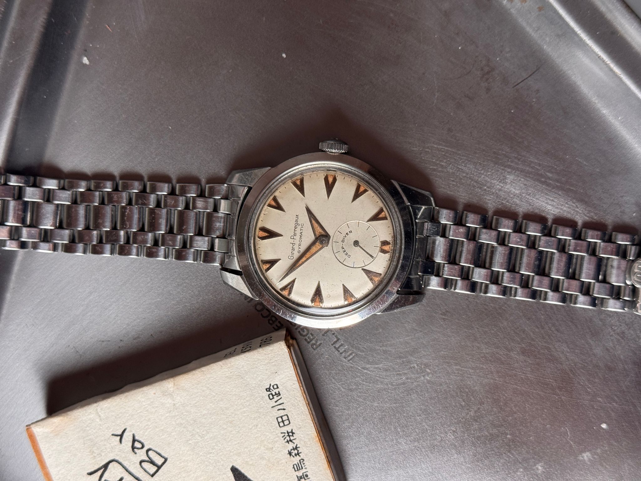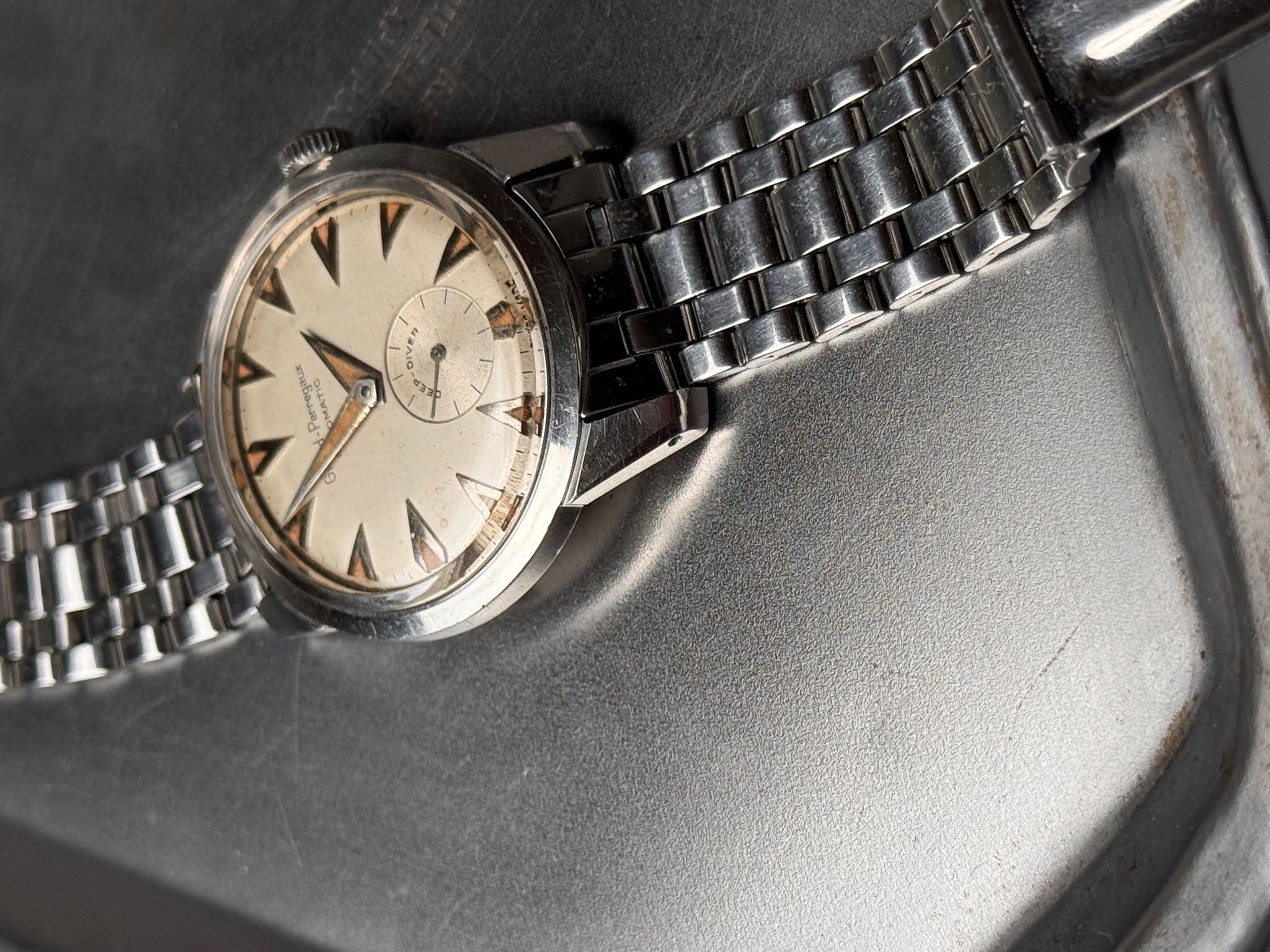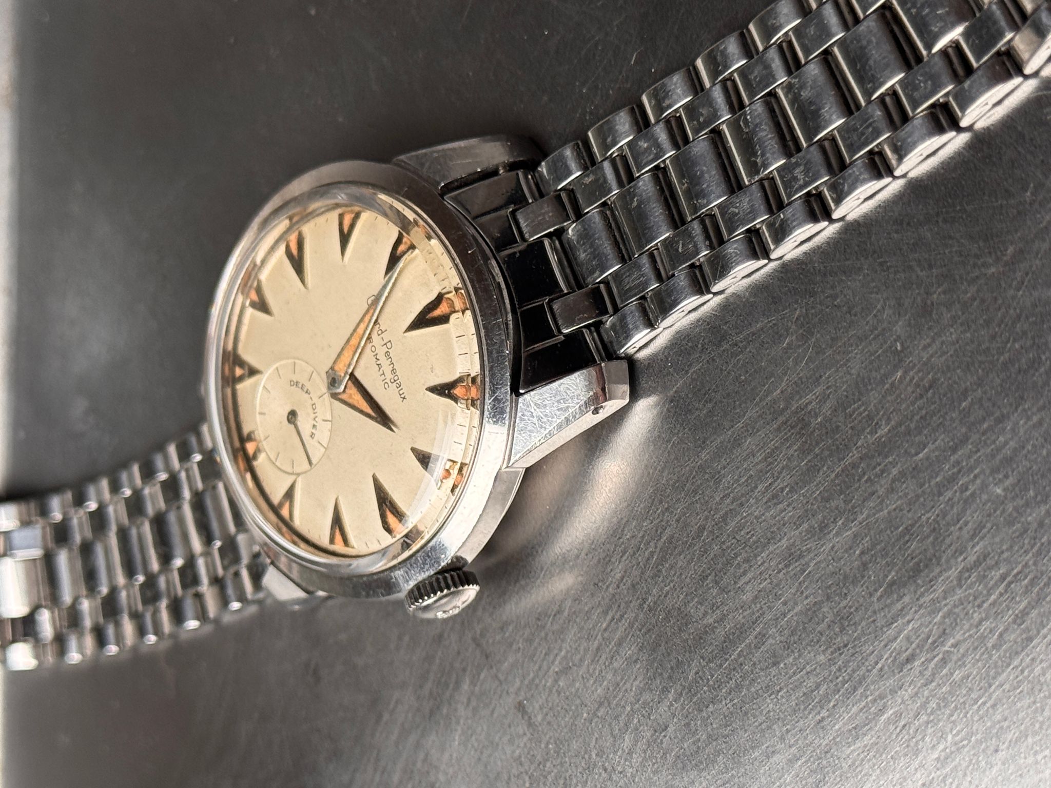 This Gyromatic Deep Diver is a rare watch. I am not sure there is more than a handful out there. But this is not what makes this watch desirable. What makes it appealing is its one of a kind eclectic design. The inspiration comes from nowhere and it unlikes anything we already know. The shapes of the hands and indexes are unique to this watch. The condition is rare and this is probably the only one available out there. Cherry on top of the cake, it comes with its original GP signed Gay Frères bracelet.