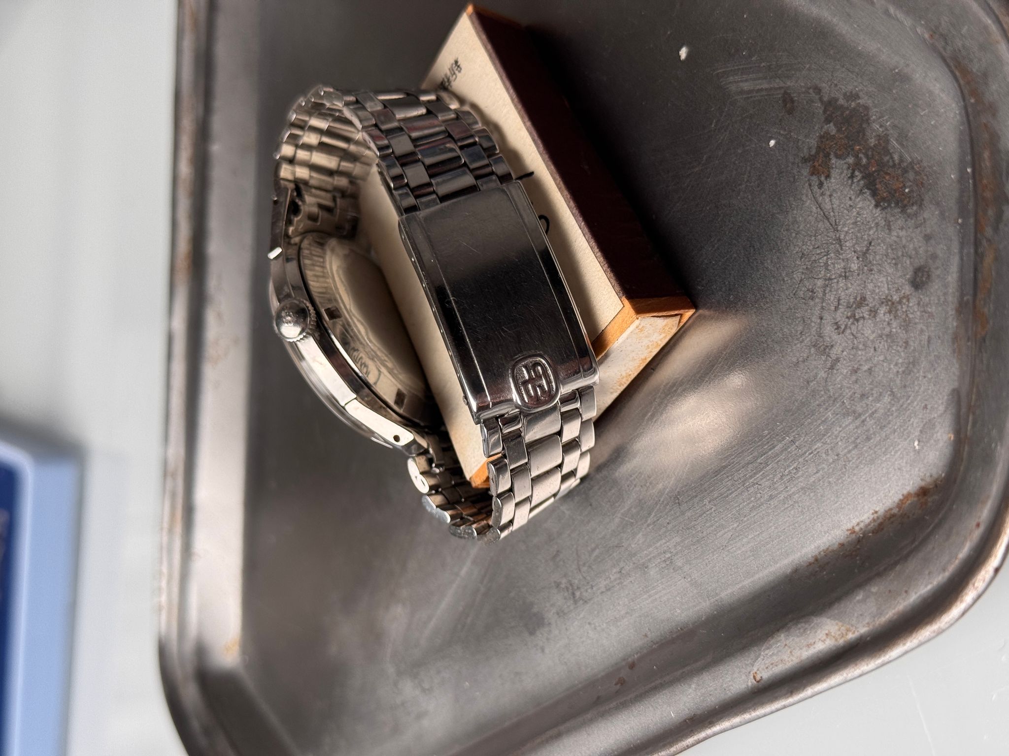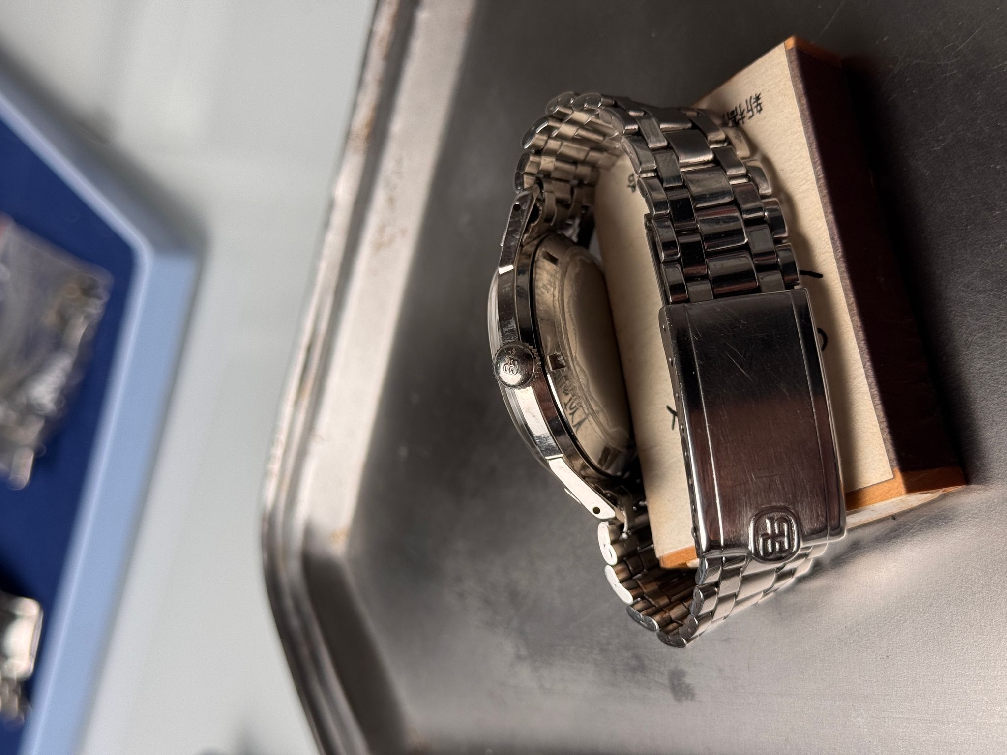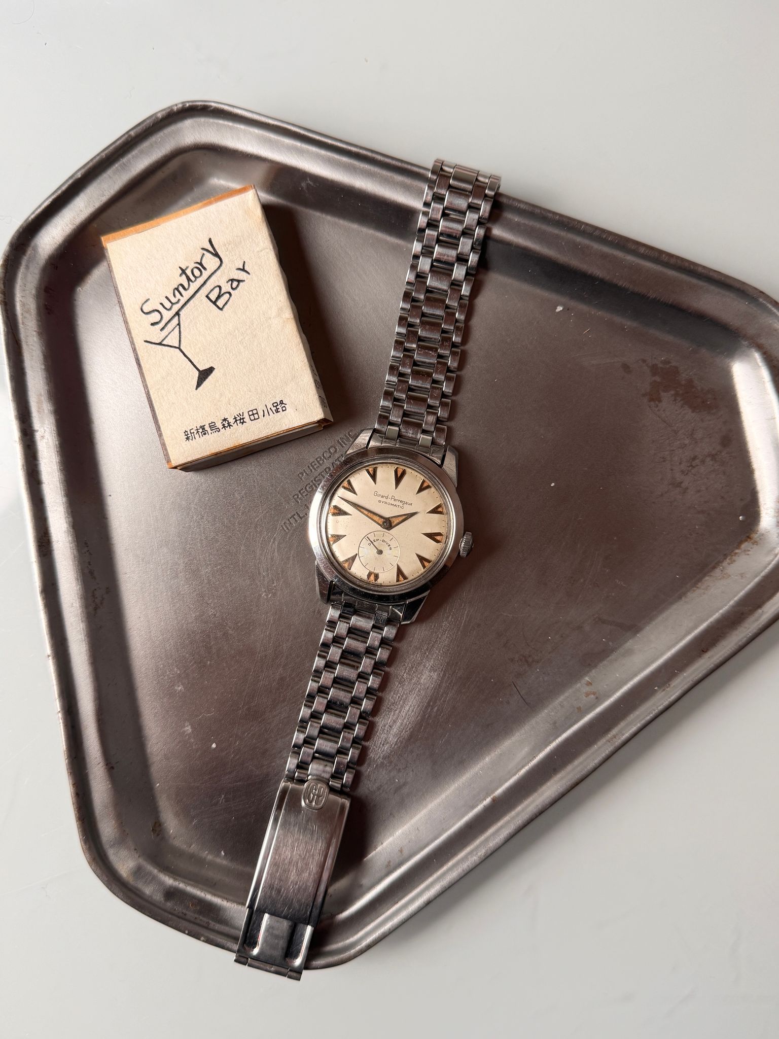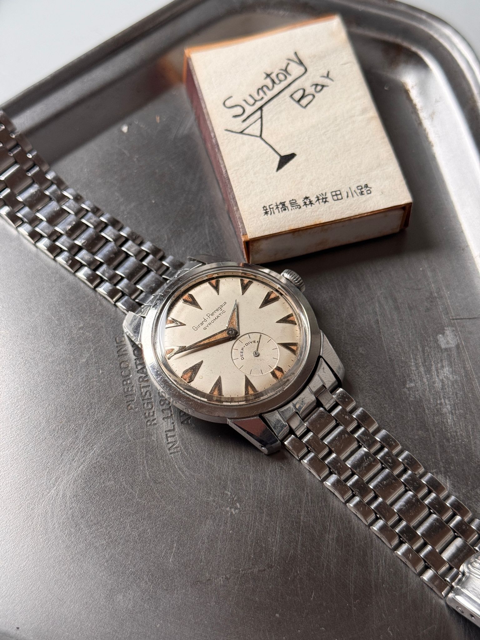 This Gyromatic Deep Diver is a rare watch. I am not sure there is more than a handful out there. But this is not what makes this watch desirable. What makes it appealing is its one of a kind eclectic design. The inspiration comes from nowhere and it unlikes anything we already know. The shapes of the hands and indexes are unique to this watch. The condition is rare and this is probably the only one available out there. Cherry on top of the cake, it comes with its original GP signed Gay Frères bracelet.