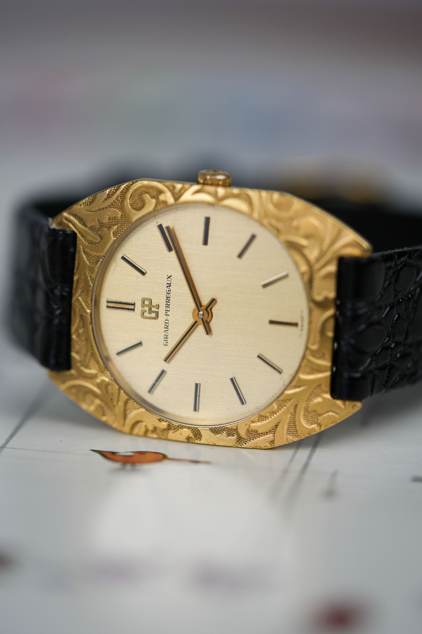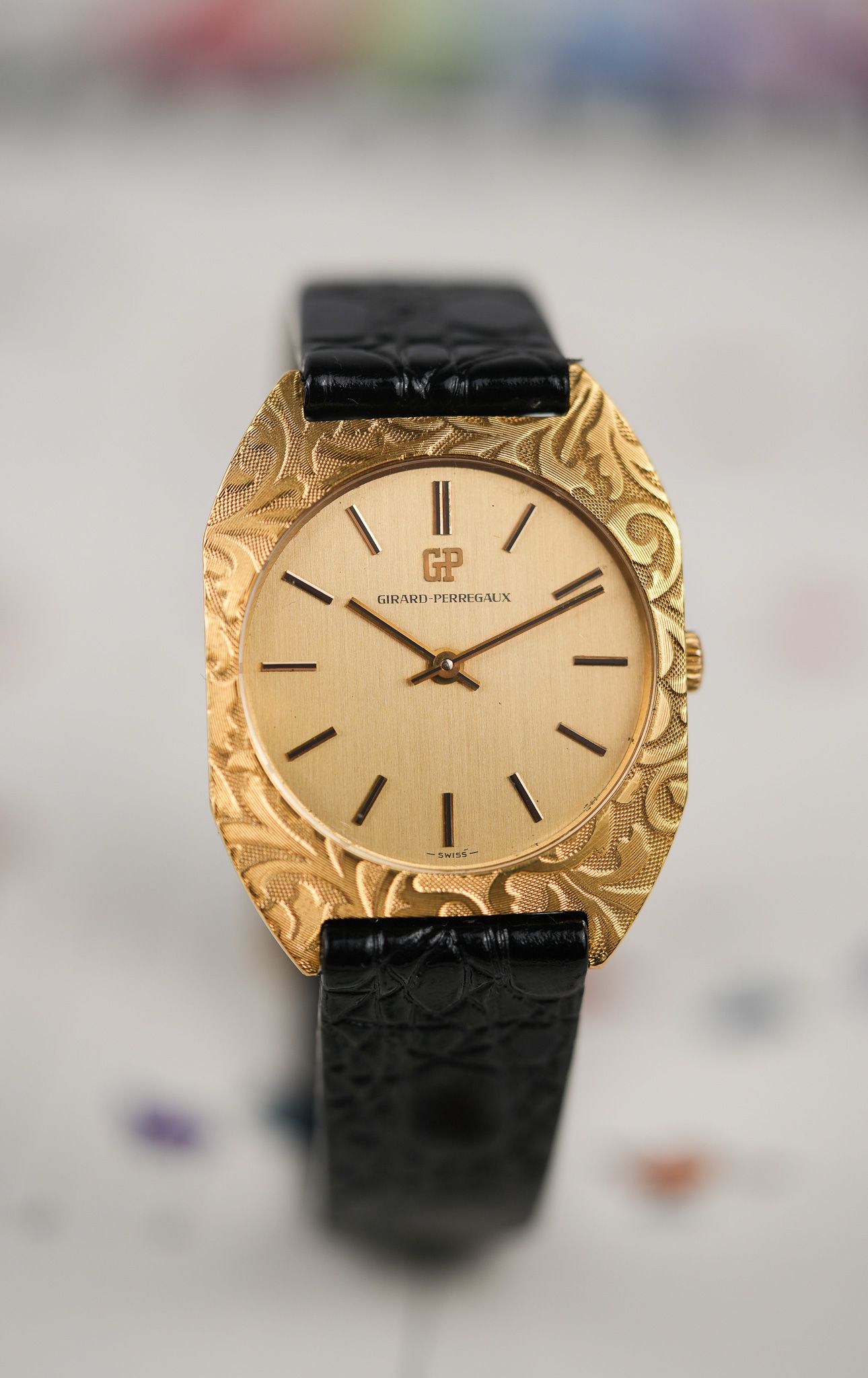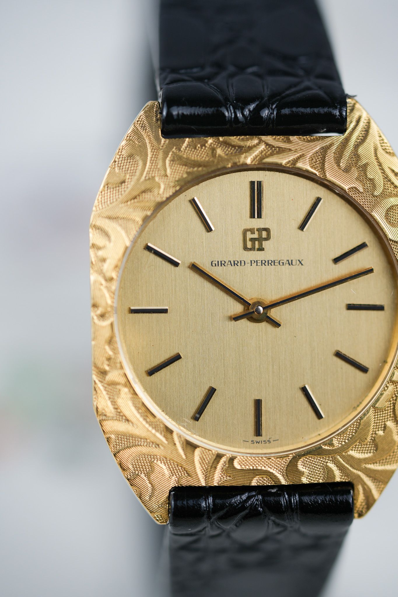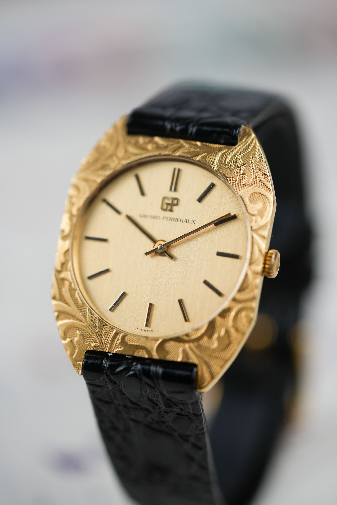 We’ve paired it with a black leather strap featuring a crocodile embossing, chosen specifically to complement the floral bezel patterns. It also comes with a gold-plated GP buckle from the era, tying the piece together with period-correct finishing touches.