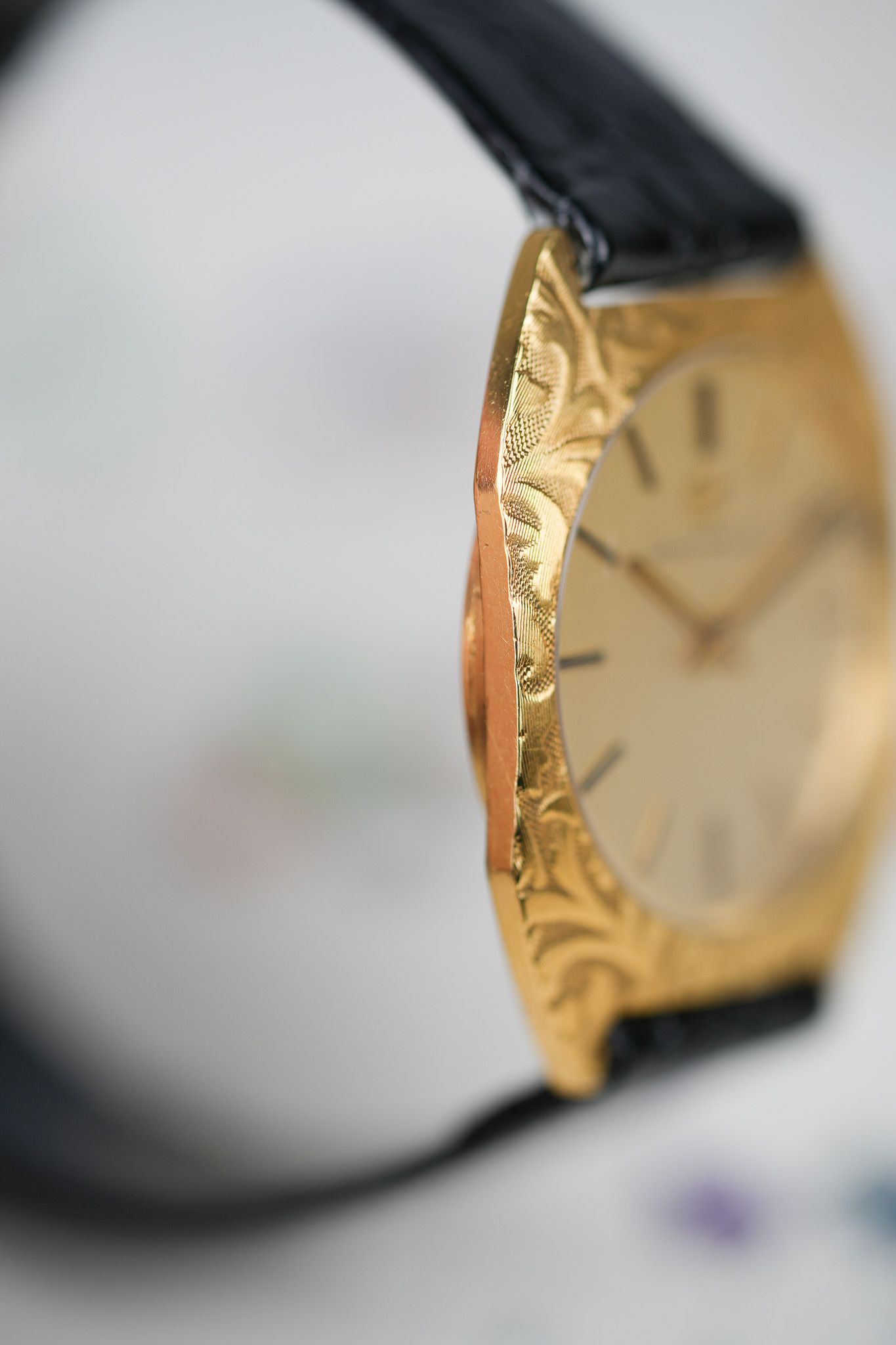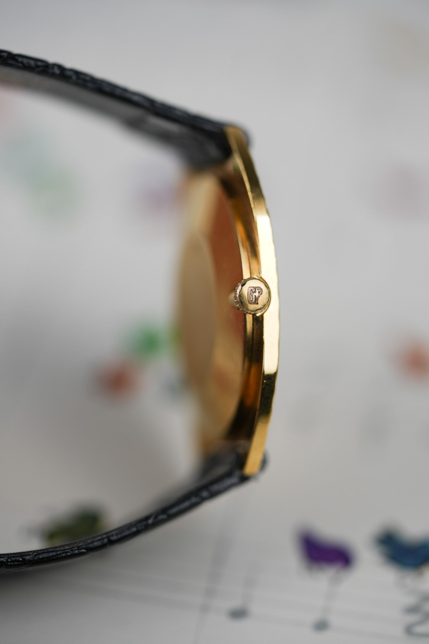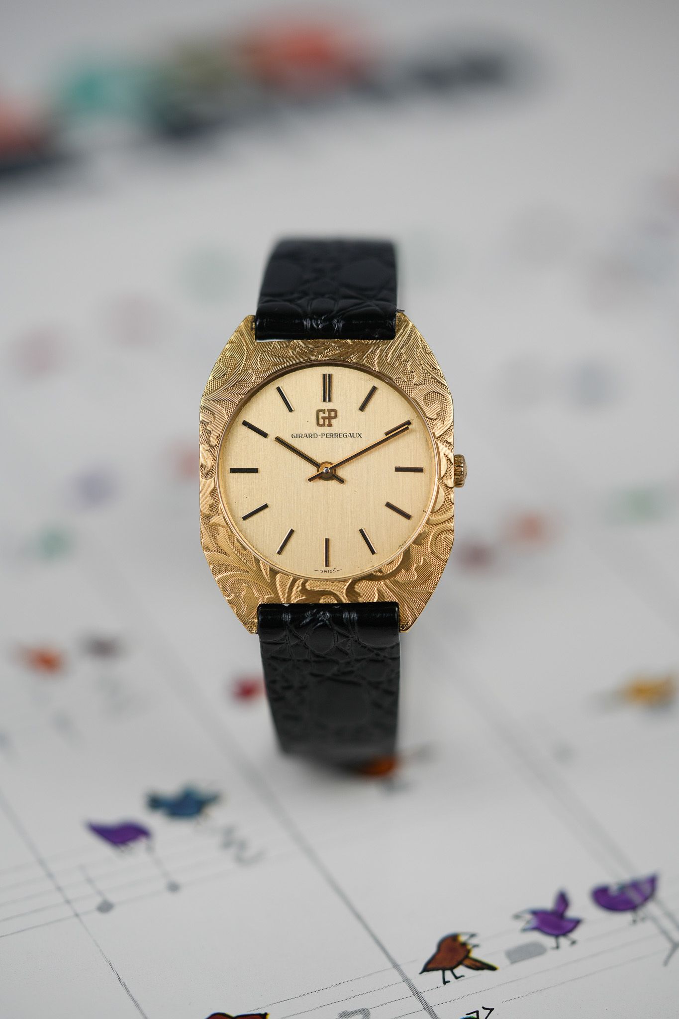 We’ve paired it with a black leather strap featuring a crocodile embossing, chosen specifically to complement the floral bezel patterns. It also comes with a gold-plated GP buckle from the era, tying the piece together with period-correct finishing touches.