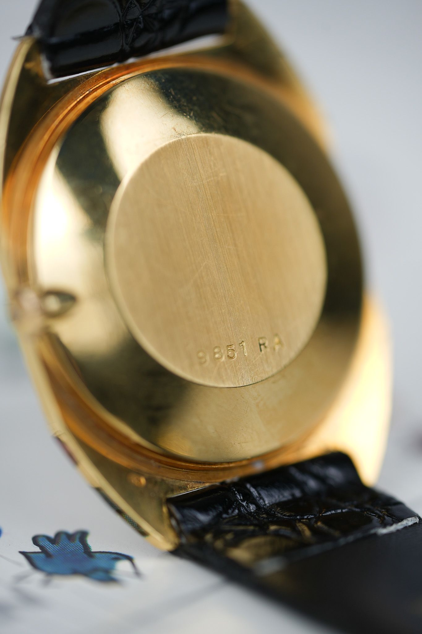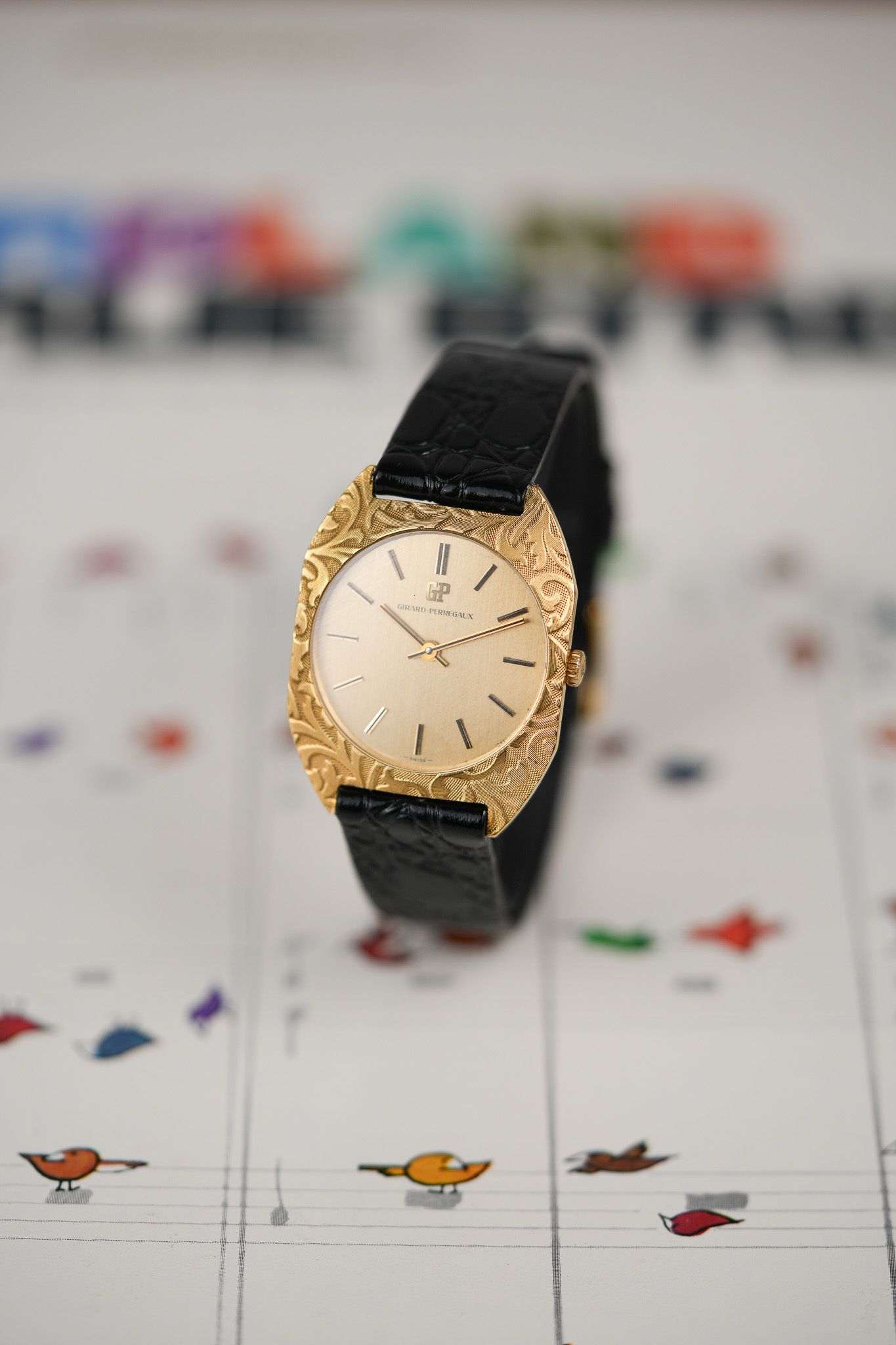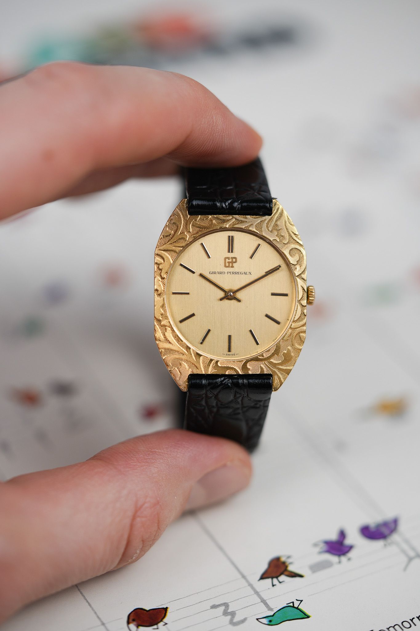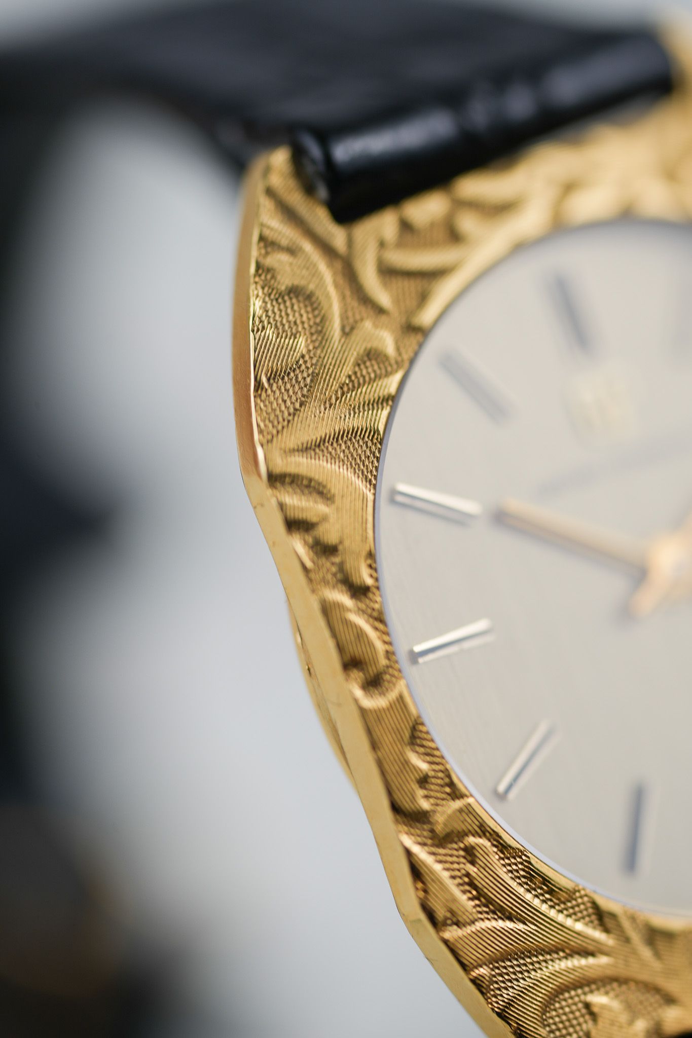 We’ve paired it with a black leather strap featuring a crocodile embossing, chosen specifically to complement the floral bezel patterns. It also comes with a gold-plated GP buckle from the era, tying the piece together with period-correct finishing touches.