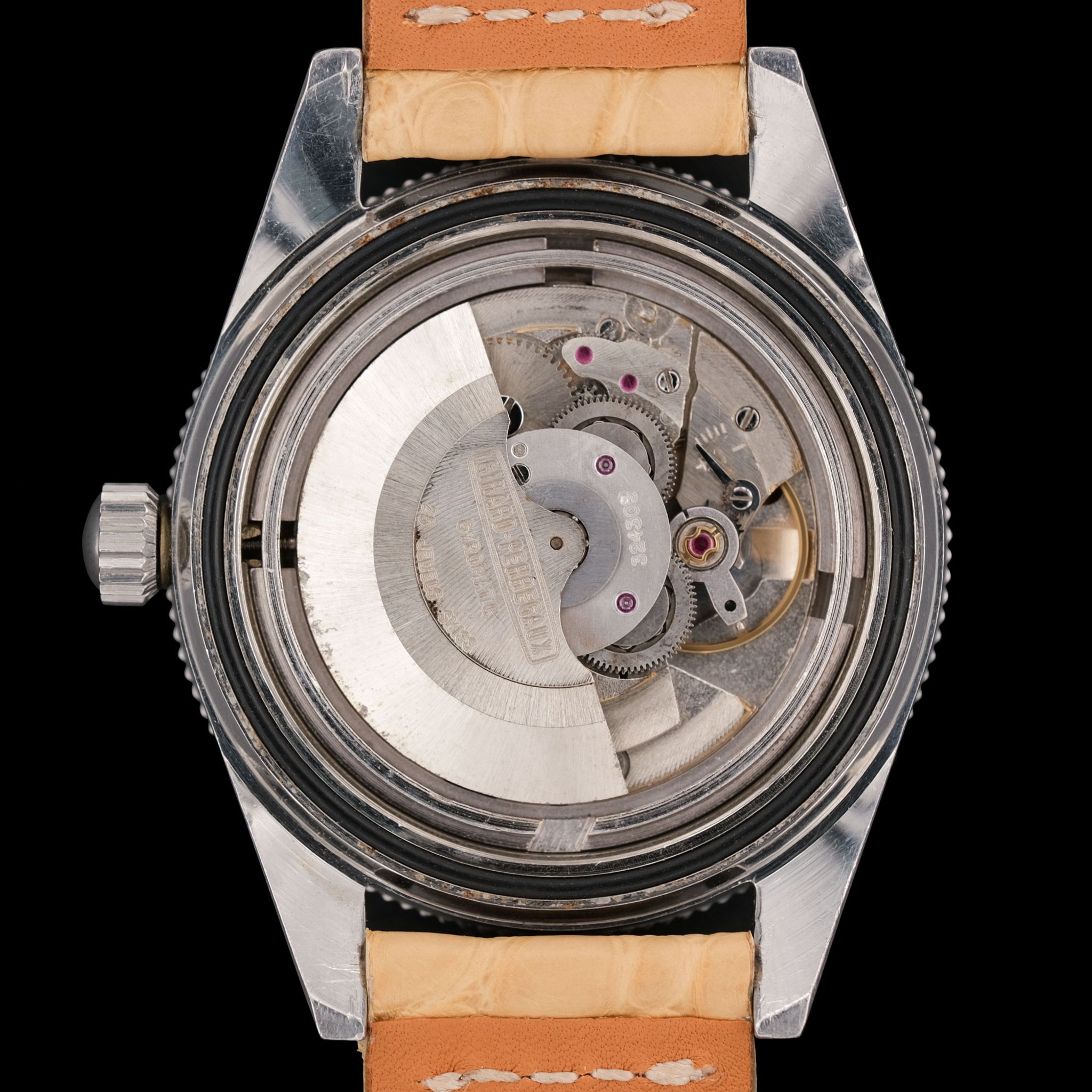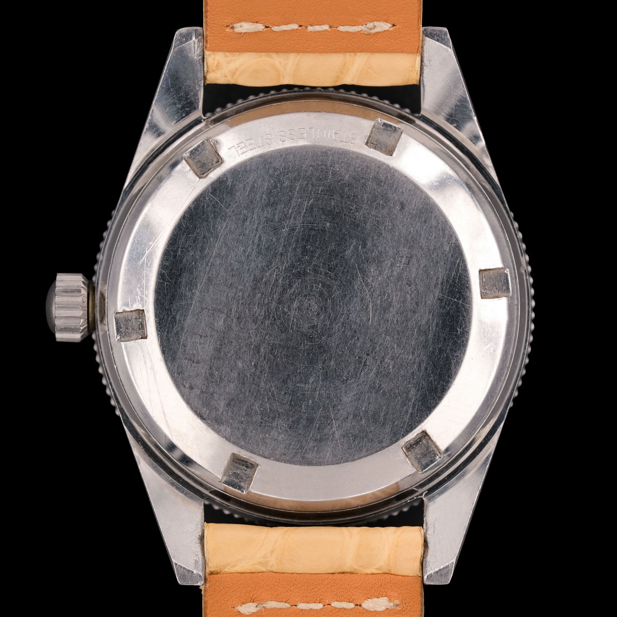 An extremely rare and interesting Girard Perregaux Deep Diver Gyromatic ref 8867V from the 1966. Exactly, 400 pieces of the 8867 V were made In 1966 and 1000 pieces of the 8867 W in 1967, totaling 1400 reference 8867 V/W watches. Another interesting detail is that the Jaeger-LeCoultre E 857 Deep Sea Alarm, Omega 2913 Seamaster, and Favre-Leuba 59603 Deep Blue, they all use the same case design either manufactured by HF – Huguenin Fréres or EPAS – E. Piquerez S.A.