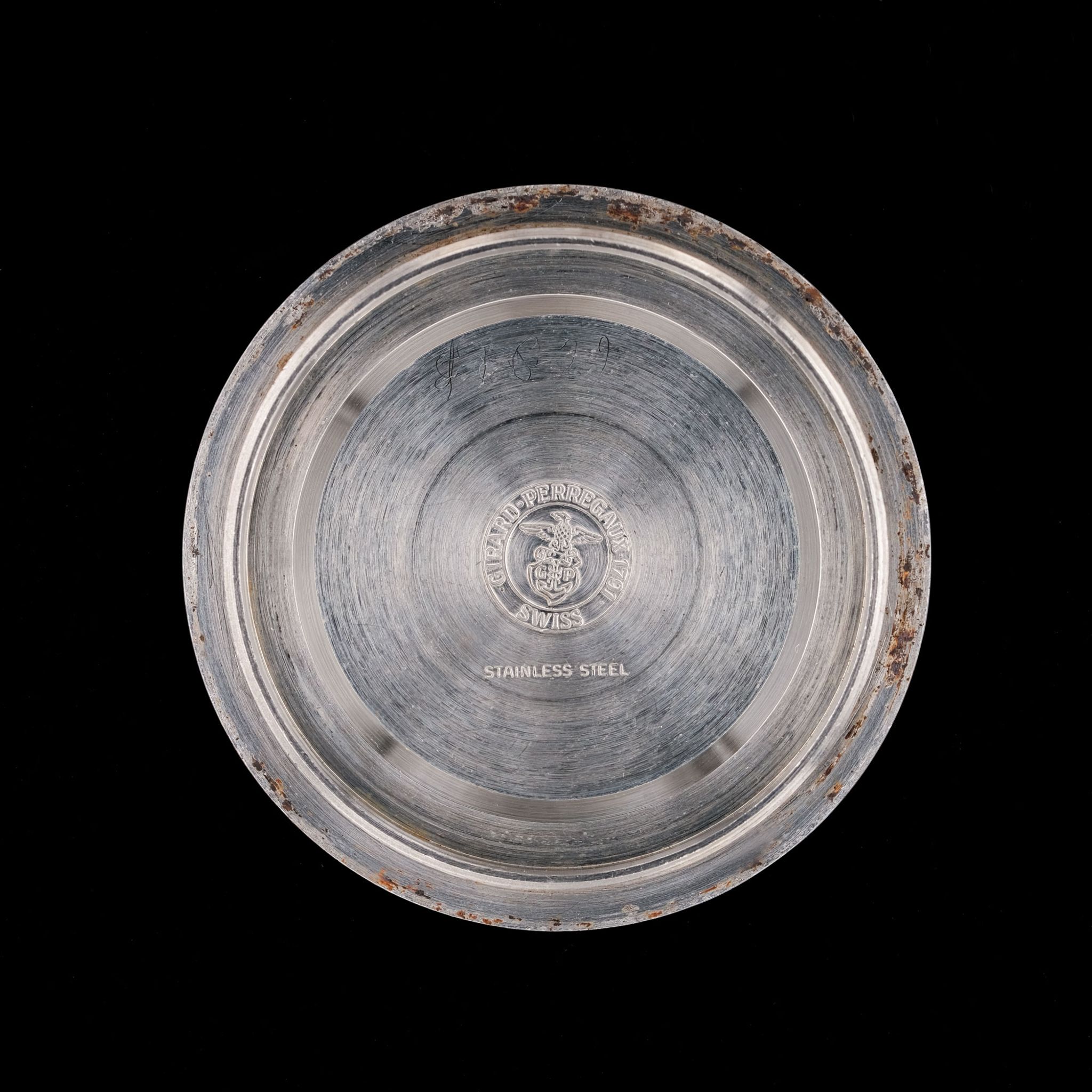 This watch features a 38.5mm stainless steel case with a screw-down back and a wide rotating black acrylic bezel. The watch also has the original non-screw-down GP non-signed crown. The original matte dial is in beautiful condition, with painted tritium hour markers and slender original hands. The 6, 9, and 12 dial markers have a distinctive, stylized font. It is powered by a self-winding movement with a date function. The watch has been fully serviced and remains in its original, unpolished condition.