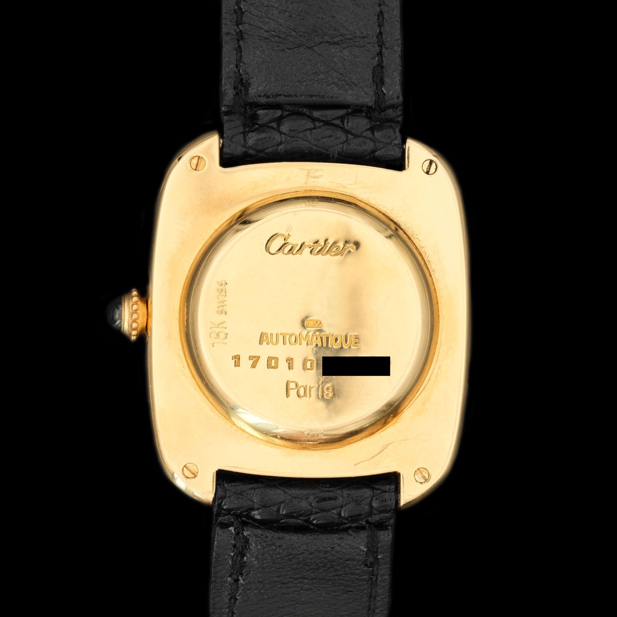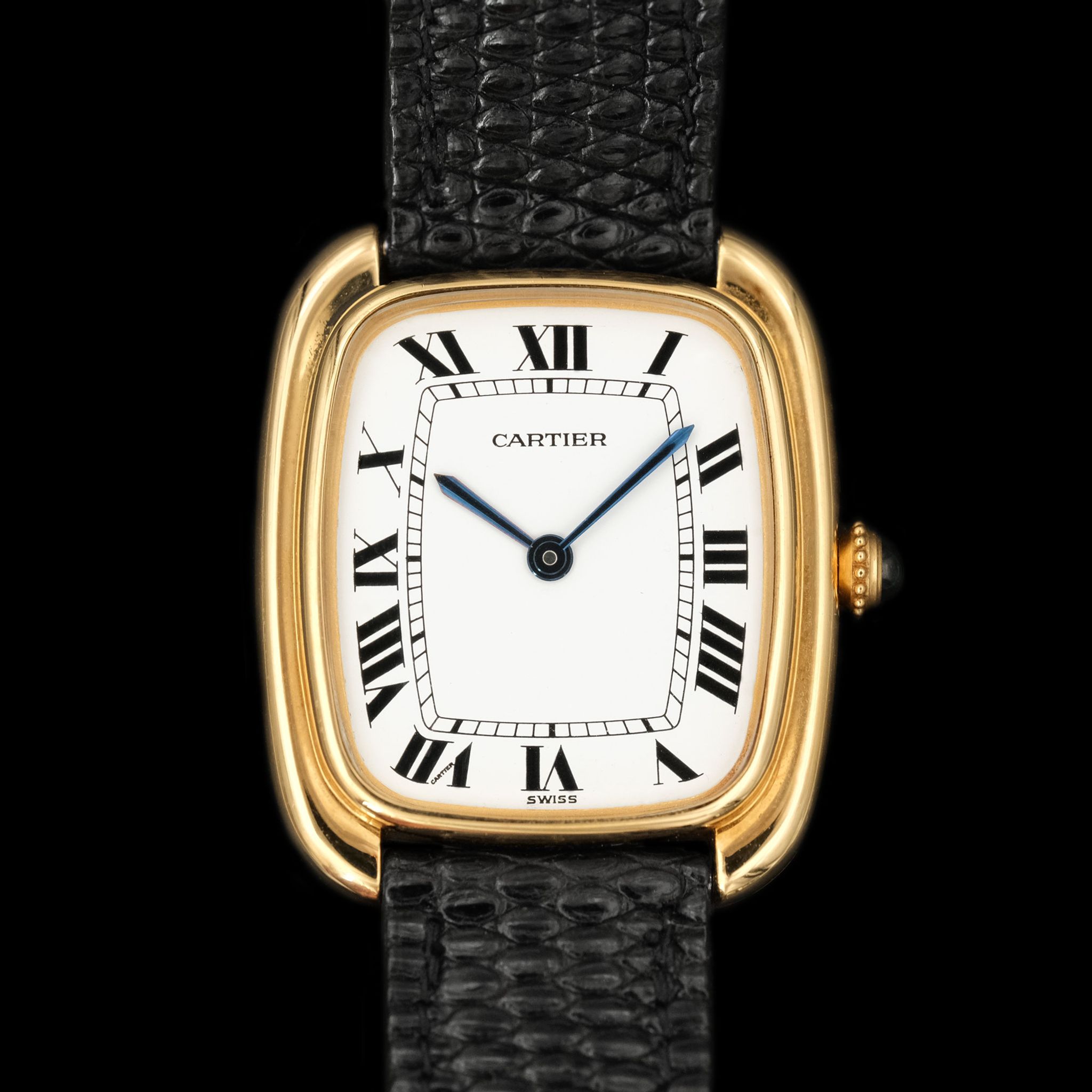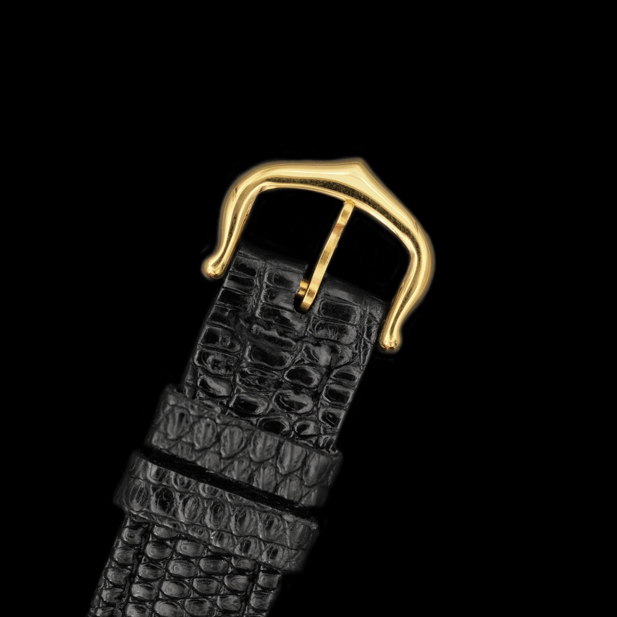 The Cartier Gondole Vertical. Launched as part of the Louis Cartier collection in 1972 whereby a handful of the brand’s famous designs were relaunched, and some new designed were introduced, the Gondole takes the design tenets of other watches and repurposes them in an unconventional format. While there is the Gondole Ellipse, there is also the Gondole Vertical, as we have here, with its rounded rectangular 18kt yellow gold case that recalls the Tank’s rectangular shape, but with rounded corners, soft sides and a deeply stepped bezel that adds some obvious visual distinction from other Cartier models. Featuring the watchmaker’s signature dial design with the sought-after and rare “Swiss” marking at 6 o’clock alongside the brand’s black Roman numerals, blued steel hands and “chemin de fer” minute track.