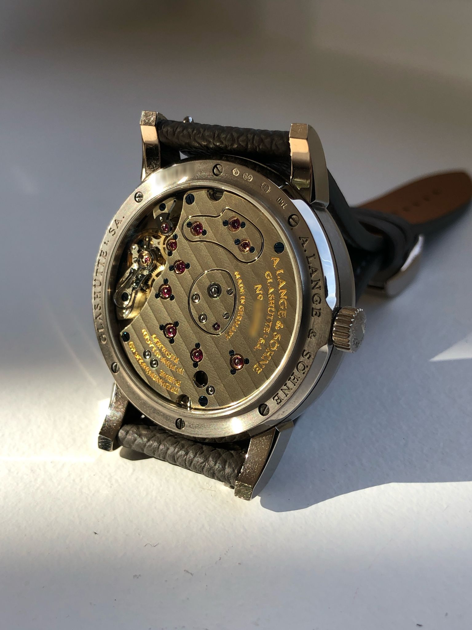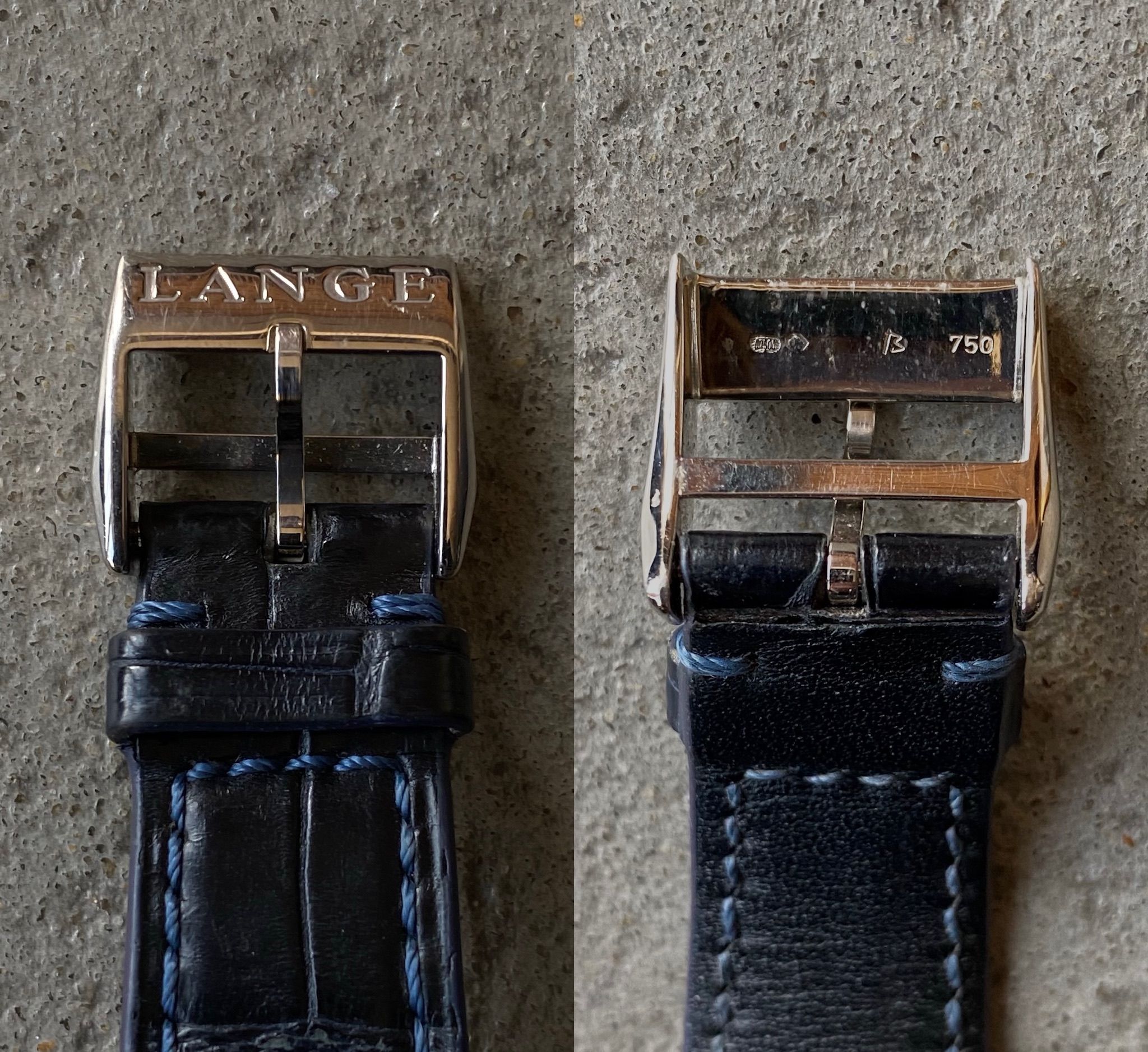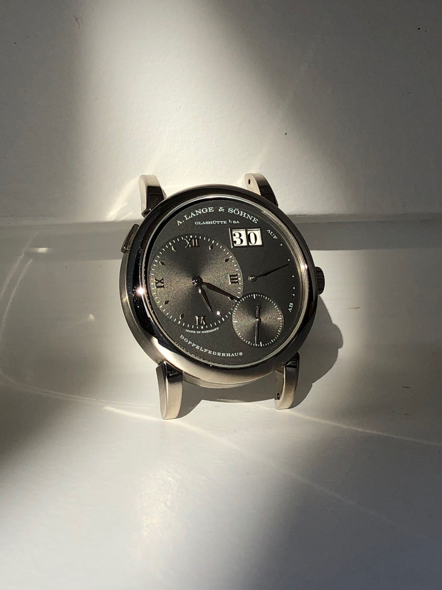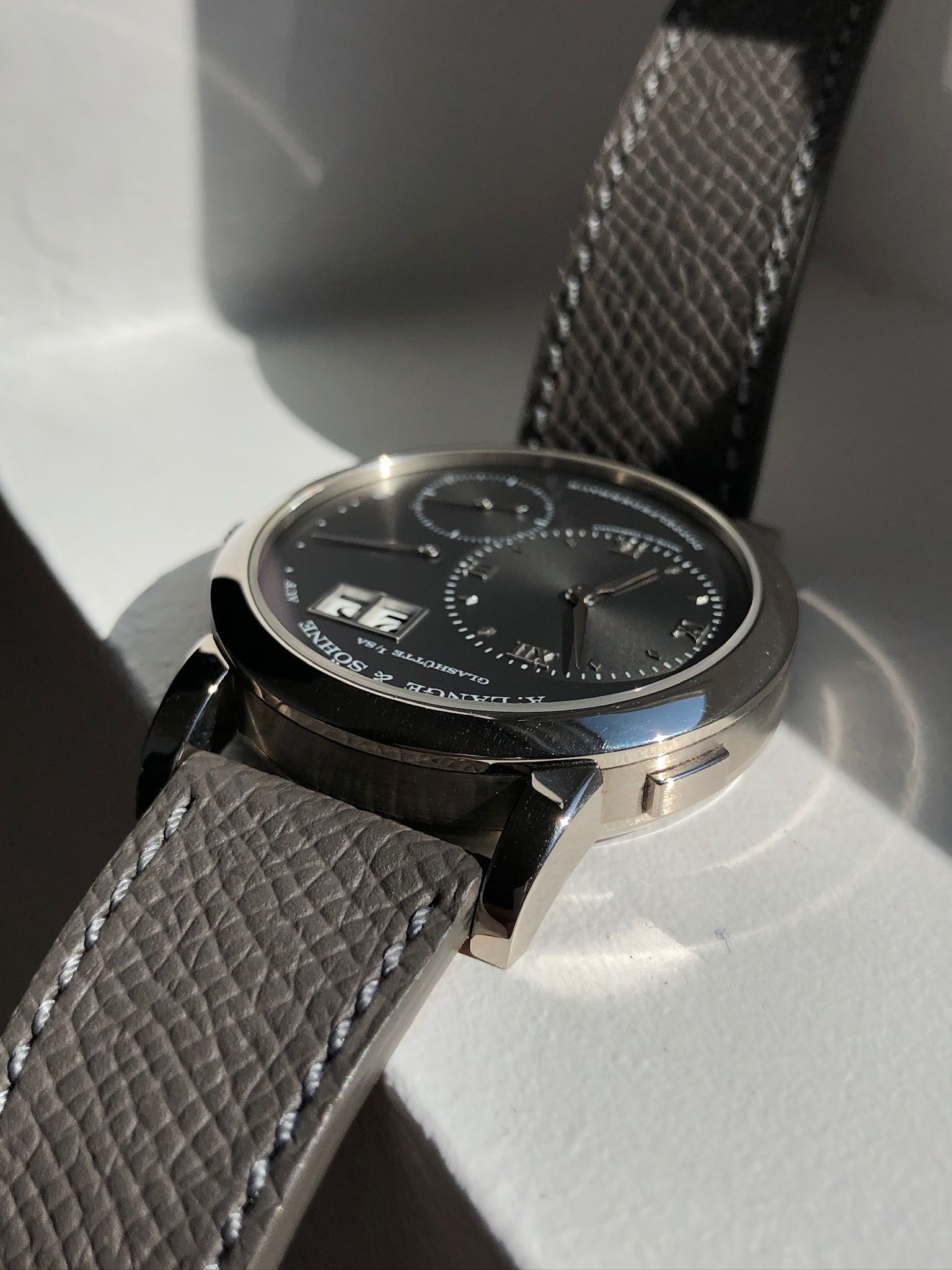 Bracelet: Original A.Lange & Söhne black leather with the white gold buckle engraved « LANGE ». If anything this is not the best part of the watch and we changed for an additional light grey grained or saffiano leather strap.