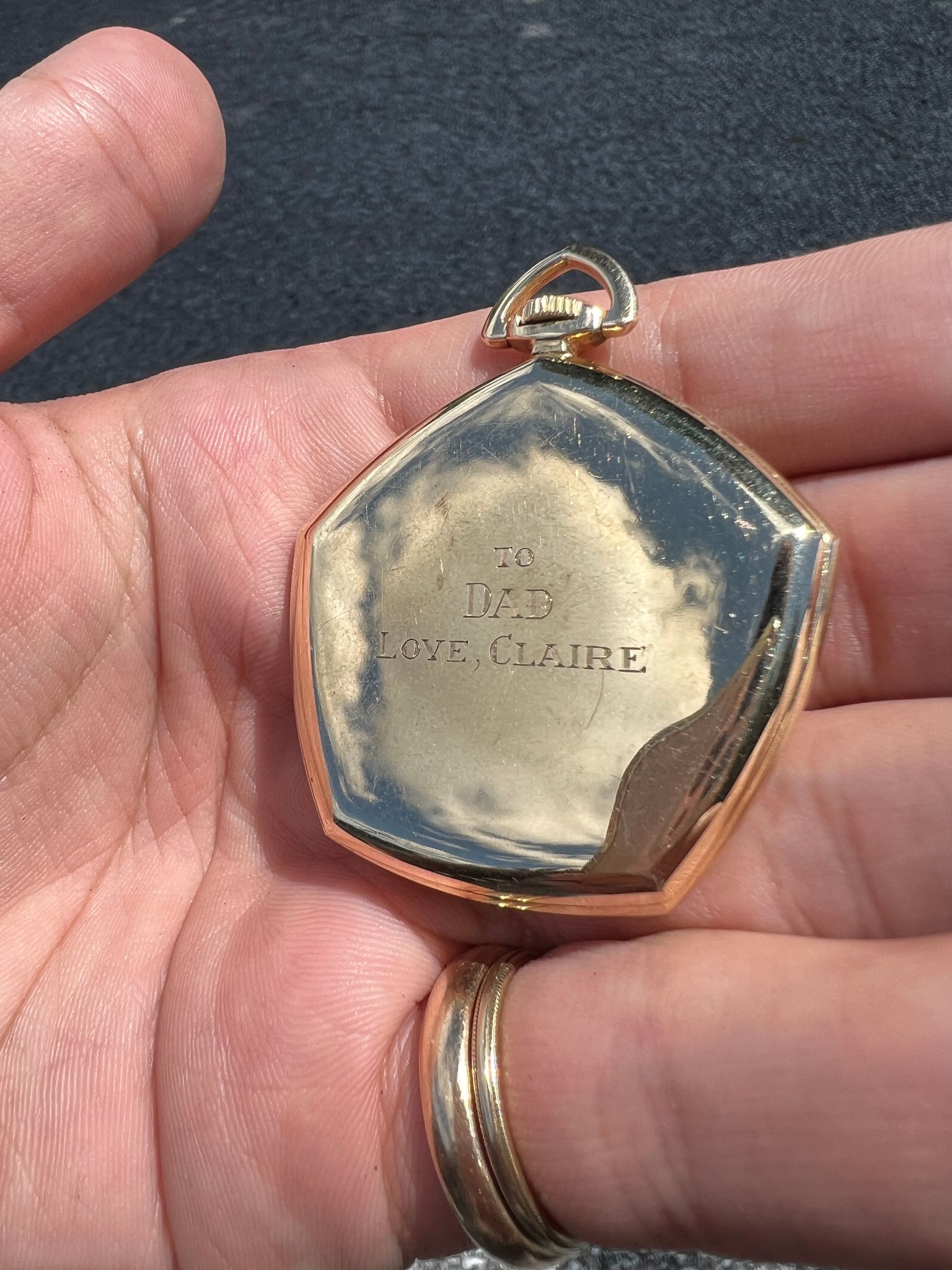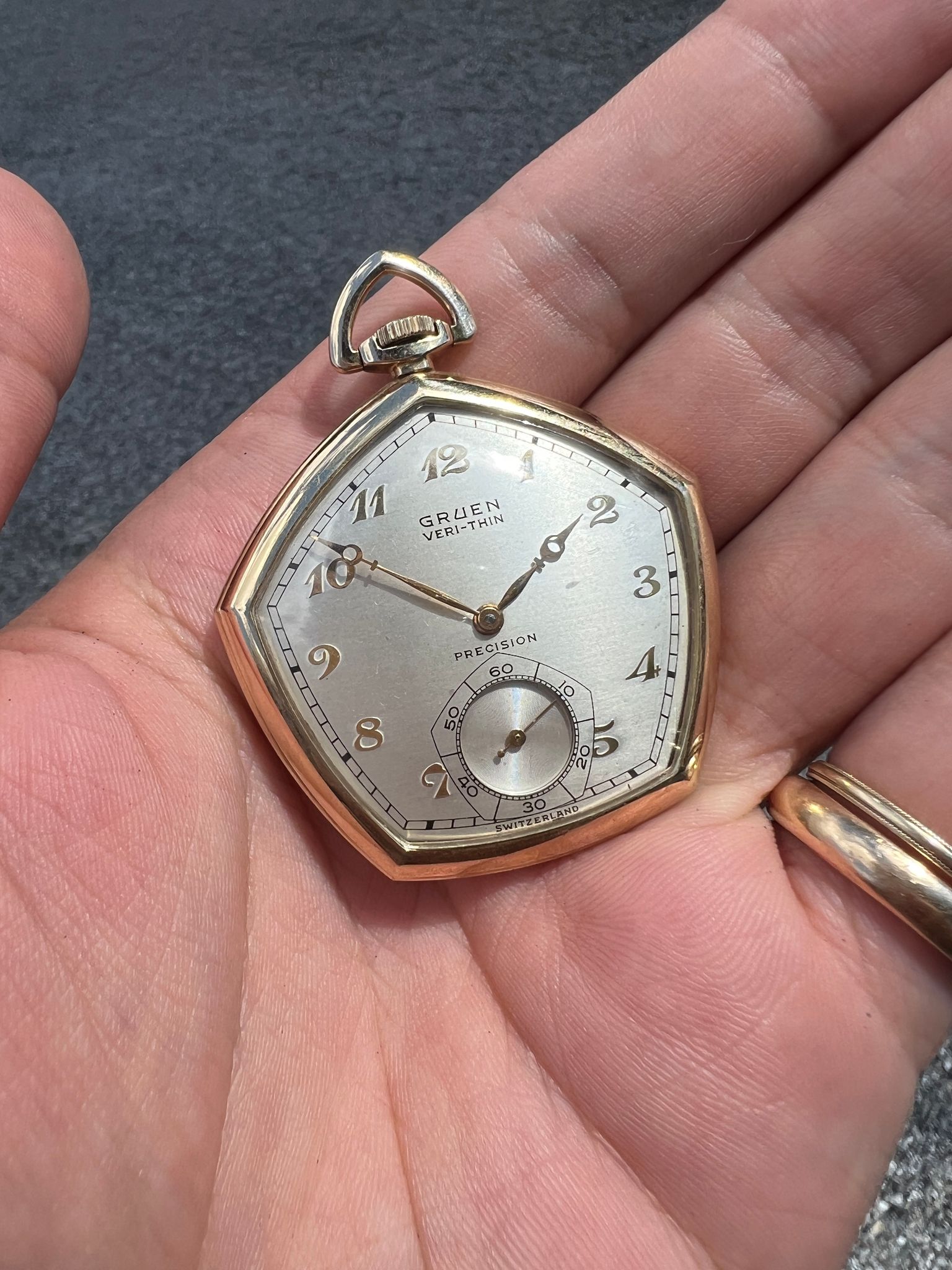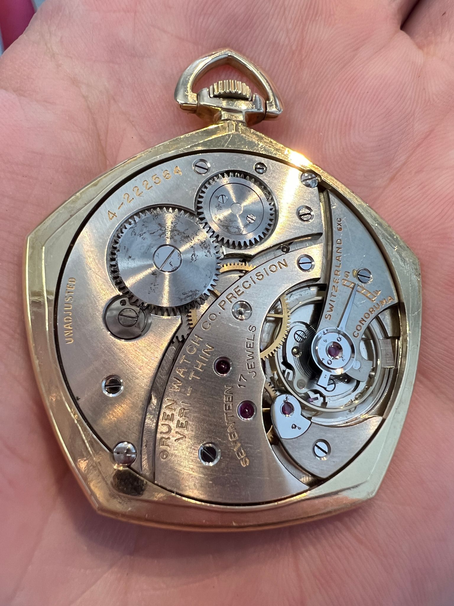 Shown here is a Gruen Veri-Thin pocket watch in a funky 10k Gold Filled Pentagon shaped case.