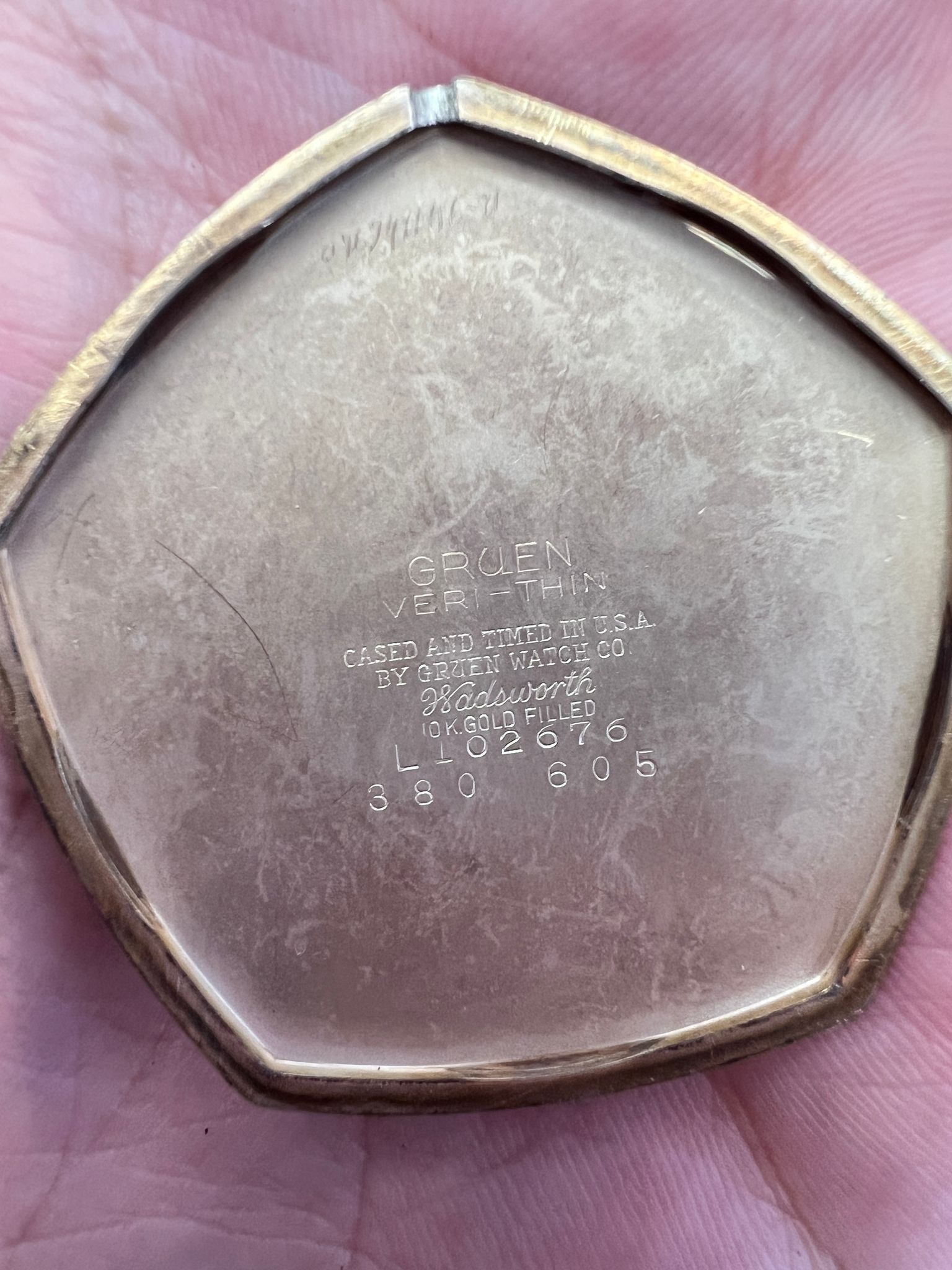 Gruen made these pentagon watches in solid gold as well as the gold plated cases such as this one, with either round dials or pentagonal ones like this example.