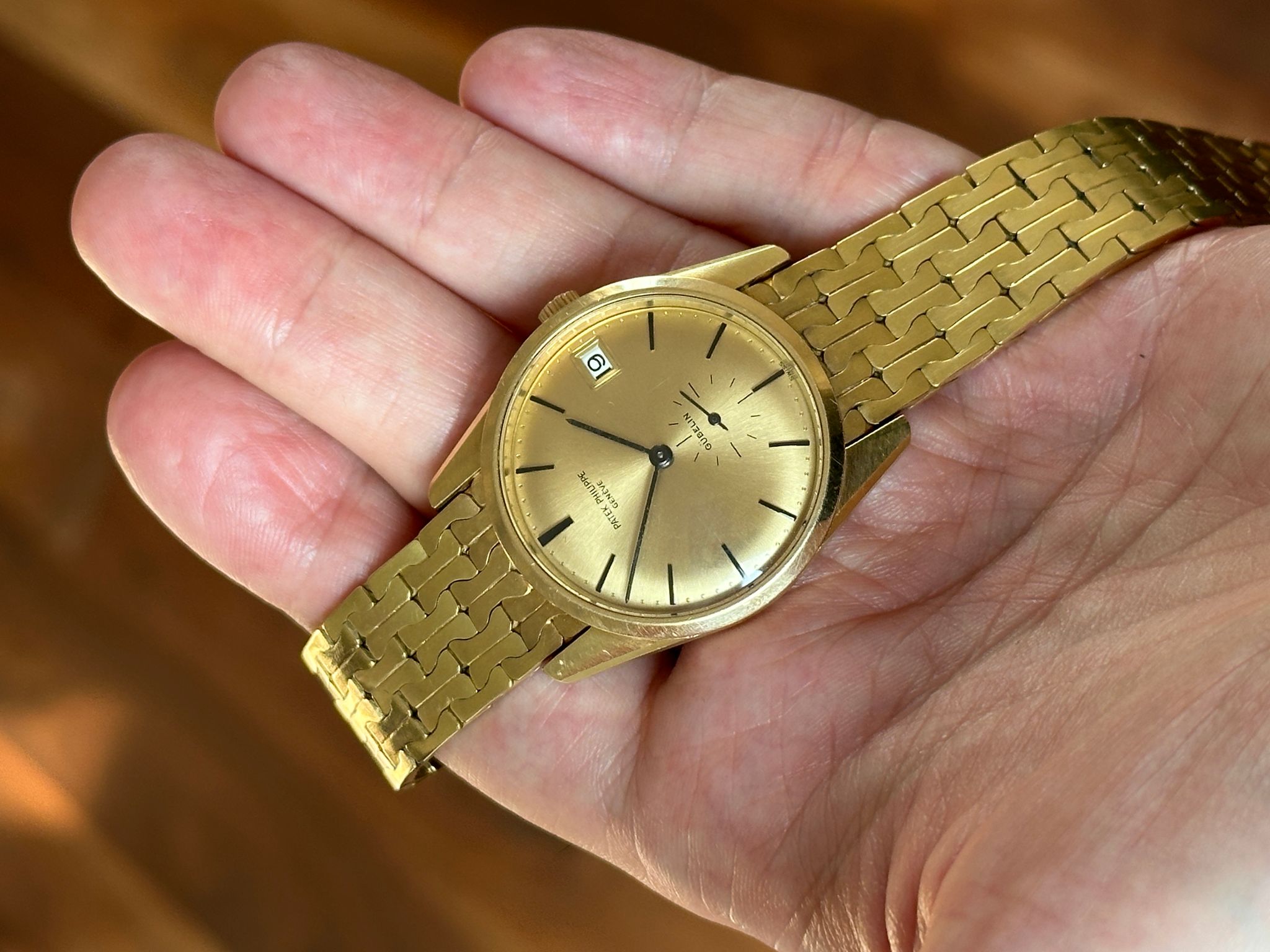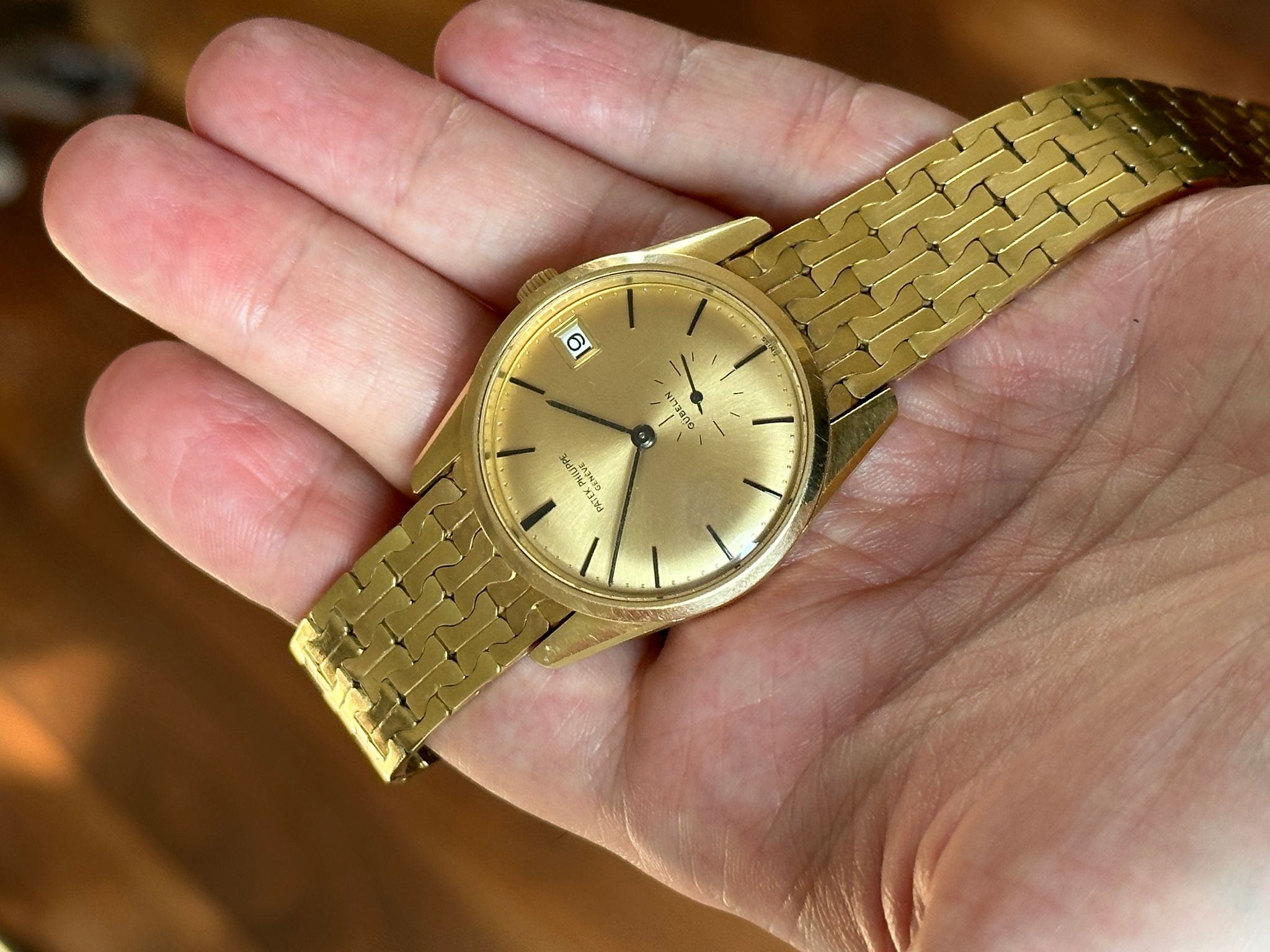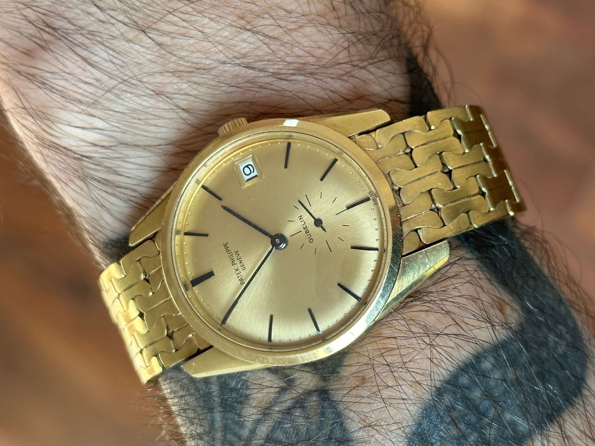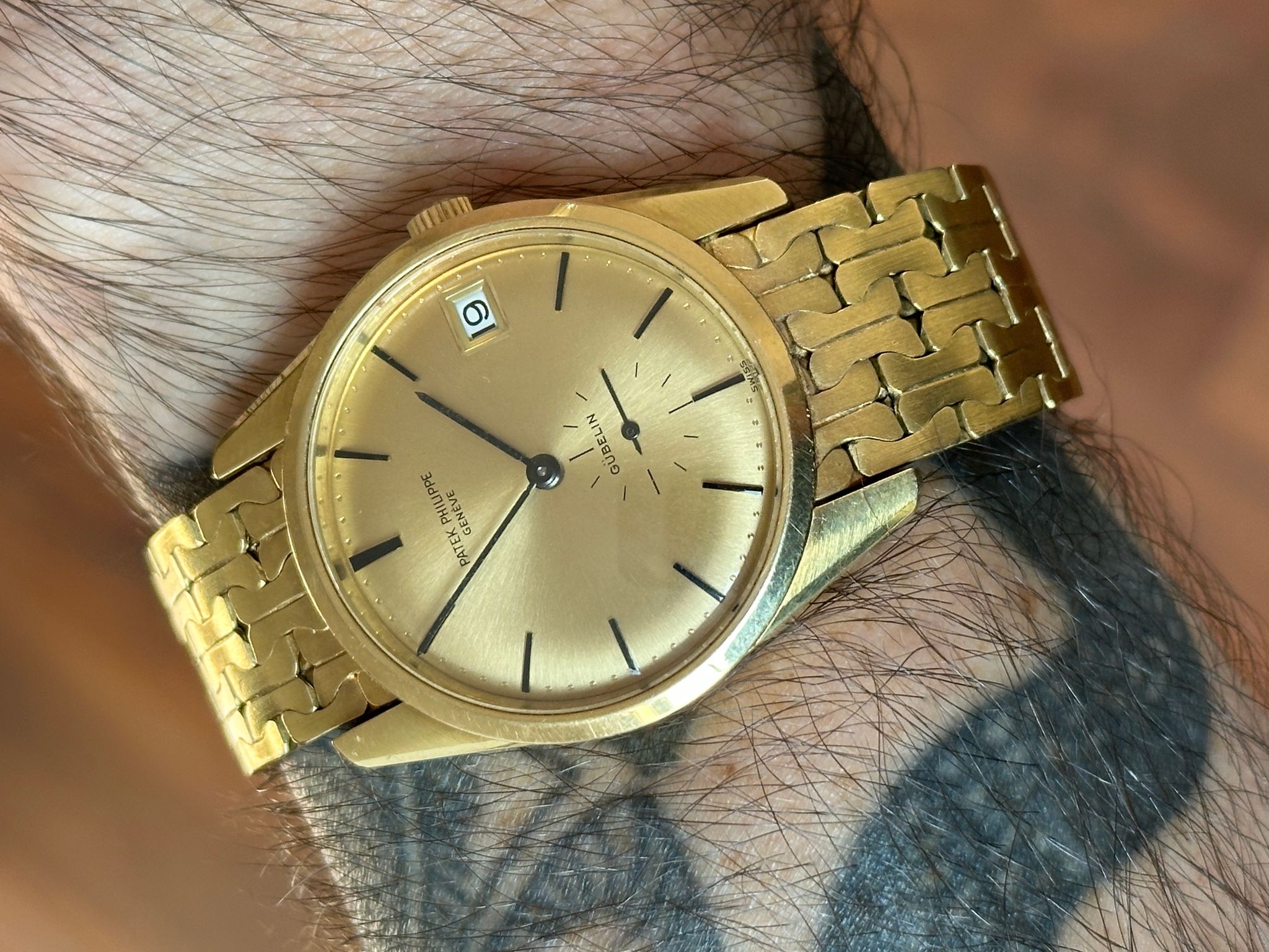 A rare Calatrava offering incredible value. This is an automatic, 1970s, 34mm reference 3558 not only retailed and signed by famous retailer Gubelin, but also including an 18k gold bracelet made by Gubelin (with all the hallmarks) especially for this watch. Dial is flawless. Stunning condition, please see photos (any spots on dial are just bright spots in the photos, dial is perfect). Wears incredibly on the wrist. A show stopper.