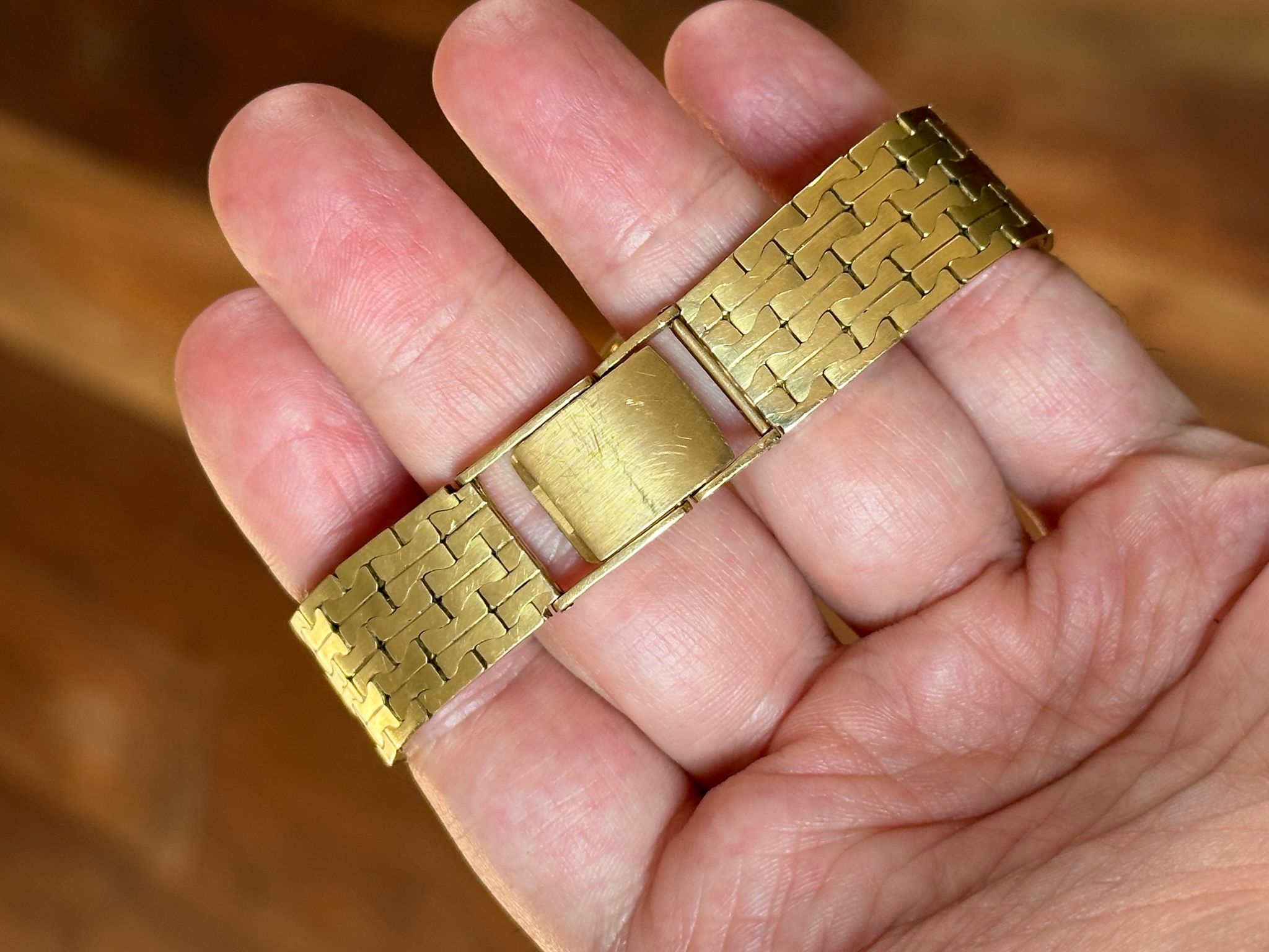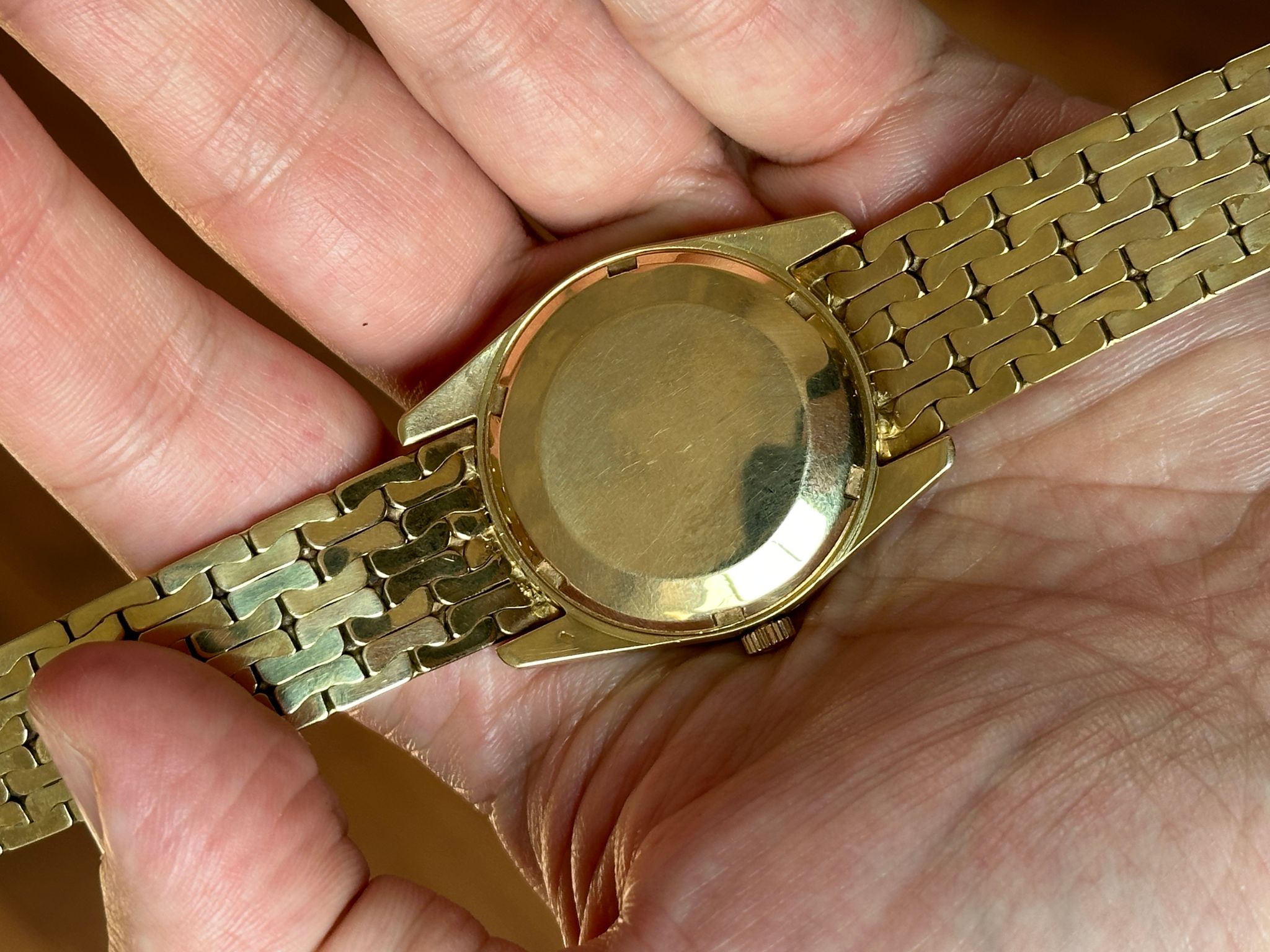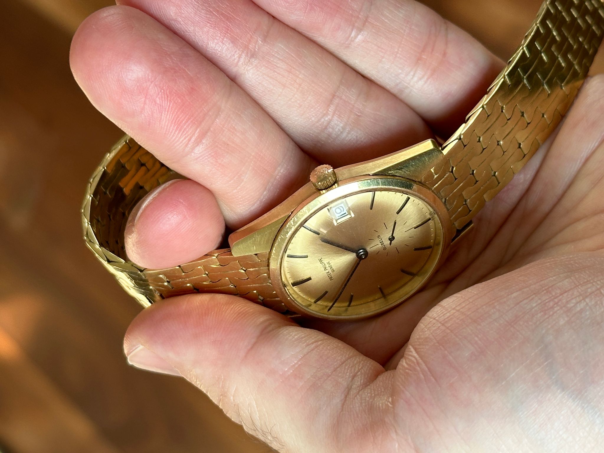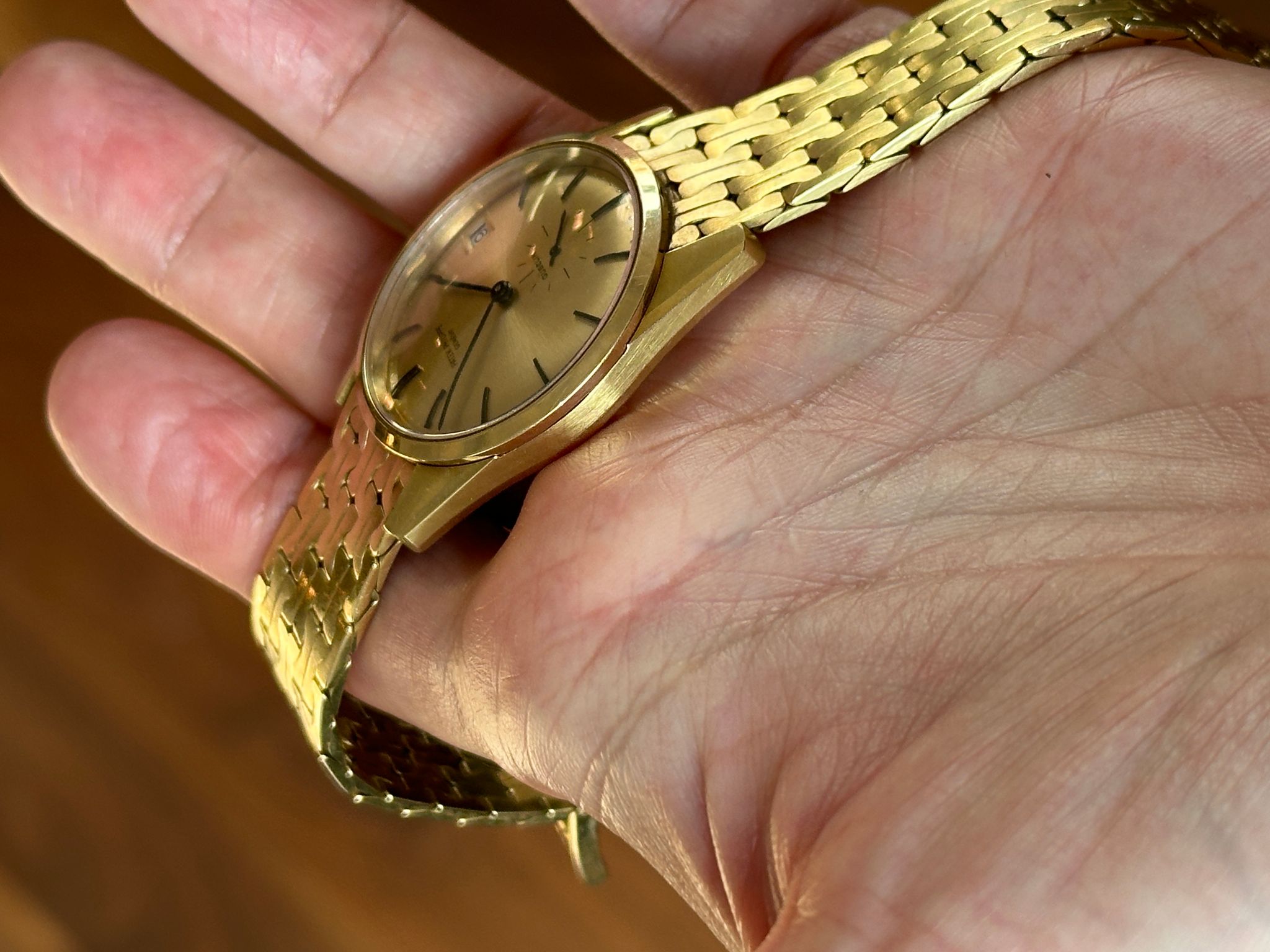A rare Calatrava offering incredible value. This is an automatic, 1970s, 34mm reference 3558 not only retailed and signed by famous retailer Gubelin, but also including an 18k gold bracelet made by Gubelin (with all the hallmarks) especially for this watch. Dial is flawless. Stunning condition, please see photos (any spots on dial are just bright spots in the photos, dial is perfect). Wears incredibly on the wrist. A show stopper.