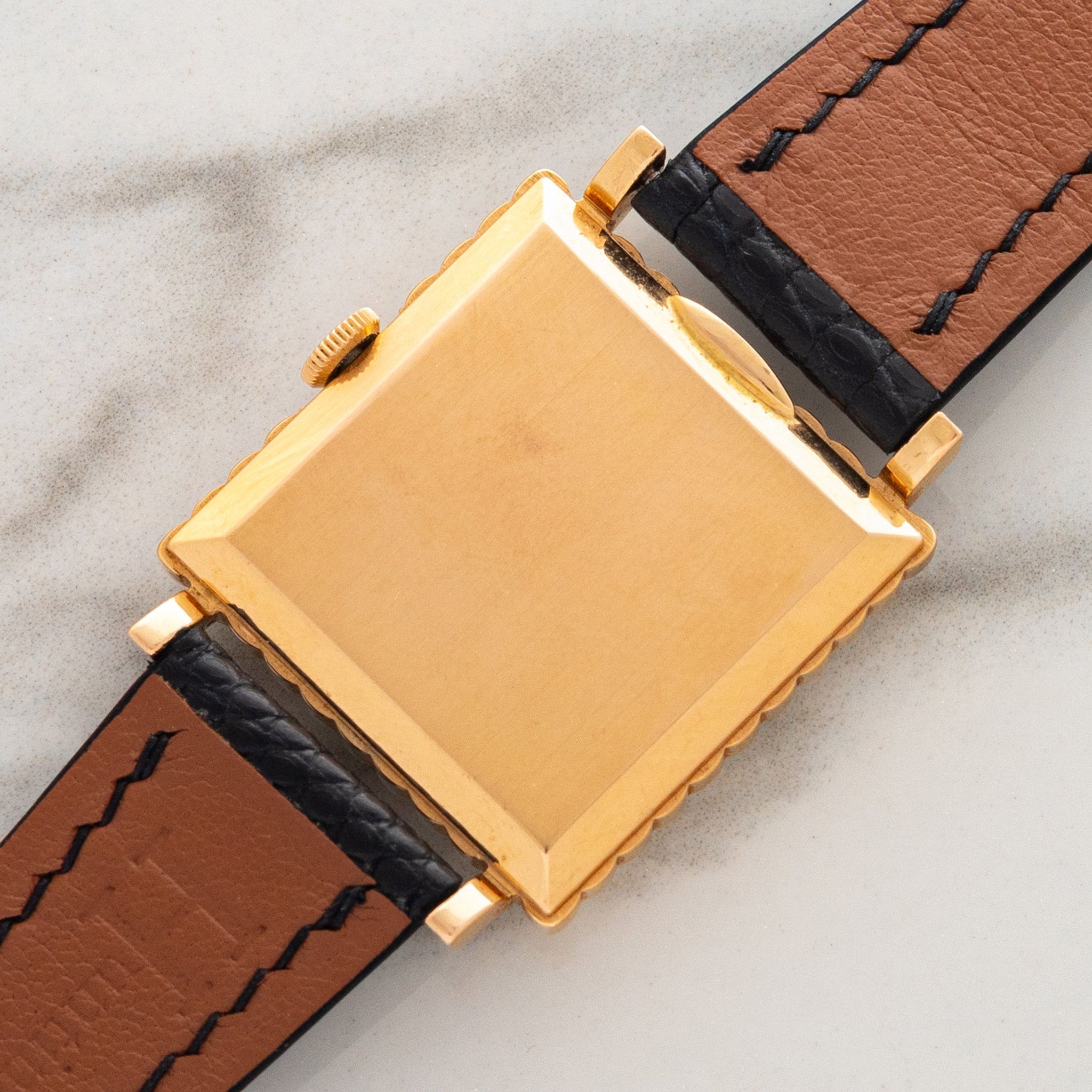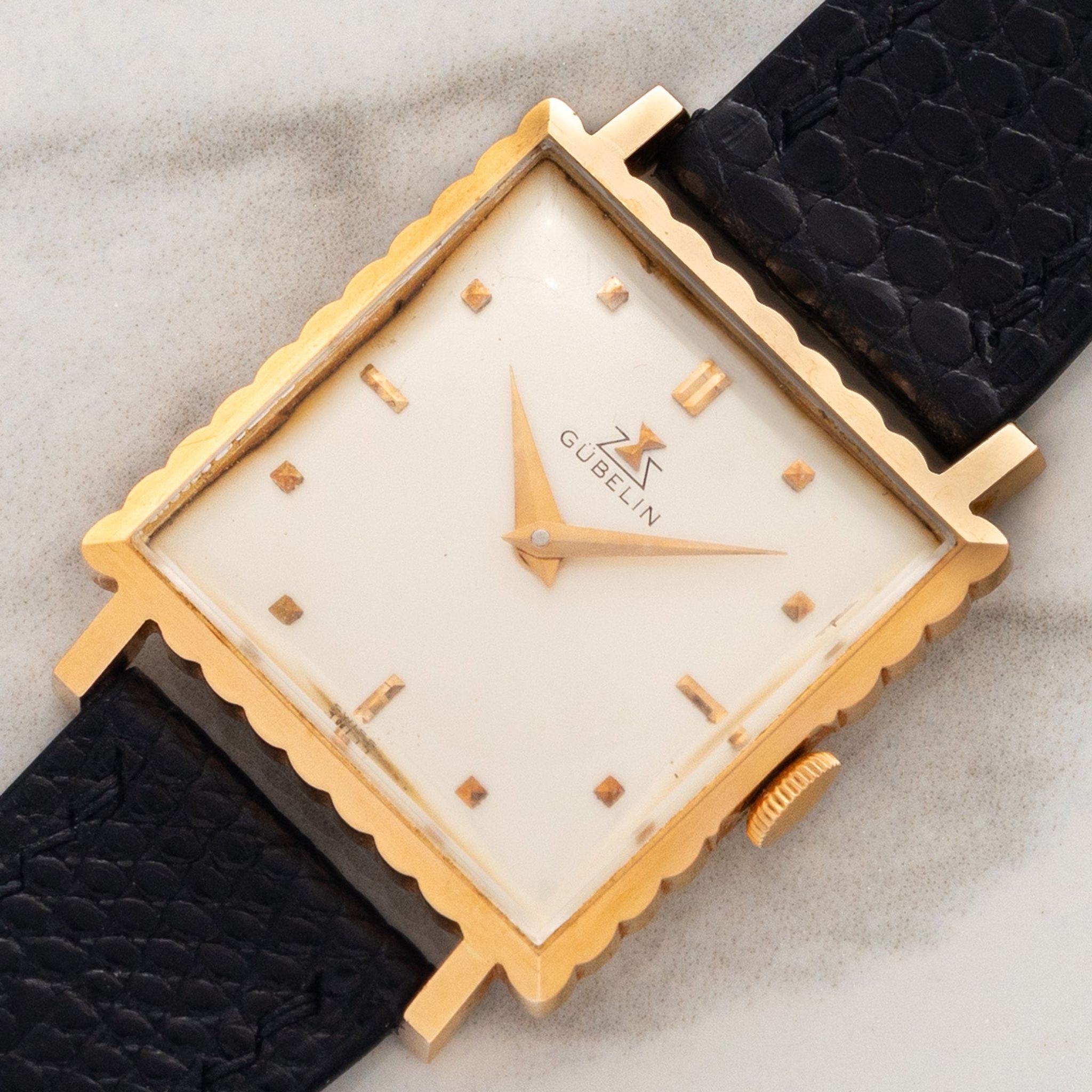 This particular dress piece on offer is circa 1950s, featuring a square shaped case in 18k pink gold. It boasts a unique scalloped pattern on its outer edge and the "ice cube" style crystal it houses screams mind century design. Notably, the dial also features geometric style markers for its logo and indices. For anyone looking for the charm of a "true vintage" dress watch at a good value in today's market, this Gübelin has excellent build quality and is perfect for the collector who enjoys venturing off the beaten path.