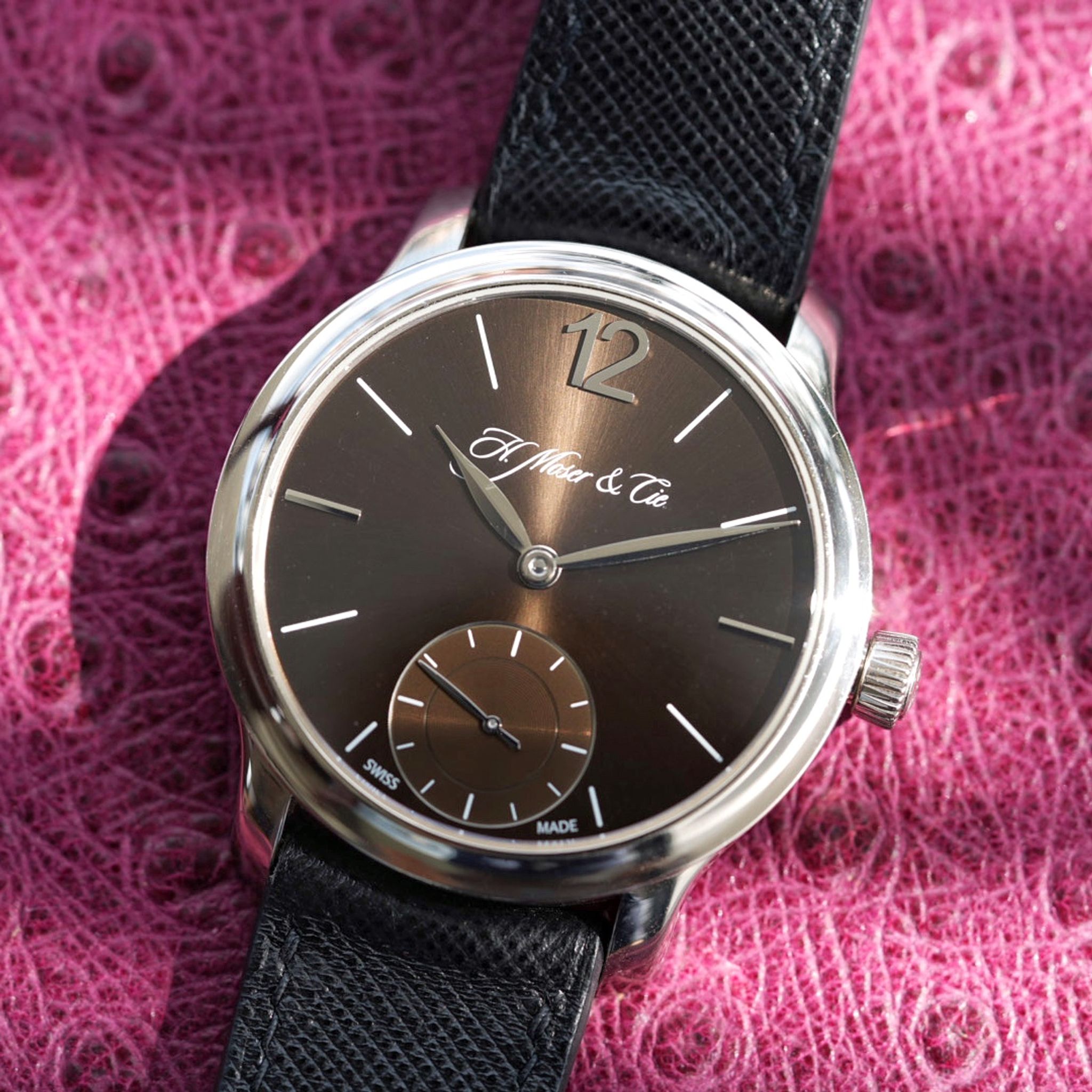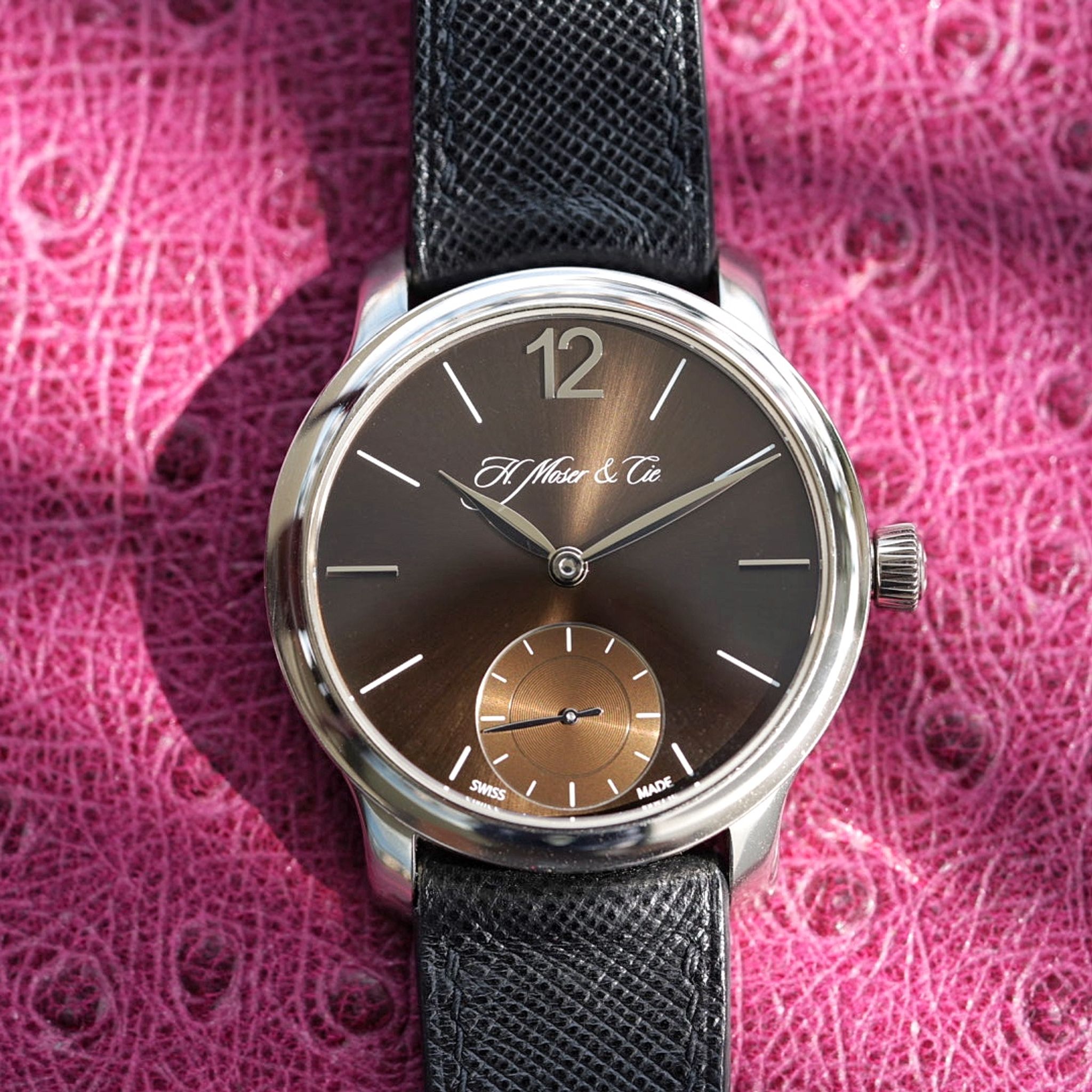 Initially introduced in 2014 as a tribute to H. Moser’s first wife Charlotte Mayu, this white gold HMC with a brown sunburst dial is an extremely versatile dress watch. At under 10mm thickness, and a lug to lug of 45.2mm, it fits most wrists very nicely and slides under the cuff.