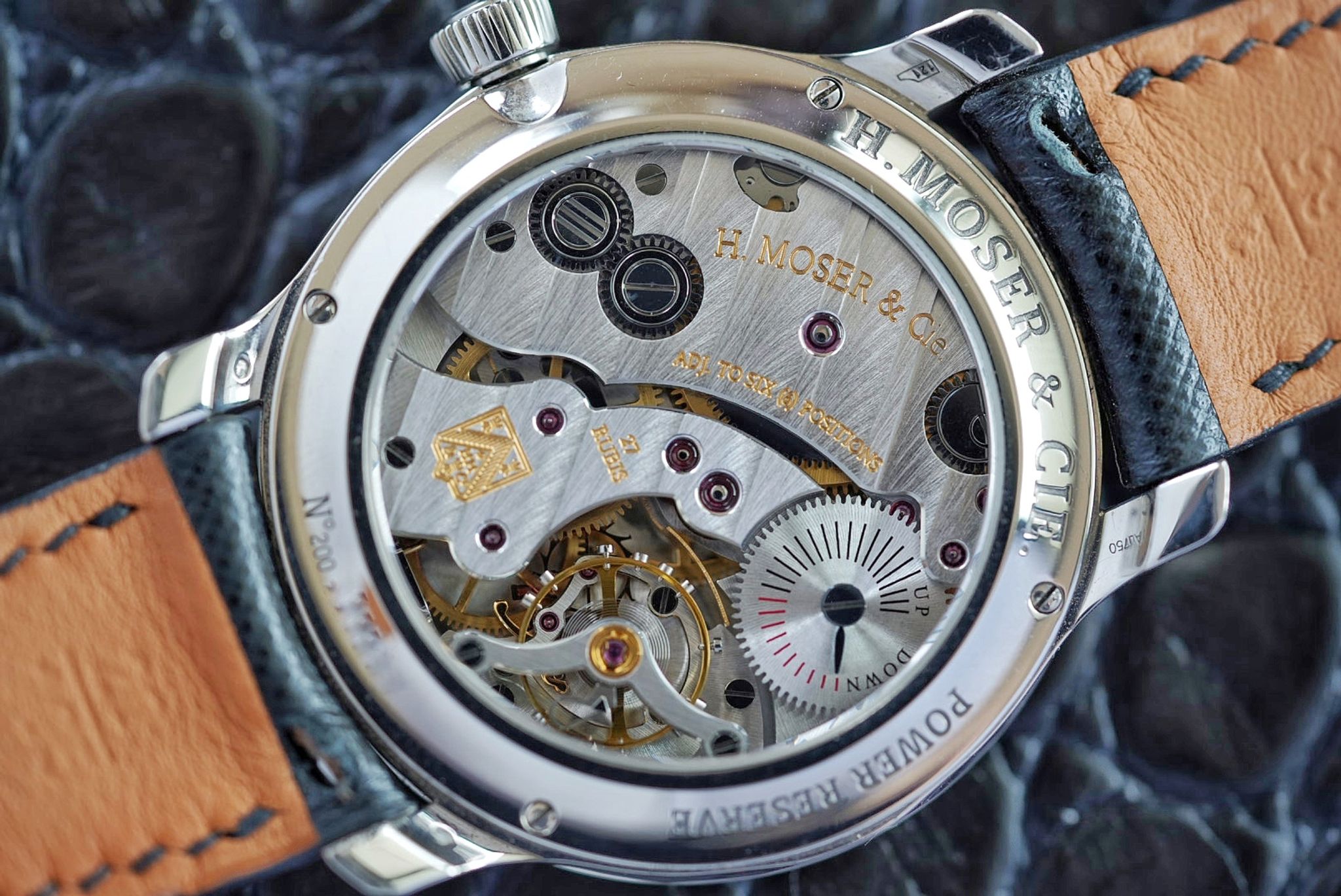 Flip behind and take in the HMC 321 movement, with a power reserve indicator containing a rotating disk underneath. The movement is impeccably finished in-house, with black polished screw heads and a solid gold balance wheel and pallet fork. At slightly above $10k, it represents tremendous value in today’s market.