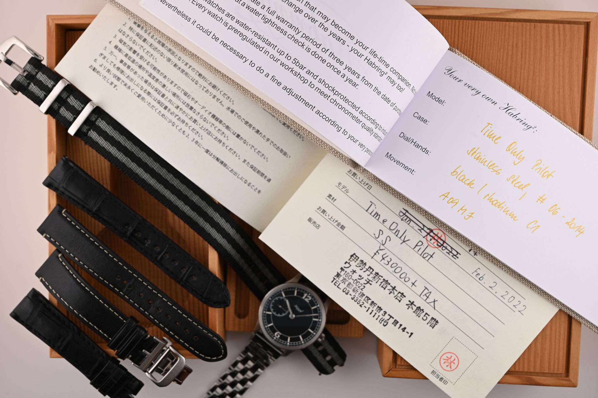 Includes: The original wooden box, the original NATO strap, signed croc strap, generic black leather strap with generic butterfly clasp, and generic straight end link bracelet with butterfly clasp, booklet, and papers from Shellman Ginza.
