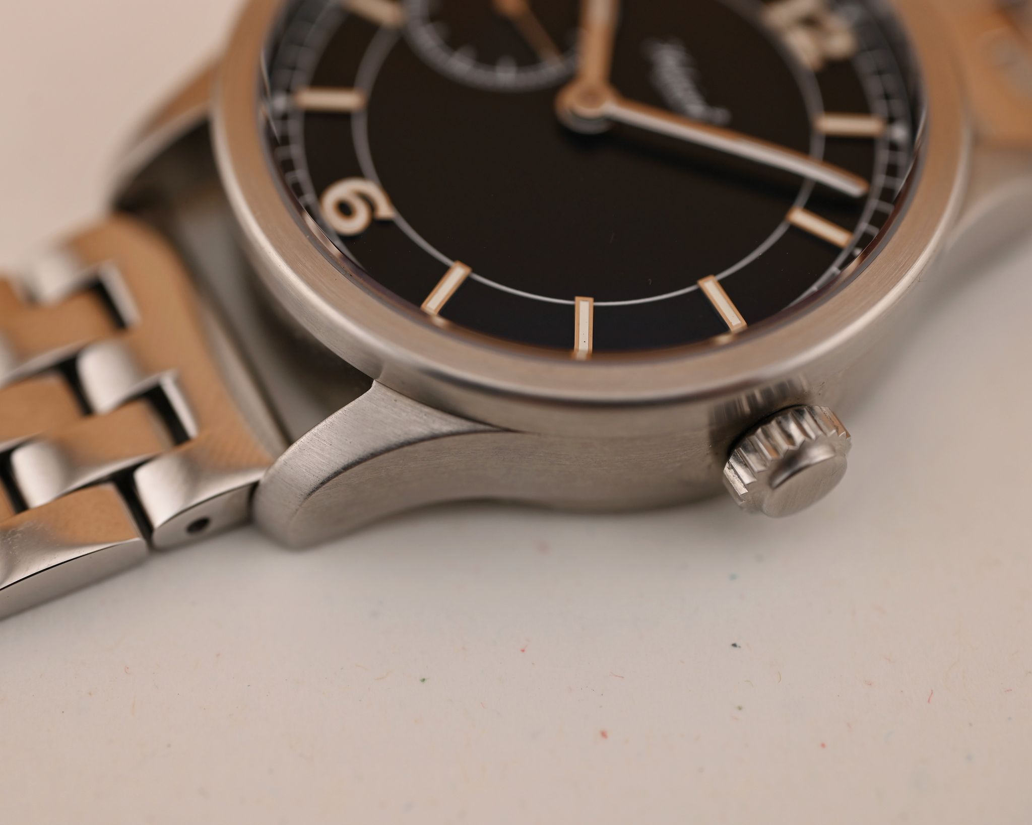 Case: The 36 × 44 × 10.8 mm stainless steel case is satin brushed throughout in a very similar shape and manner to the (excellent) IWC pilot’s watches of the 1990’s. The case is free from any notable scratches or dents and wears very well. I particularly like the shape and feel of the large crown.