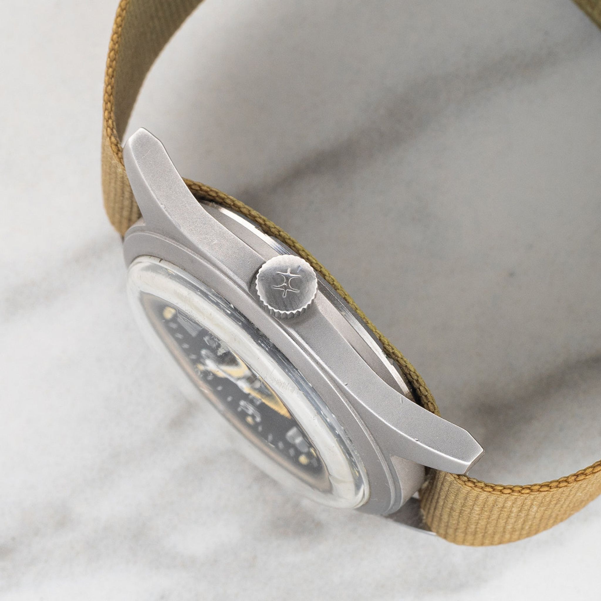 This particular example on offer is co-branded with Avirex winged logo. Avirex was founded by pilot Jeff Clyman in 1975. The brand began by selling U.S. Government surplus pilot jackets and similar to brand like L.L. Bean and Orvis offered mail order catalogs. The Avirex Hamilton is a rare bird today and this piece happens to be in fantastic vintage condition with a nicely patina'd dial/hands. Offered with its correct strap, box, bag and booklet, this is a collector set not to be missed.