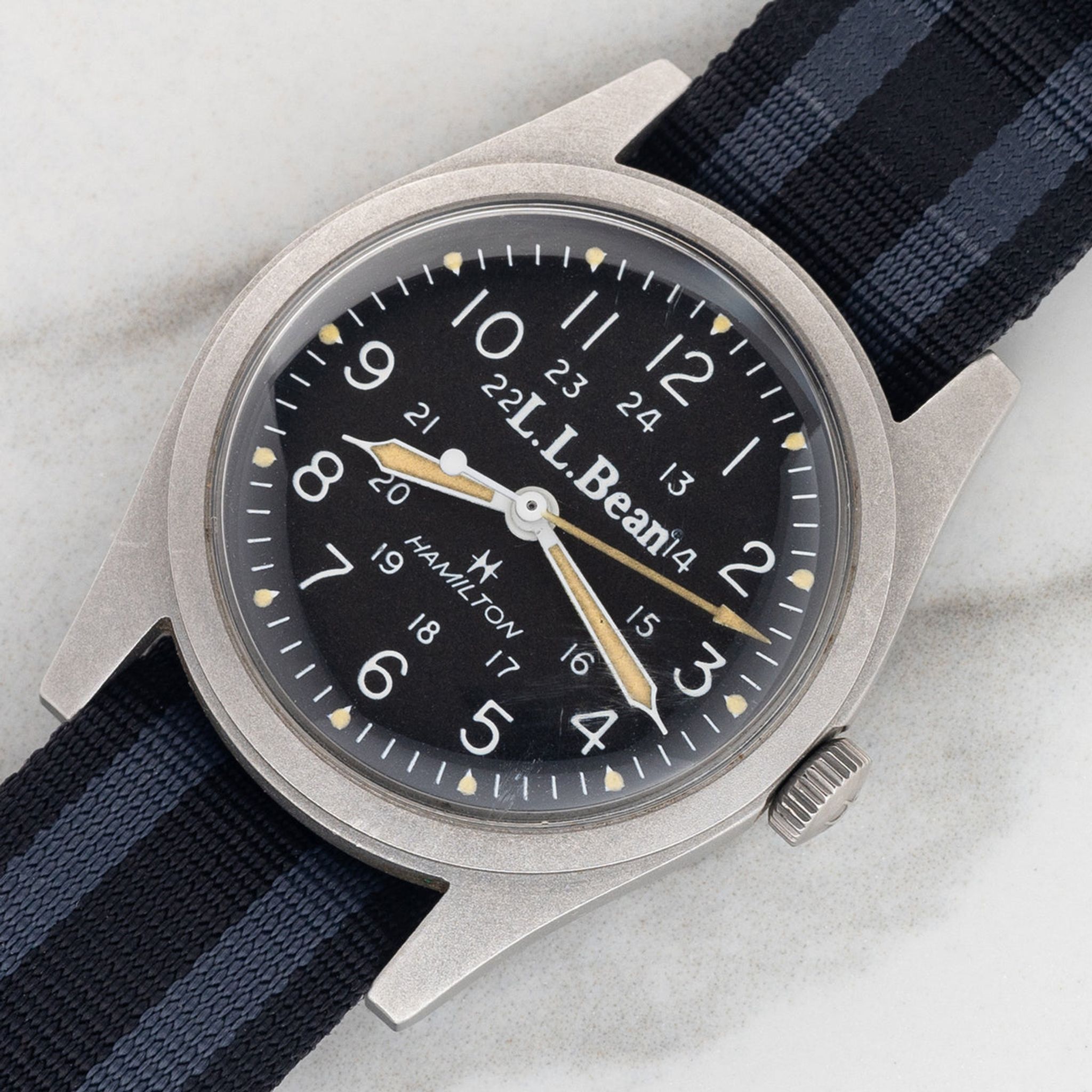 By the 1980s there was a clear demand for a civilian model which Hamilton answered with the release of the "Khaki" field watch collection. These models had only few changes from their military siblings, achieving great popularity for their simple and "no frills" design language and robust ETA movements. Eventually, Hamilton would go on to release some co-signed dials with notable outfitters from L.L. Bean, Orvis, REI and more. We've long believed these are special pieces of horological Americana, given their double signatures. One might even call the L.L. Bean "the Tiffany & Co of Maine."