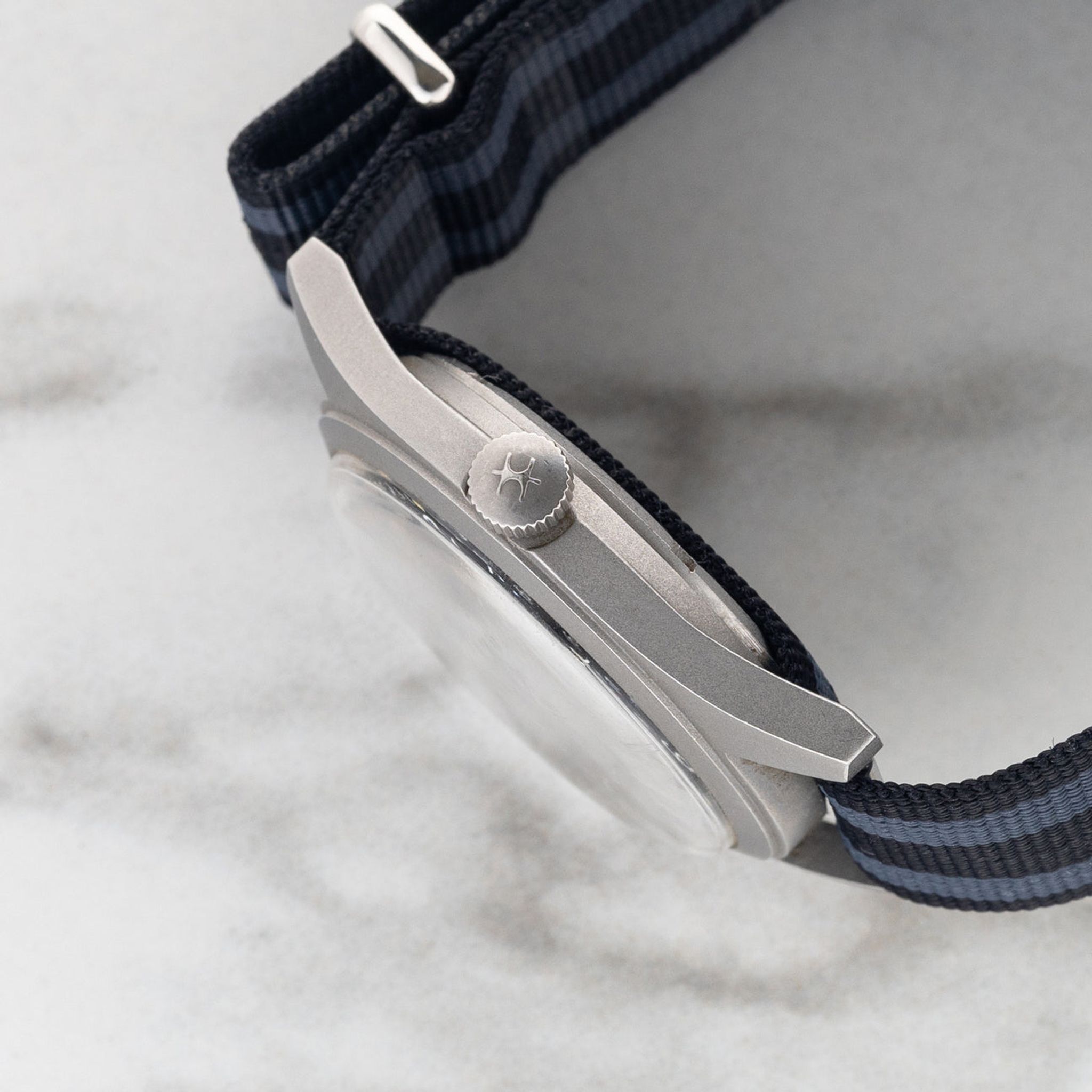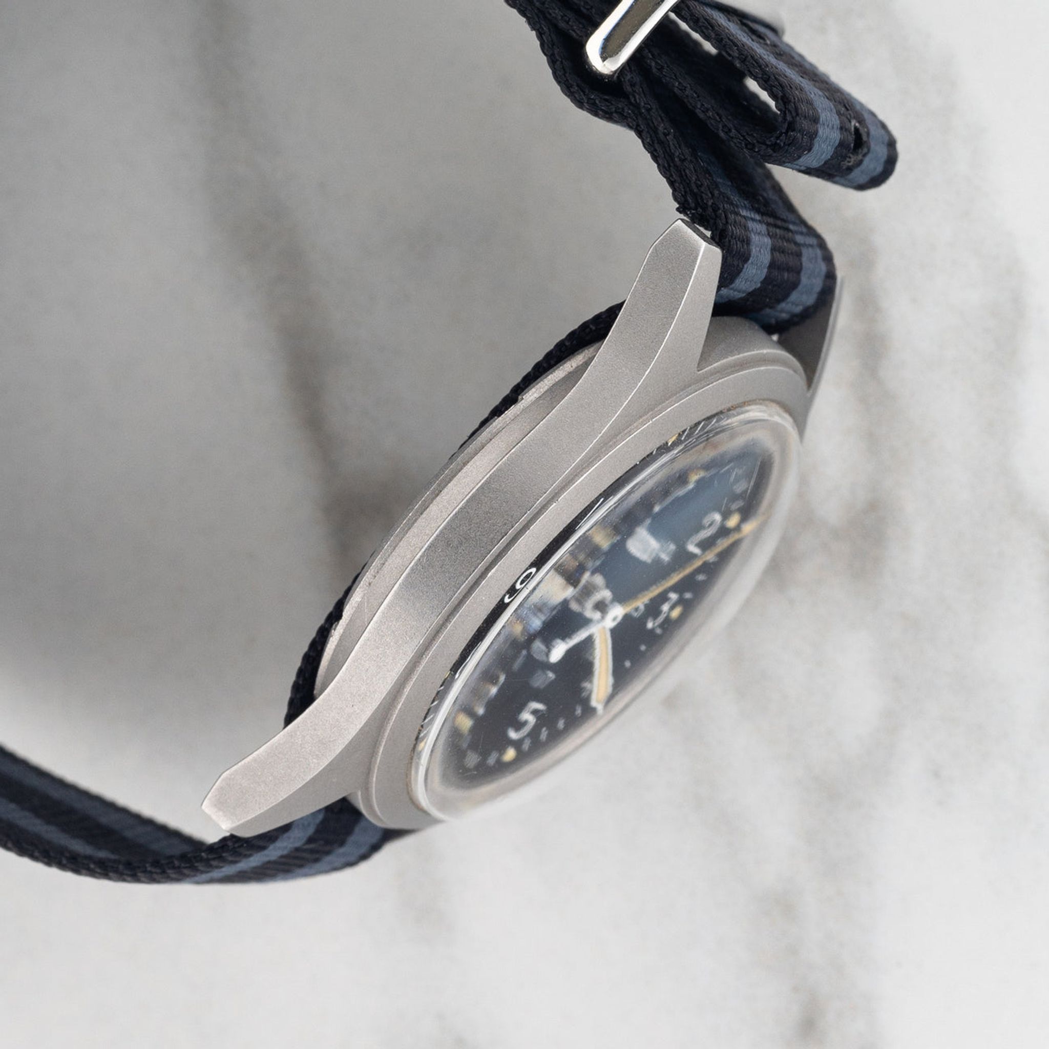 This example features spring bars as opposed to fixed bars so it is possible to potentially mount on a leather or canvas strap if needed. It has remained in excellent vintage condition with a nicely preserved dial/hands showing warm tritium patina. We've paired it with a discontinued Phoenix NATO-style strap so it’s ready to the next adventure.