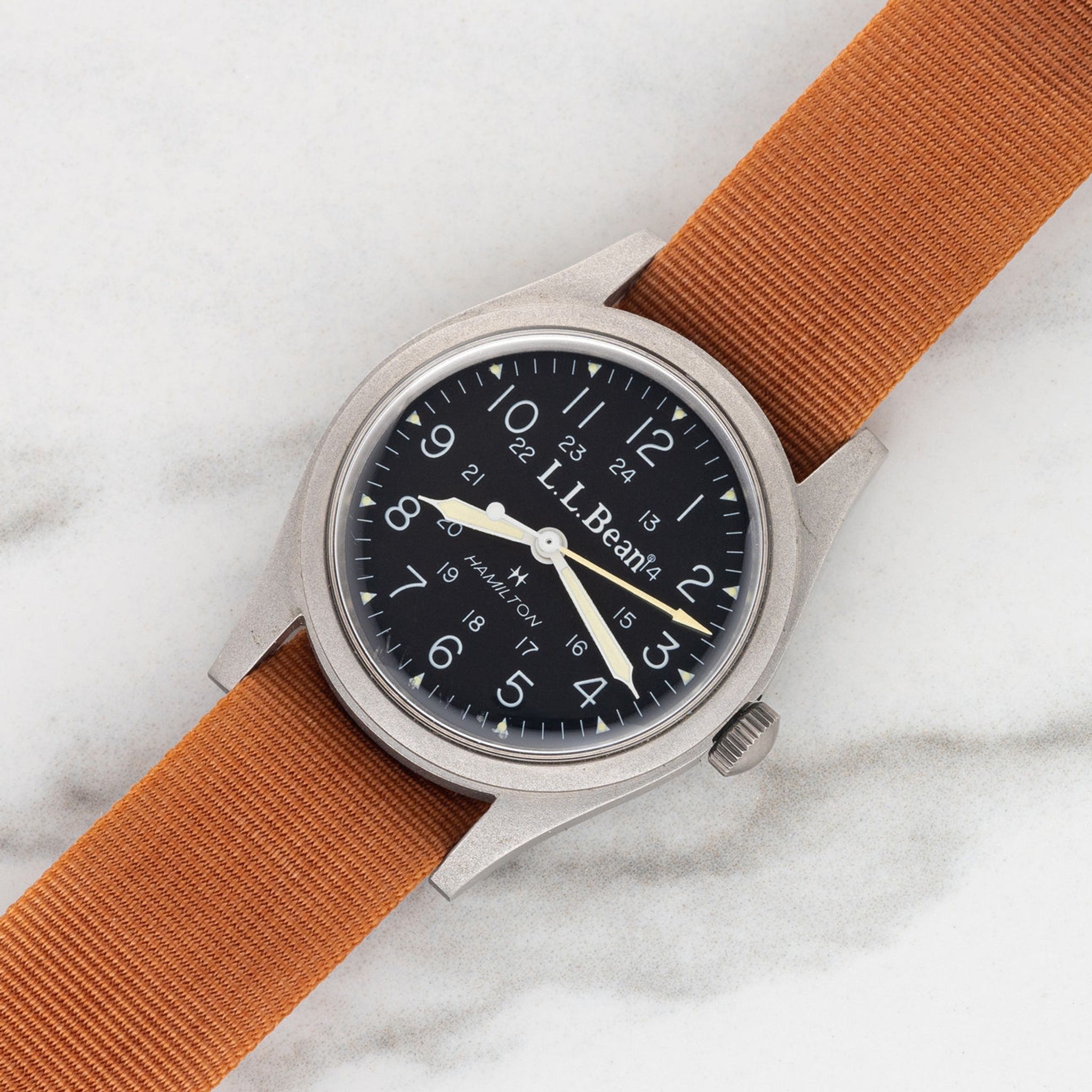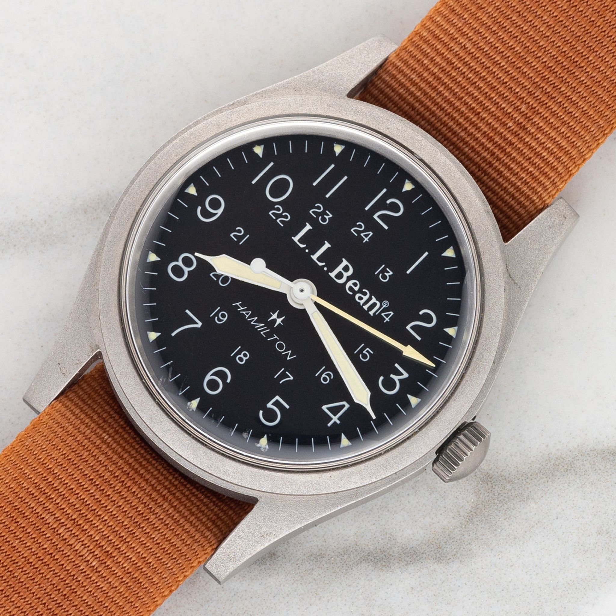 By the 1980s there was a clear demand for a civilian model which Hamilton answered with the release of the "Khaki" field watch collection. These models had only few changes from their military siblings, achieving great popularity for their simple and "no frills" design language and robust ETA movements. Eventually, Hamilton would go on to release some co-signed dials with notable outfitters from L.L. Bean, Orvis, REI and more. We've long believed these are special pieces of horological Americana, given their double signatures. One might even call the L.L. Bean "the Tiffany & Co of Maine."