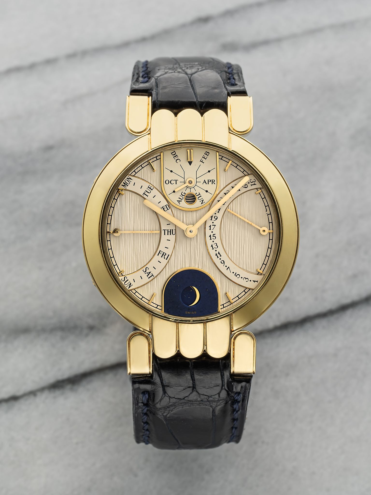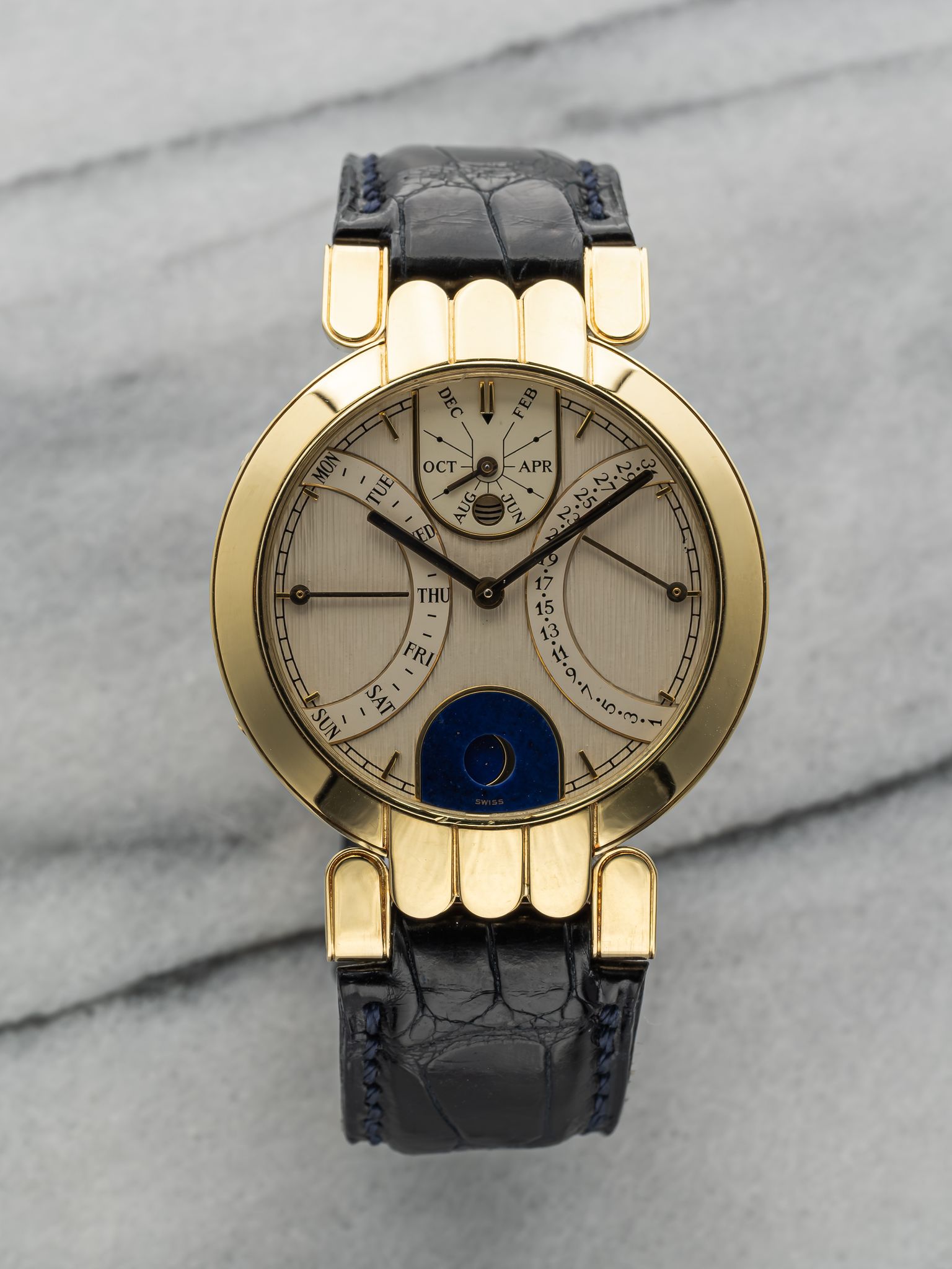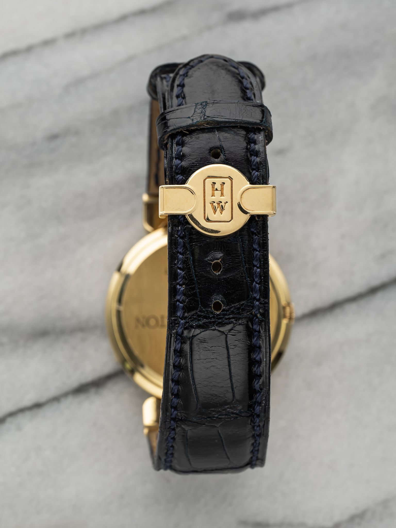 Here's a vintage Harry Winston Bi-Retrograde Perepetual Calender First Series with a white dial in 18K Yellow Gold from the 1990s. Measurements include a 37mm case and an integrated leather strap. On its original dark blackish blue leather strap and signed gold deployant buckle. Functions include the day, date, month, and moonphase. Lapis stone at 6 a clock. Comes with its original box and solar powered watch winder. All parts including the crown, dial, movement, and caseback are original.