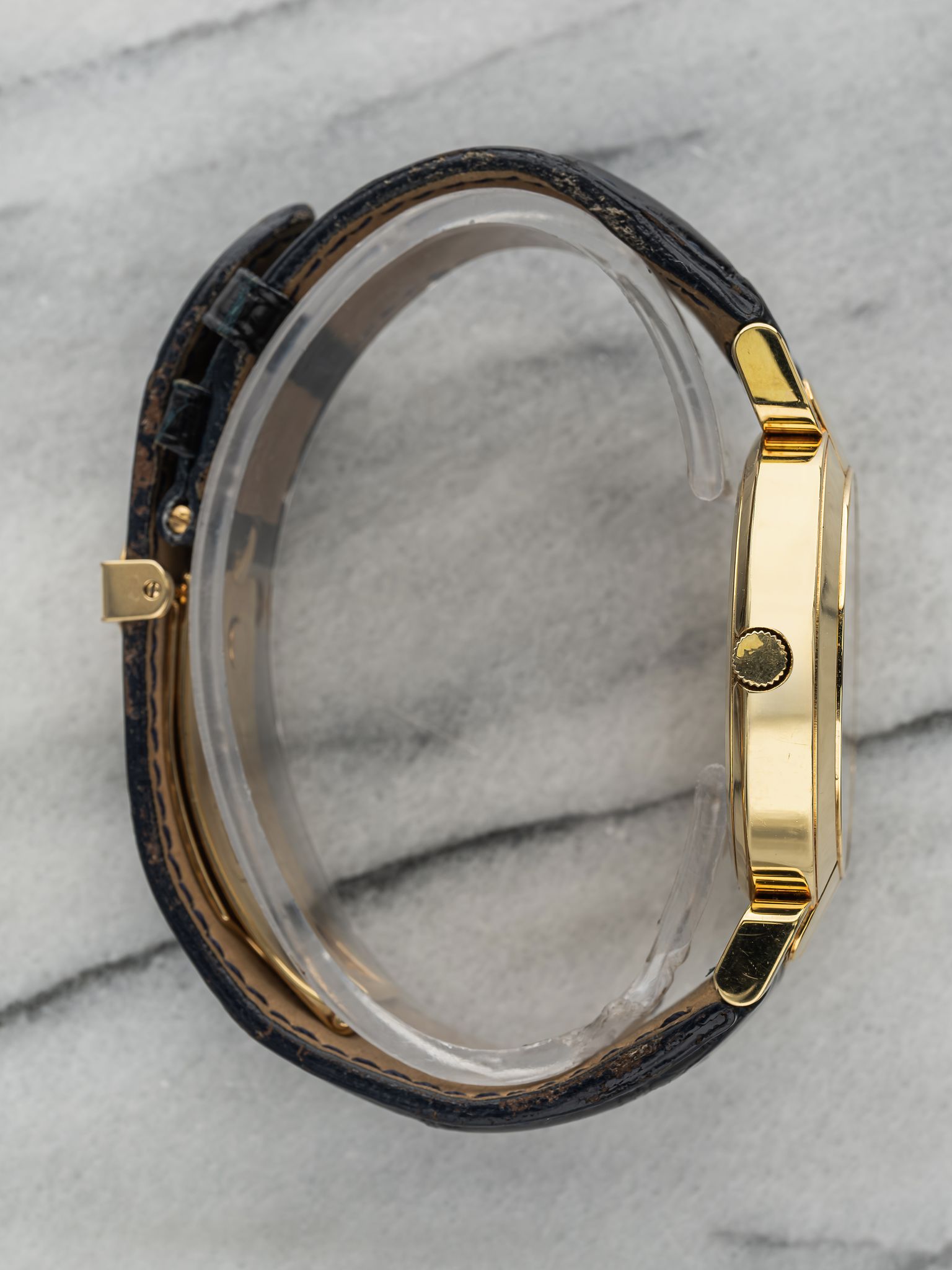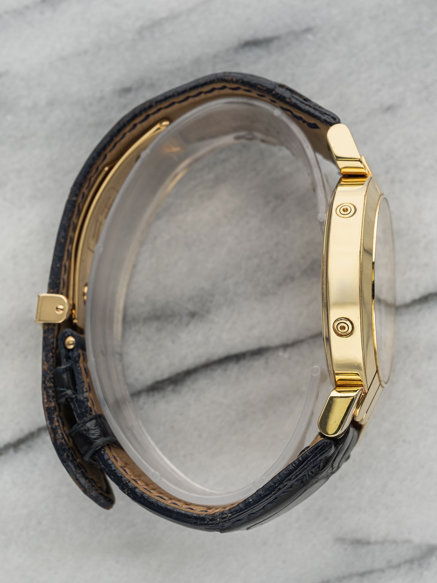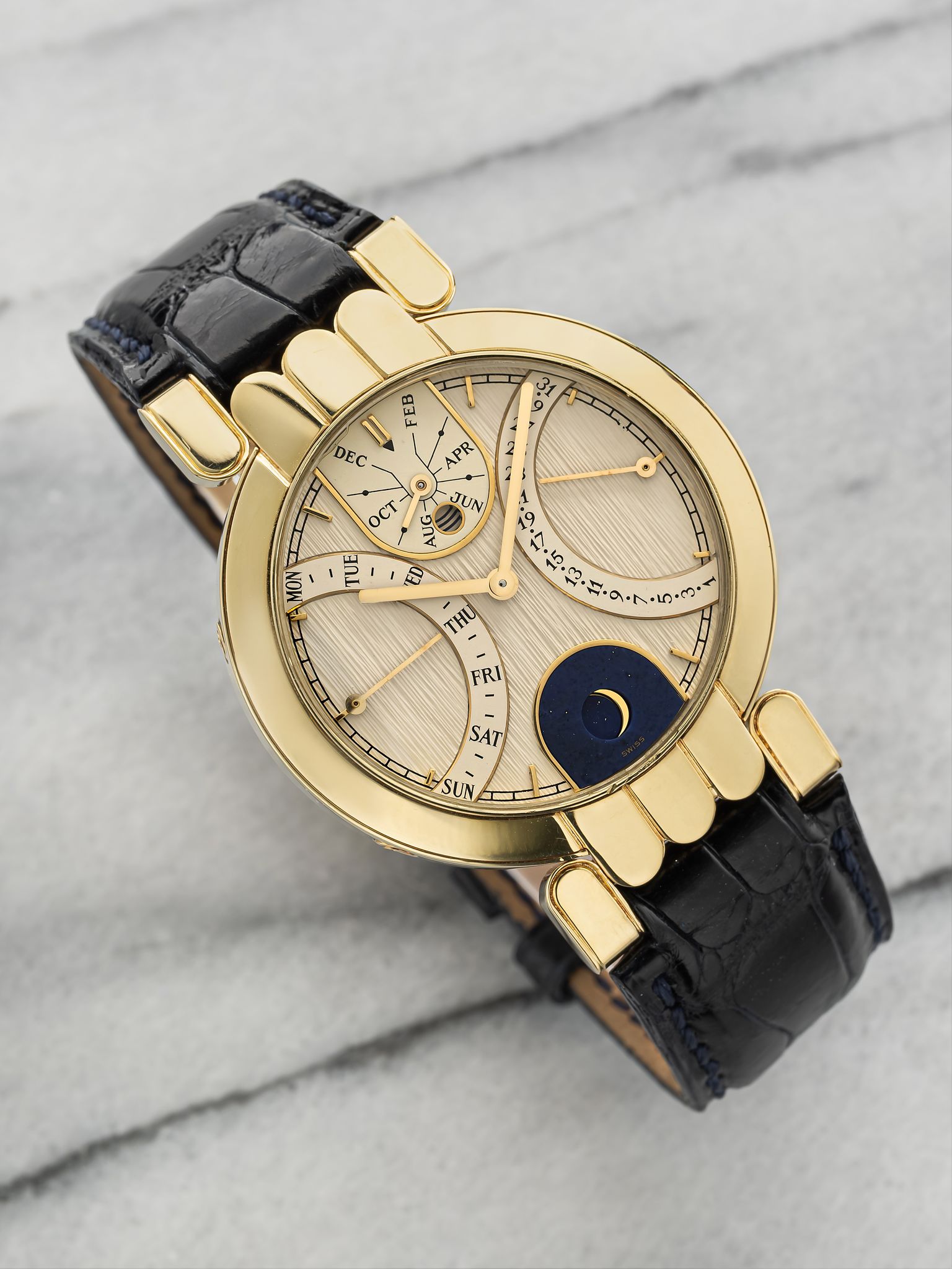 Here's a vintage Harry Winston Bi-Retrograde Perepetual Calender First Series with a white dial in 18K Yellow Gold from the 1990s. Measurements include a 37mm case and an integrated leather strap. On its original dark blackish blue leather strap and signed gold deployant buckle. Functions include the day, date, month, and moonphase. Lapis stone at 6 a clock. Comes with its original box and solar powered watch winder. All parts including the crown, dial, movement, and caseback are original.