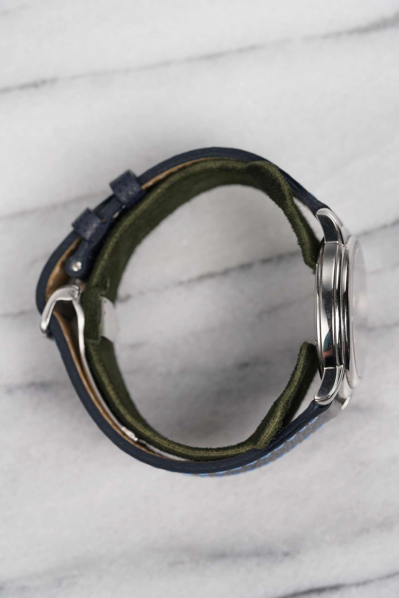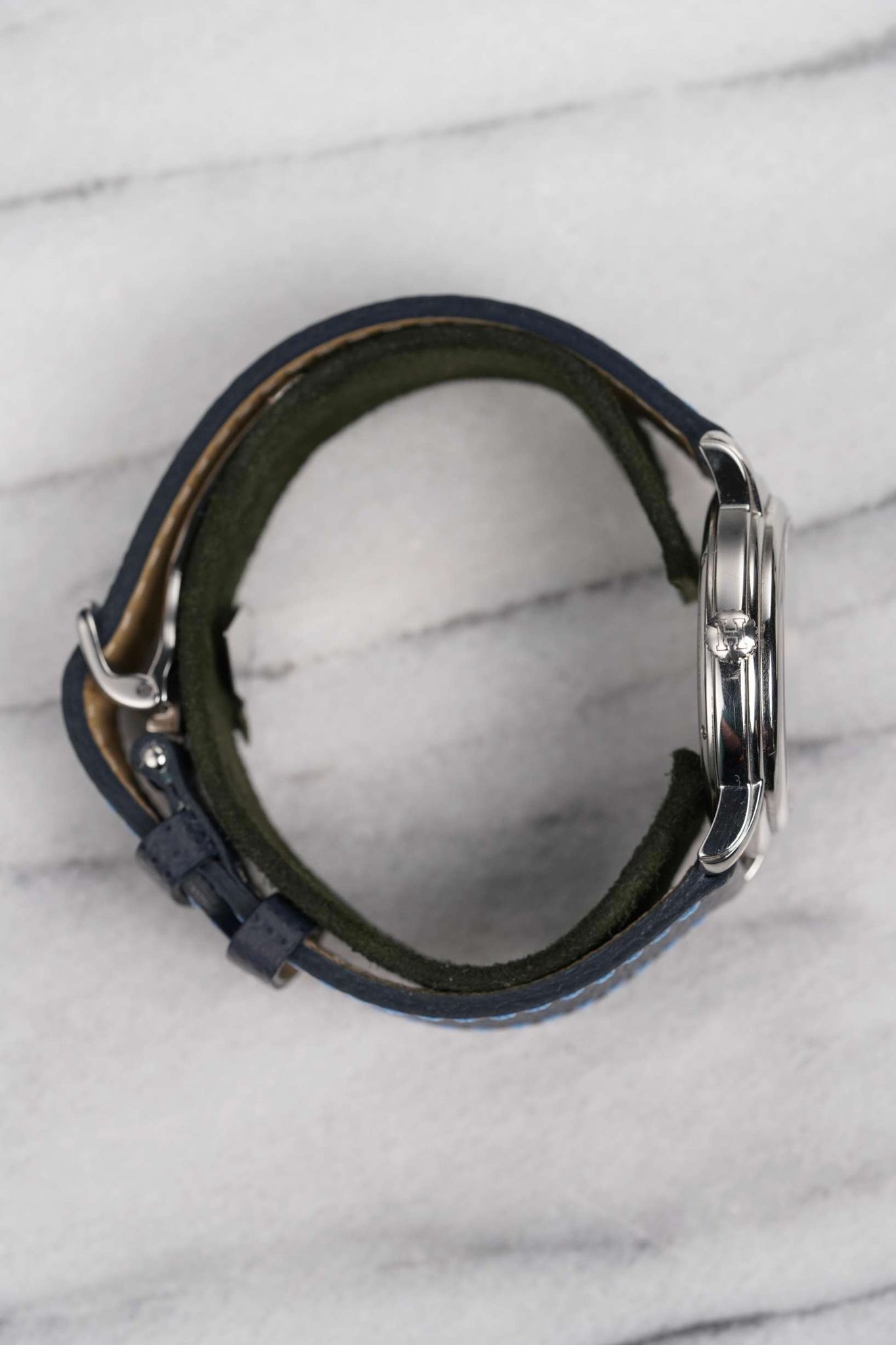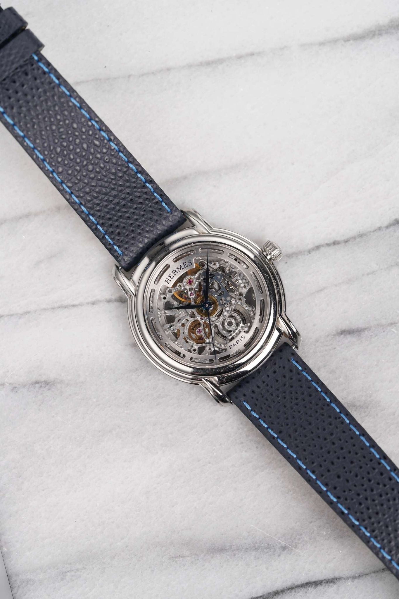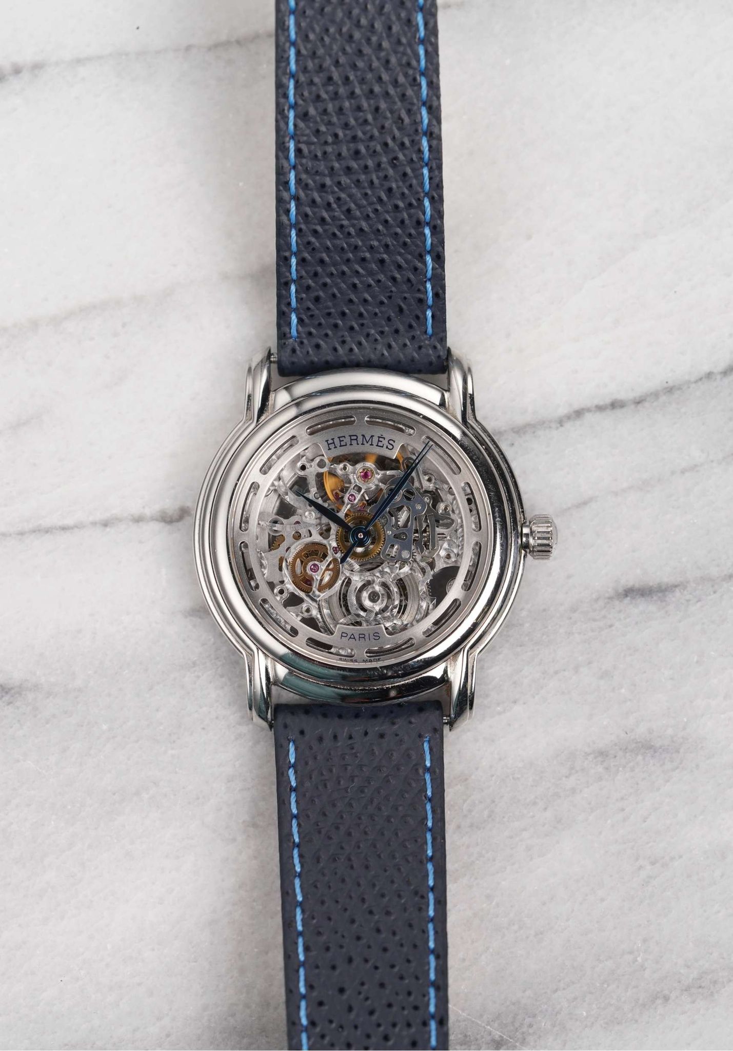 Here's a Hermes Paris Skeleton reference SM1-790 Squelette with a skeleton dial in stainless steel from the 2000s. Keeps great time and is fully functional. Measurements include a 35mm case size across and an 18mm lug width. On an aftermarket blue pebble textured leather strap with its original steel deployant. Blued hands. Stainless steel case and bracelet. The piece is unisex, it can be worn by both men and women. Clear exhibition case back. All parts are original including the dial, case, and movement. the dial and case are in great cosmetic, untouched condition
