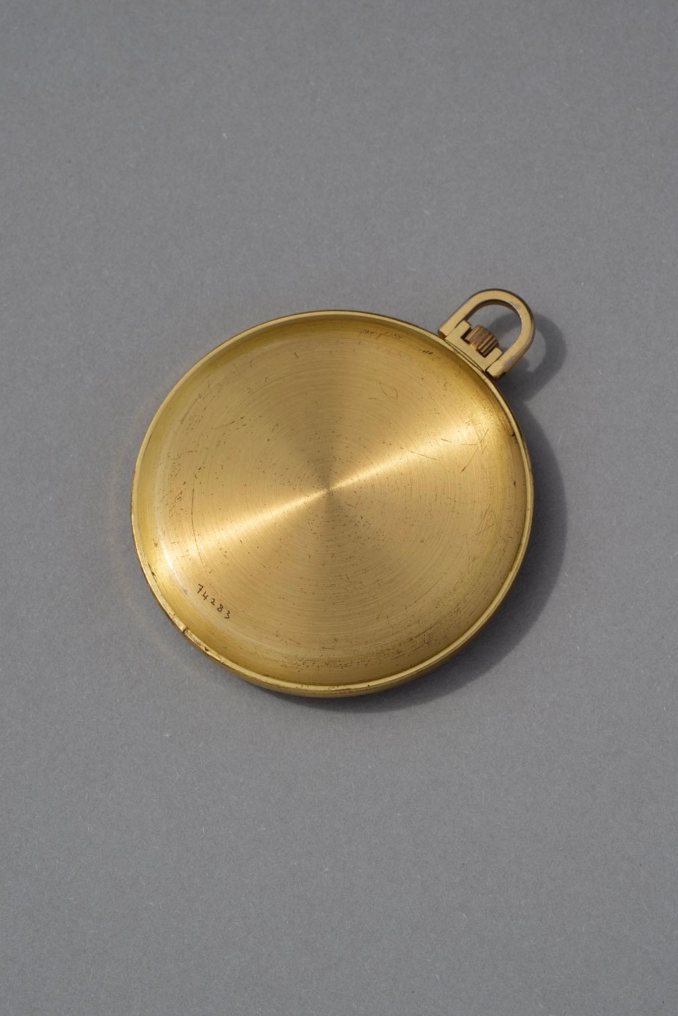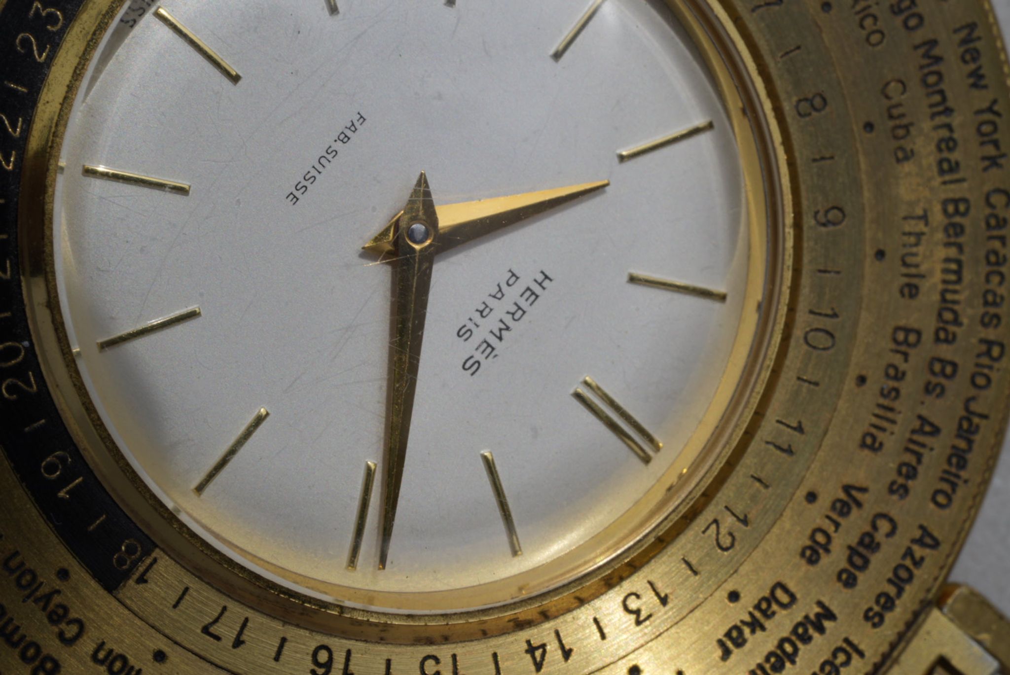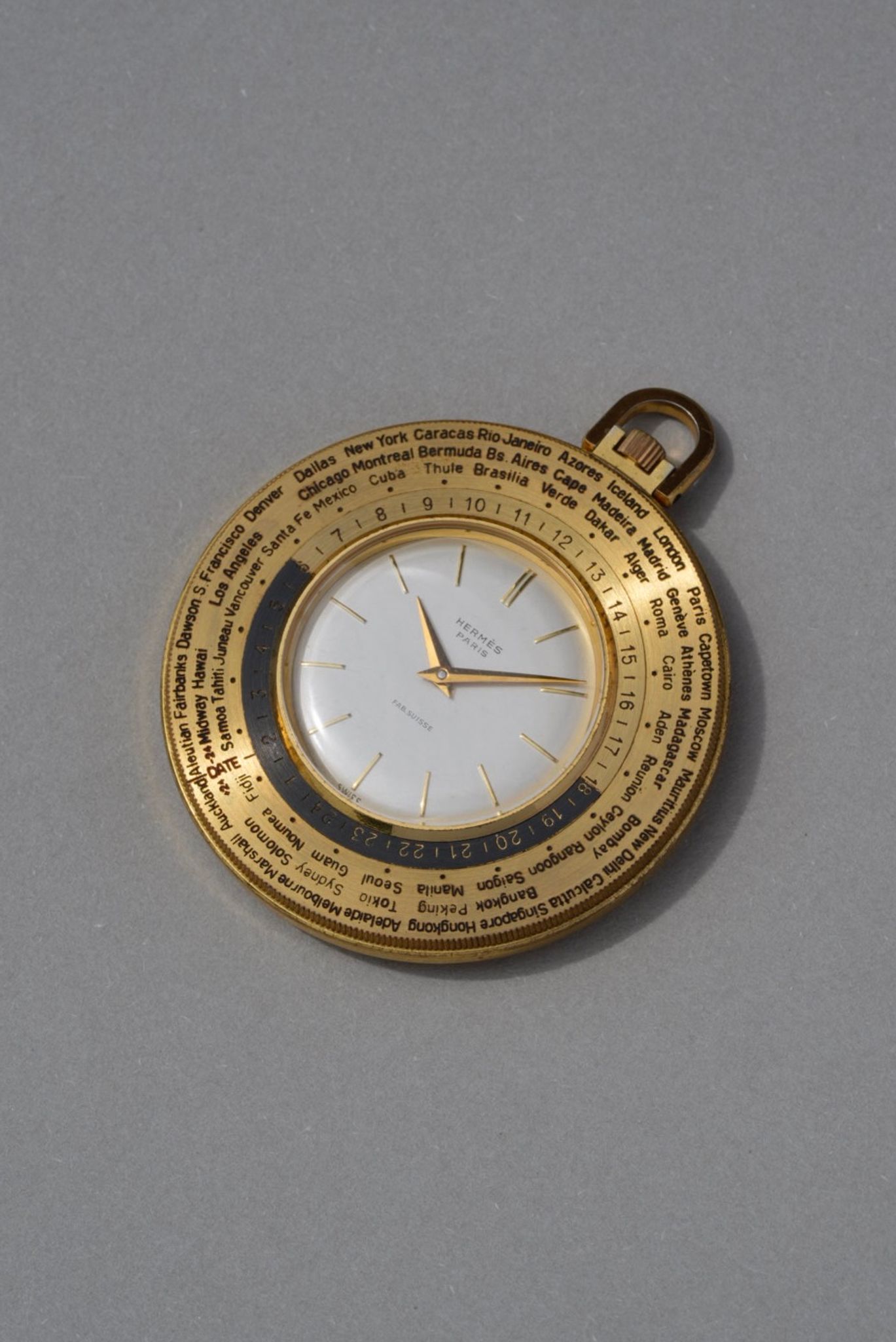 Hermès, world time pocket watch circa 1960, featuring a gilt brass case measuring 52 mm with a snap-on back. The bezel displays the names of world cities and an inner 24-hour chapter ring, allowing the indication of time across different time zones. The silvered satin dial is signed “Hermès Paris” and “Fab. Suisse,” with gilt baton hour markers and matching hands. The watch is fitted with a plastic crystal and a rotating bezel. It is powered by a manual winding movement.