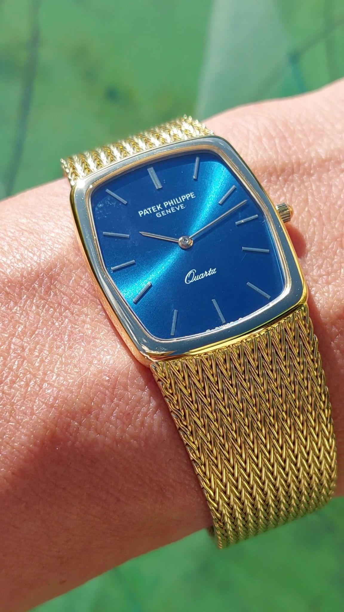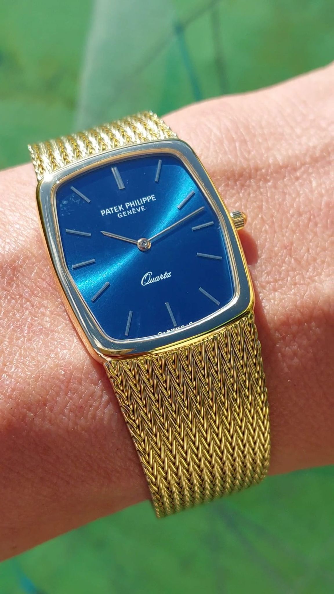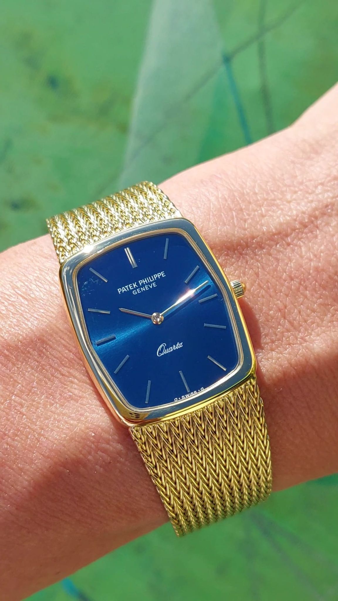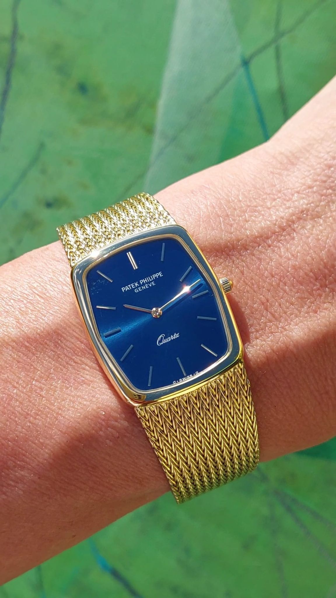 Elegant vintage '80s Patek Ellipse: hexagonal and with the finest integrated bracelet (fitting a >190mm-wrist). And it is QUARTZ, yes. And it says so boldly on the dial, yes. And why not? At the moment after Watches & Wonders 2024 there is simply nothing more avant-garde than Patek-Quartz: We were surprised to see the presentation of the new ref5269 this year coming with a quartz-movement -- but yes, it is a surprising but it is a correct and surprisingly good and brave move by the reference brand in horology: to offer a low-maintenance, hassle free, always running and always precise sporty daily wearer for the conservative mind that values punctuality on the spot.