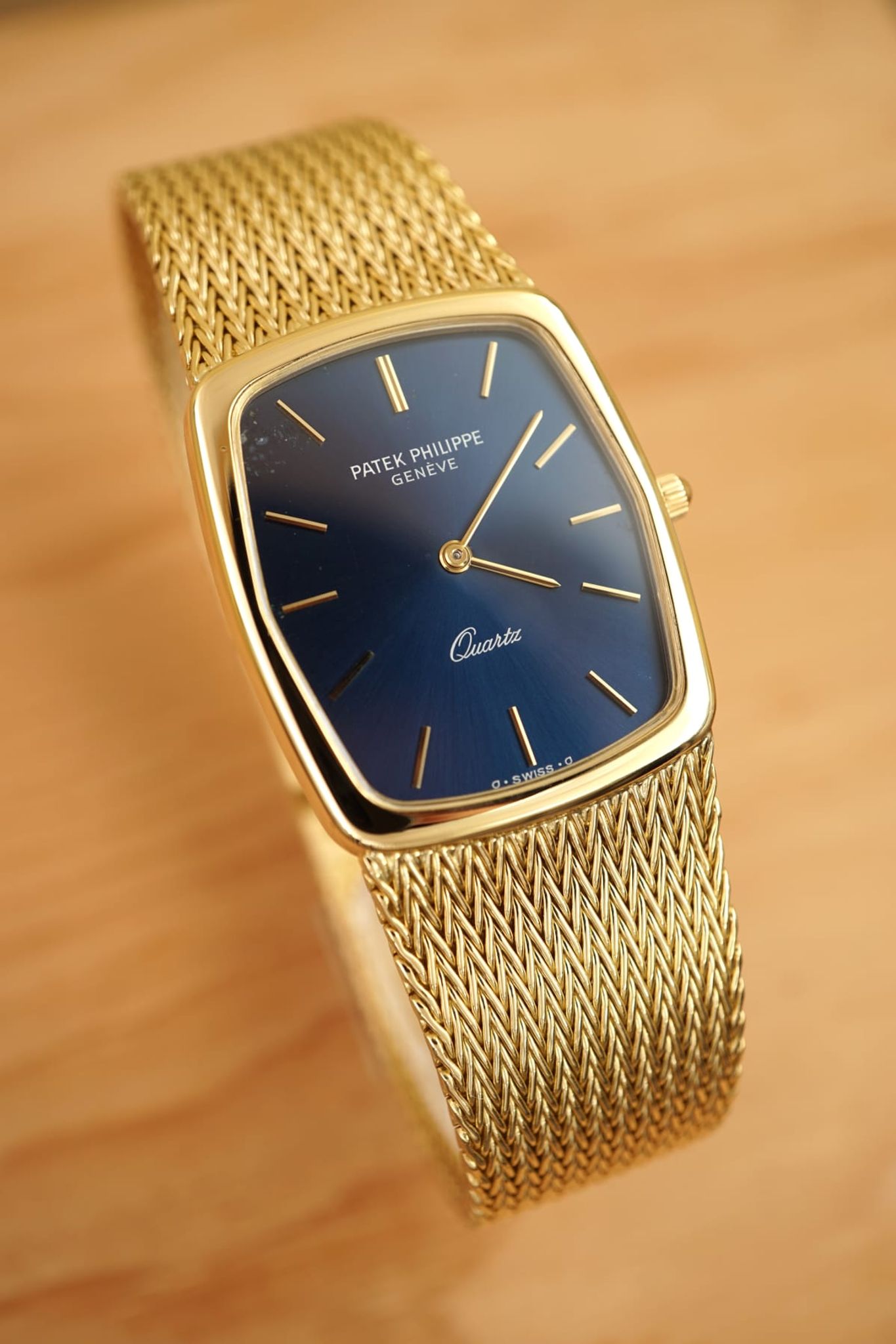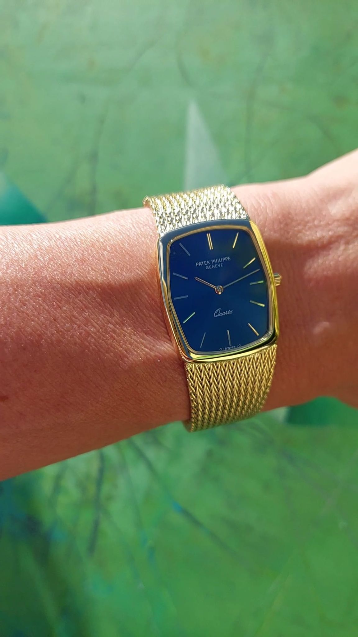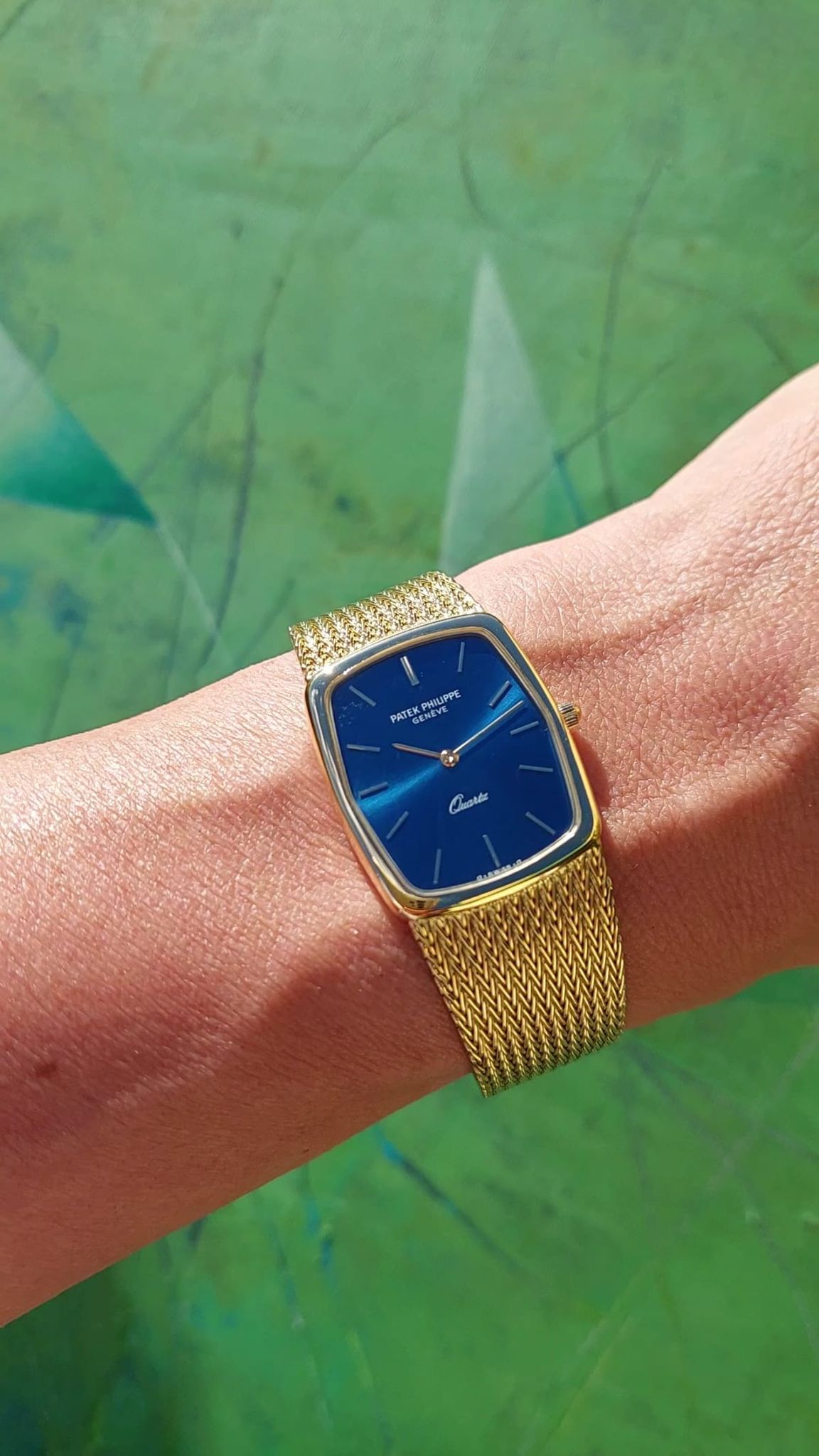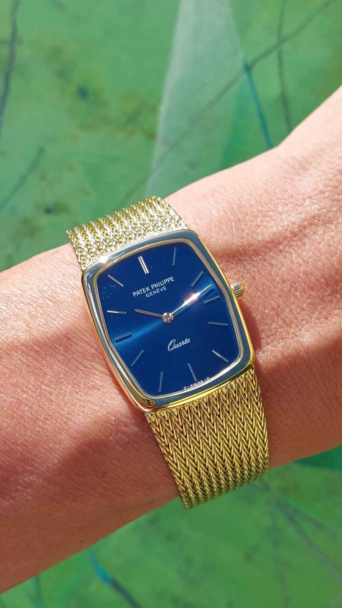 Elegant vintage '80s Patek Ellipse: hexagonal and with the finest integrated bracelet (fitting a >190mm-wrist). And it is QUARTZ, yes. And it says so boldly on the dial, yes. And why not? At the moment after Watches & Wonders 2024 there is simply nothing more avant-garde than Patek-Quartz: We were surprised to see the presentation of the new ref5269 this year coming with a quartz-movement -- but yes, it is a surprising but it is a correct and surprisingly good and brave move by the reference brand in horology: to offer a low-maintenance, hassle free, always running and always precise sporty daily wearer for the conservative mind that values punctuality on the spot.